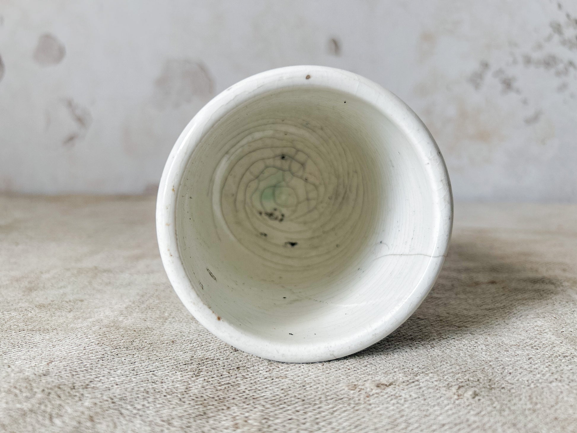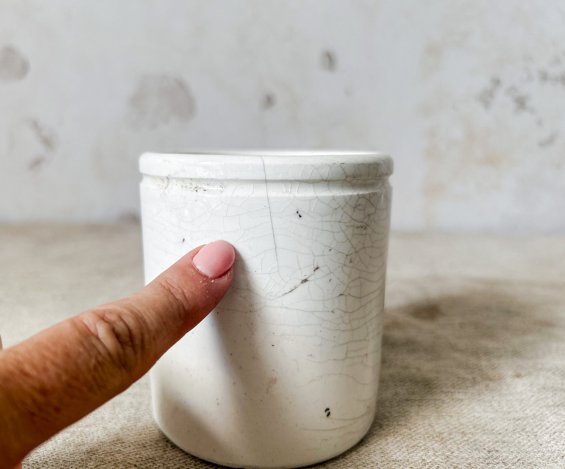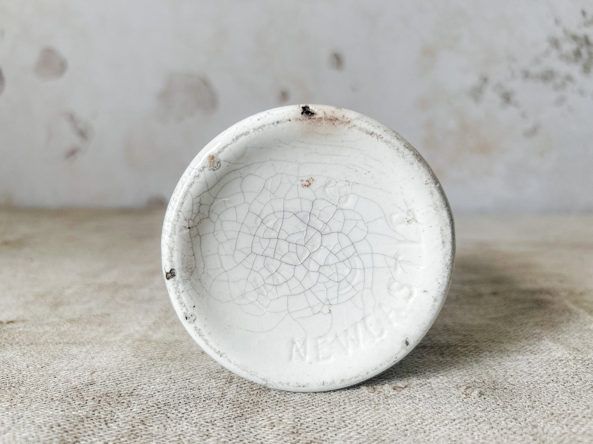 Available is an antique marmalade pot produced by James Keiller & Sons. The laurel wreath design and monograms date this piece to between 1874-1898. The size is the more unusual short "chubby" 1 lb. size.
