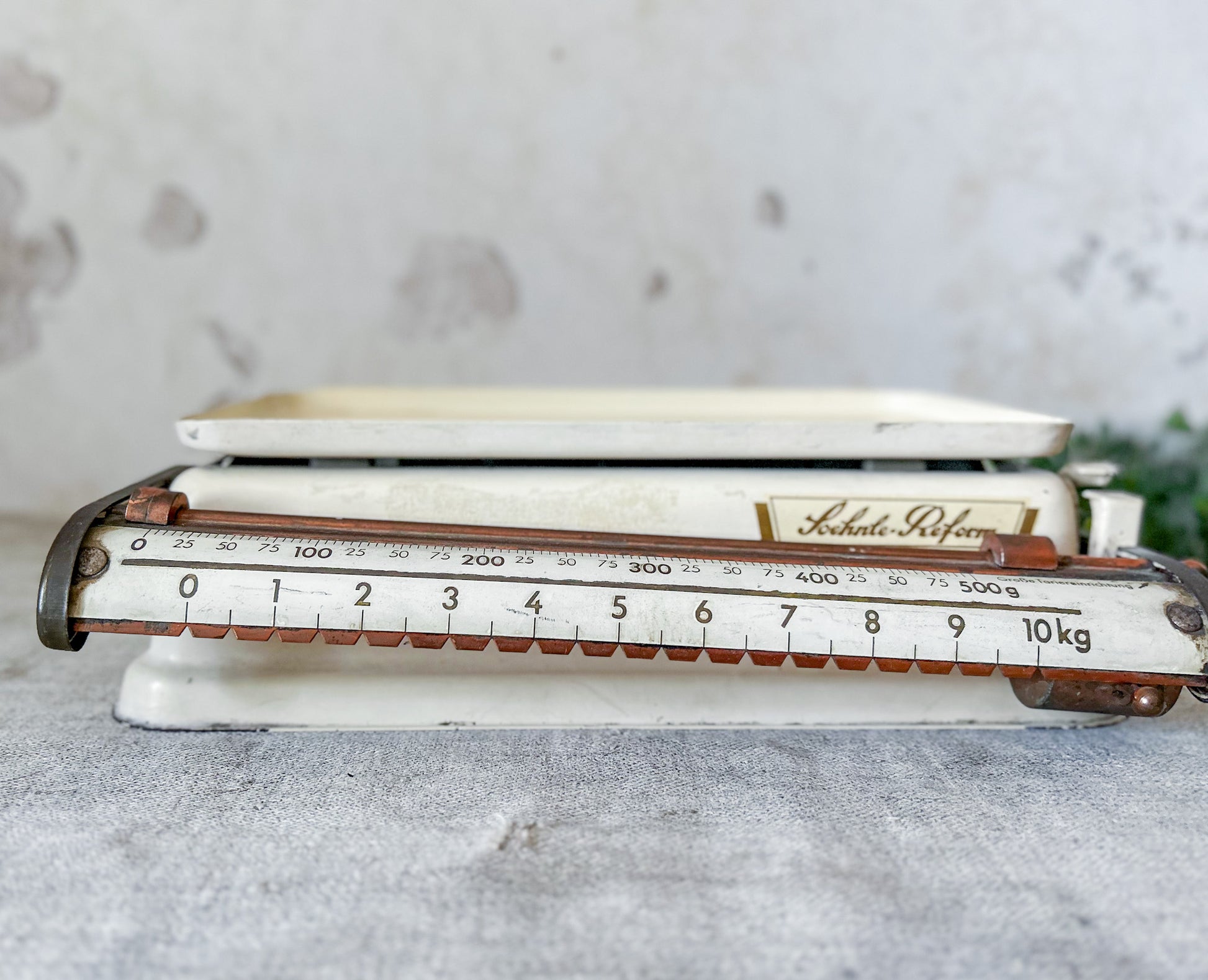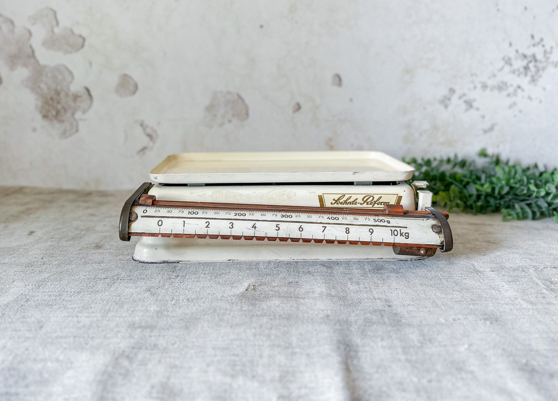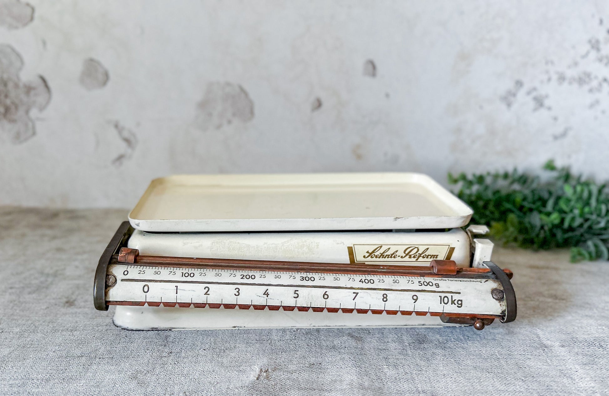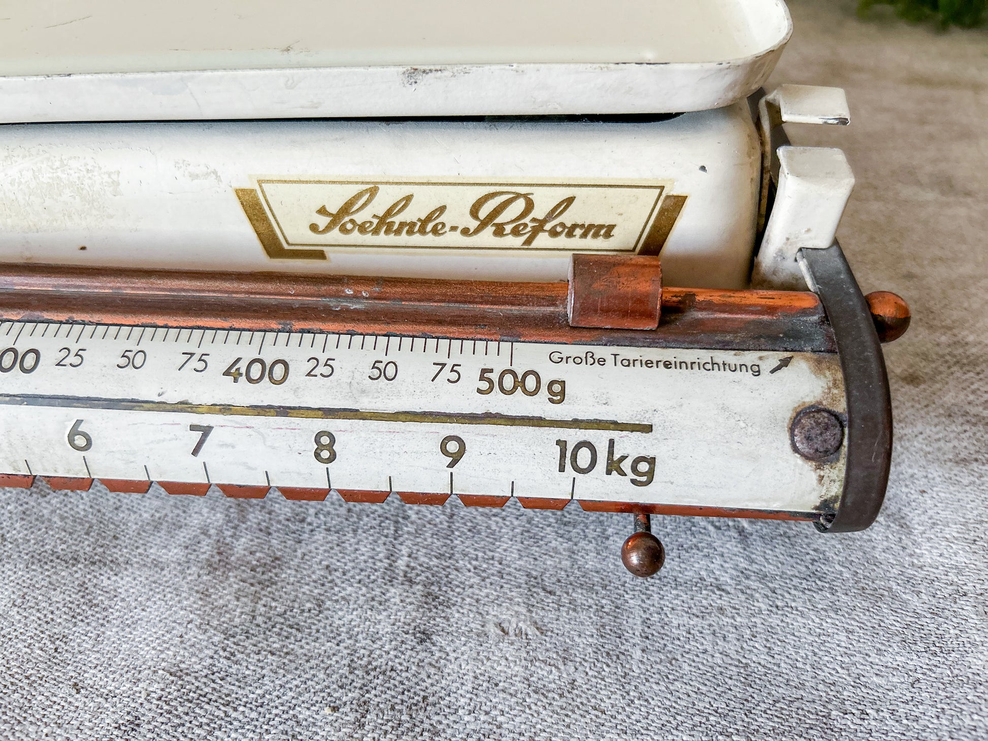 Available is a midcentury German balance scale with great color and lettering. The cream metal scale is accented with copper numbers and trim. Cursive script reads "Soehnle Reform", with more words in German. Weight is shown in kilograms.