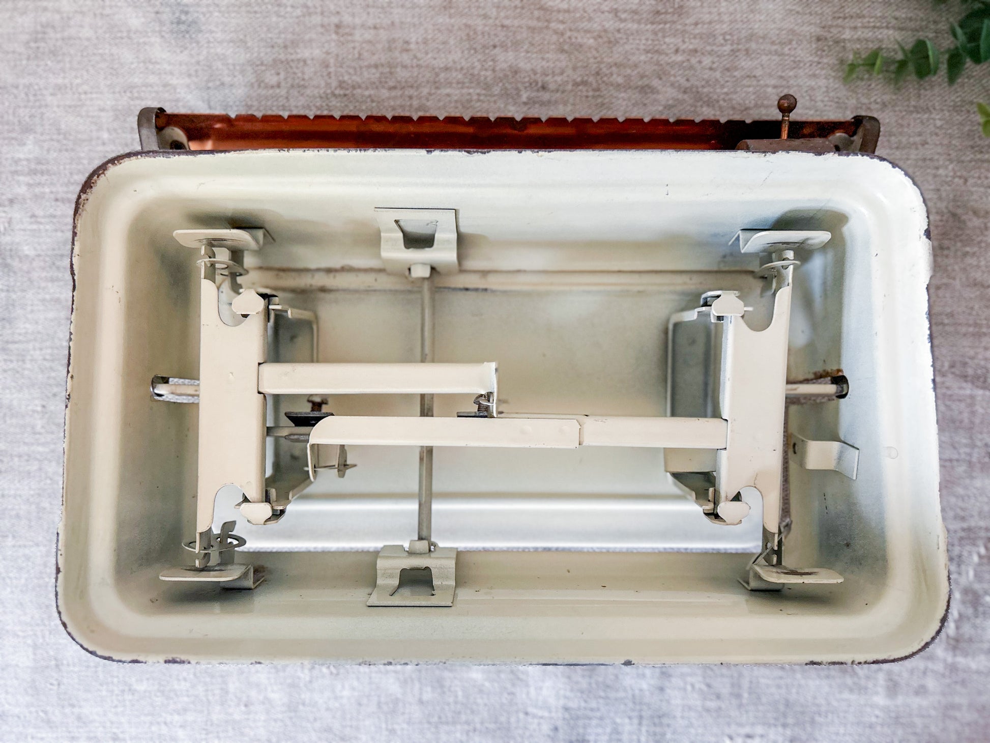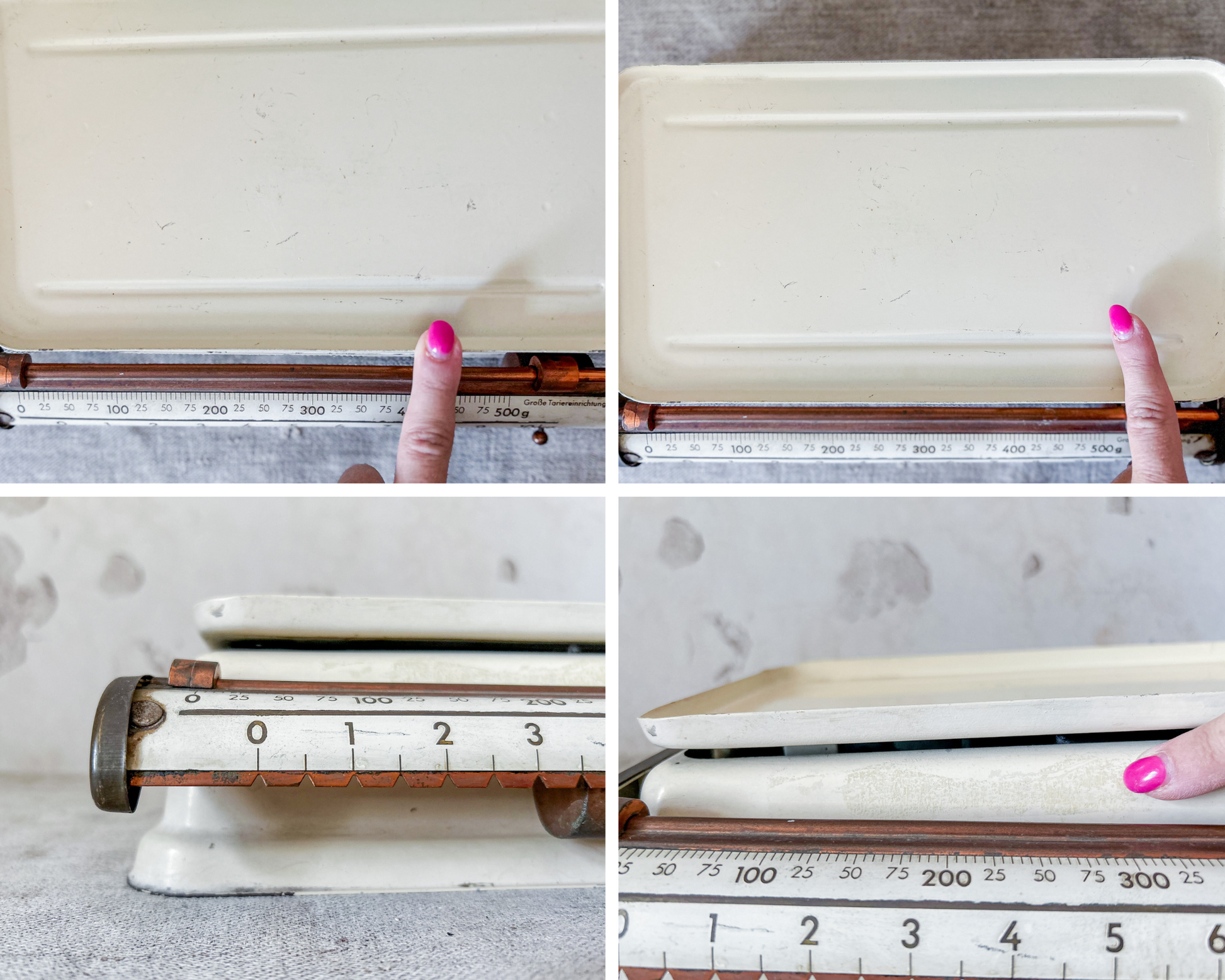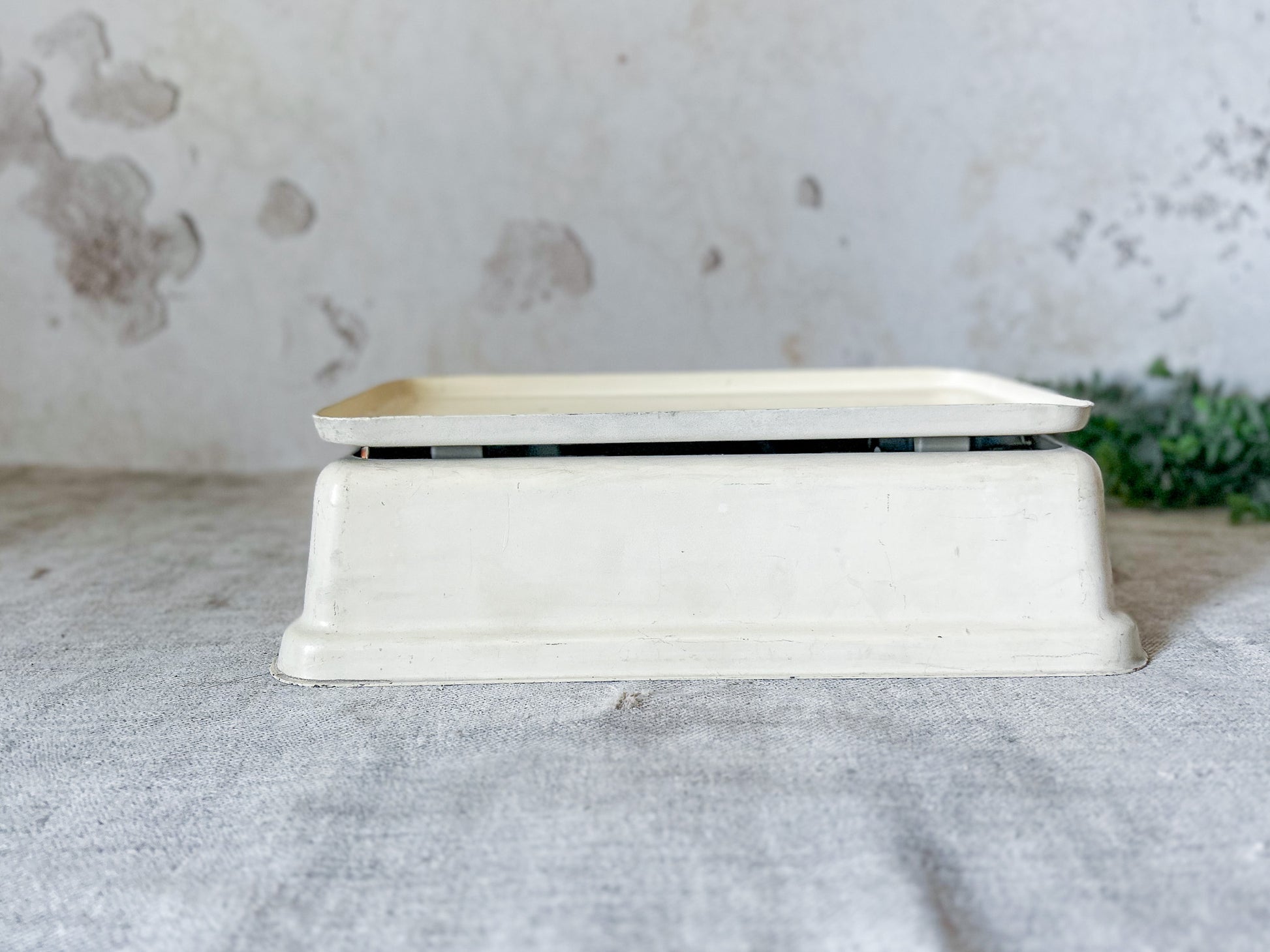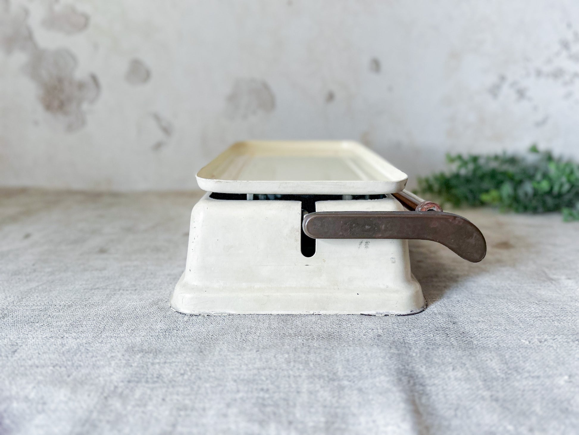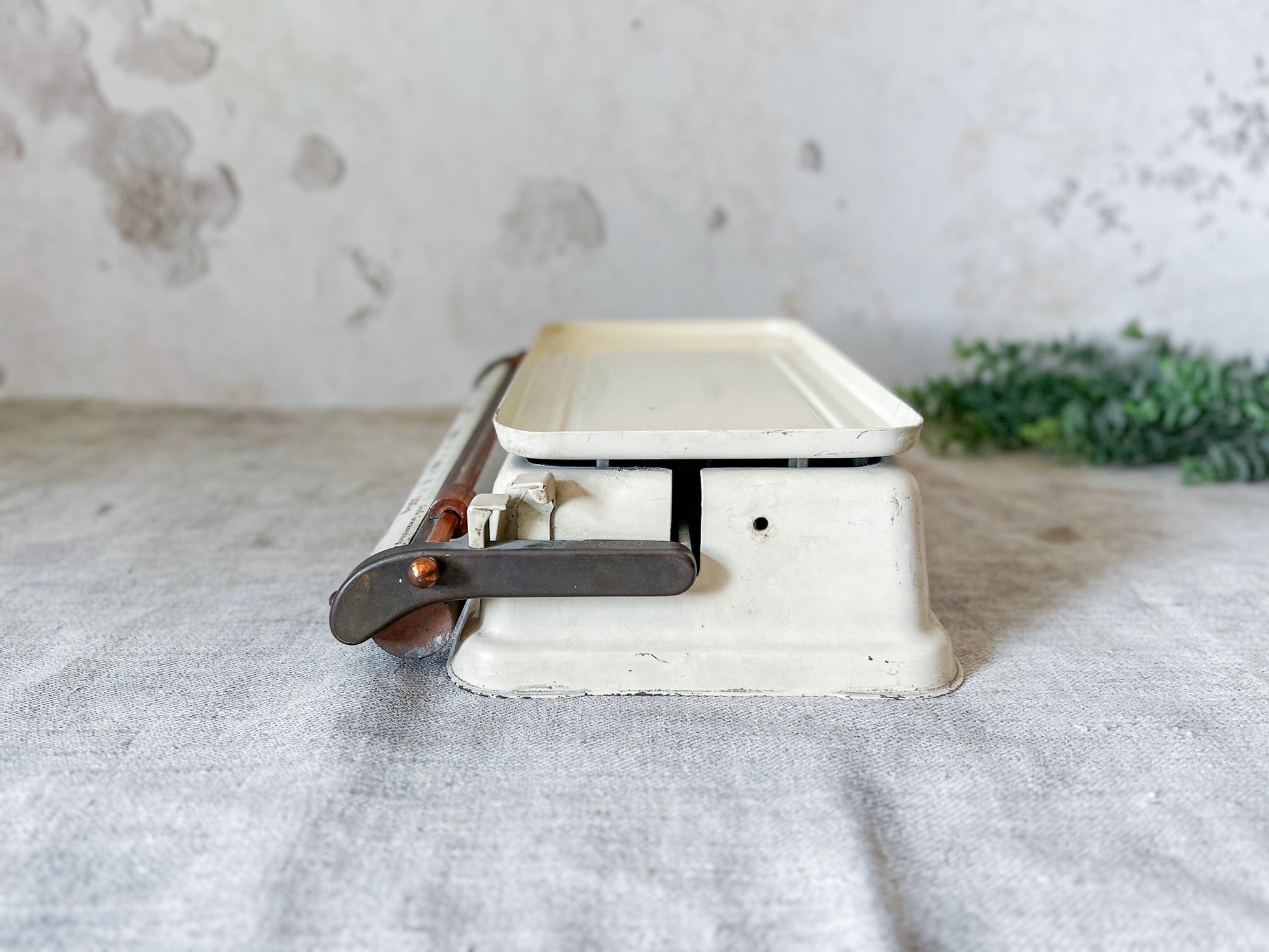 Available is a midcentury German balance scale with great color and lettering. The cream metal scale is accented with copper numbers and trim. Cursive script reads "Soehnle Reform", with more words in German. Weight is shown in kilograms.