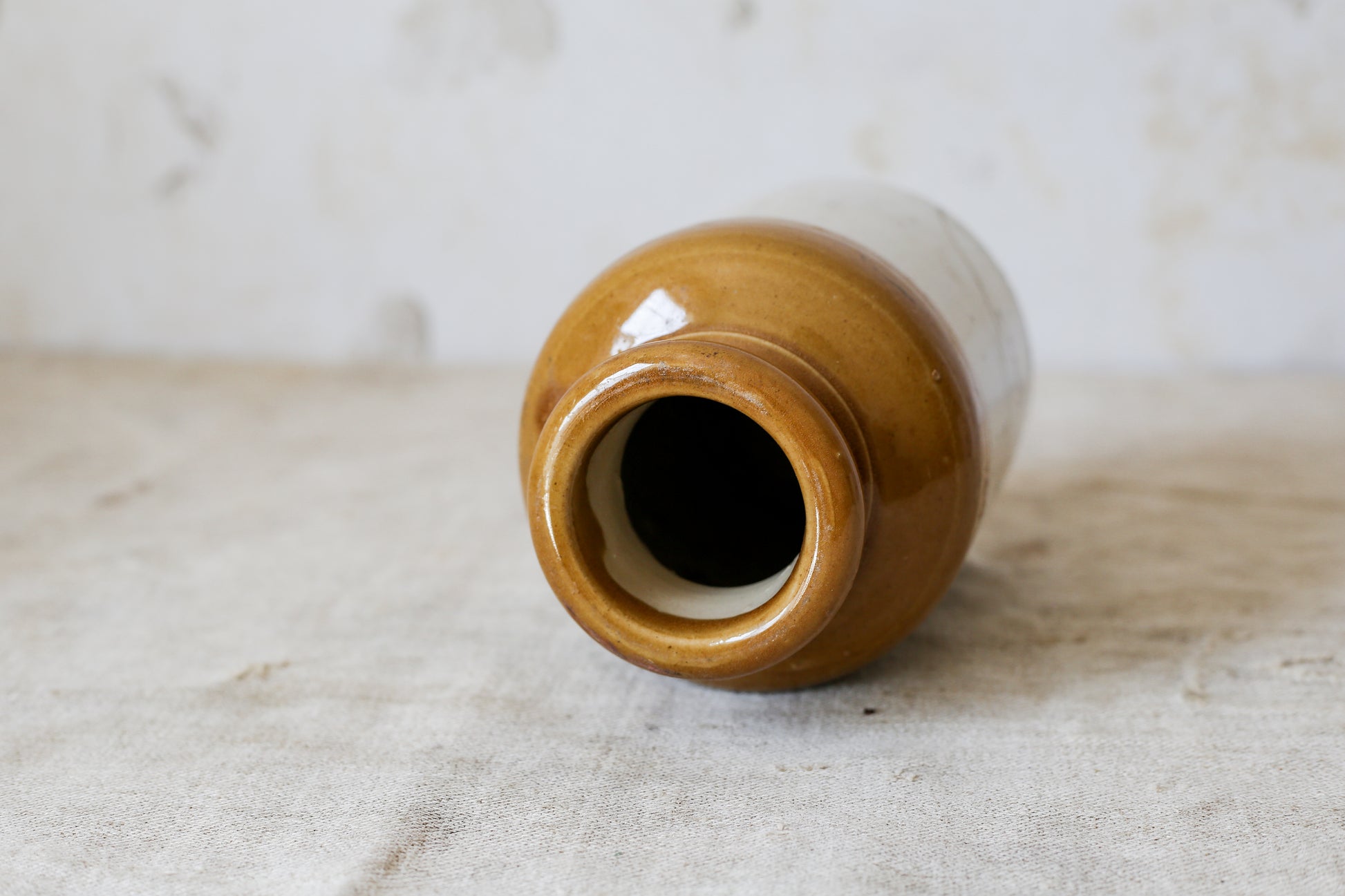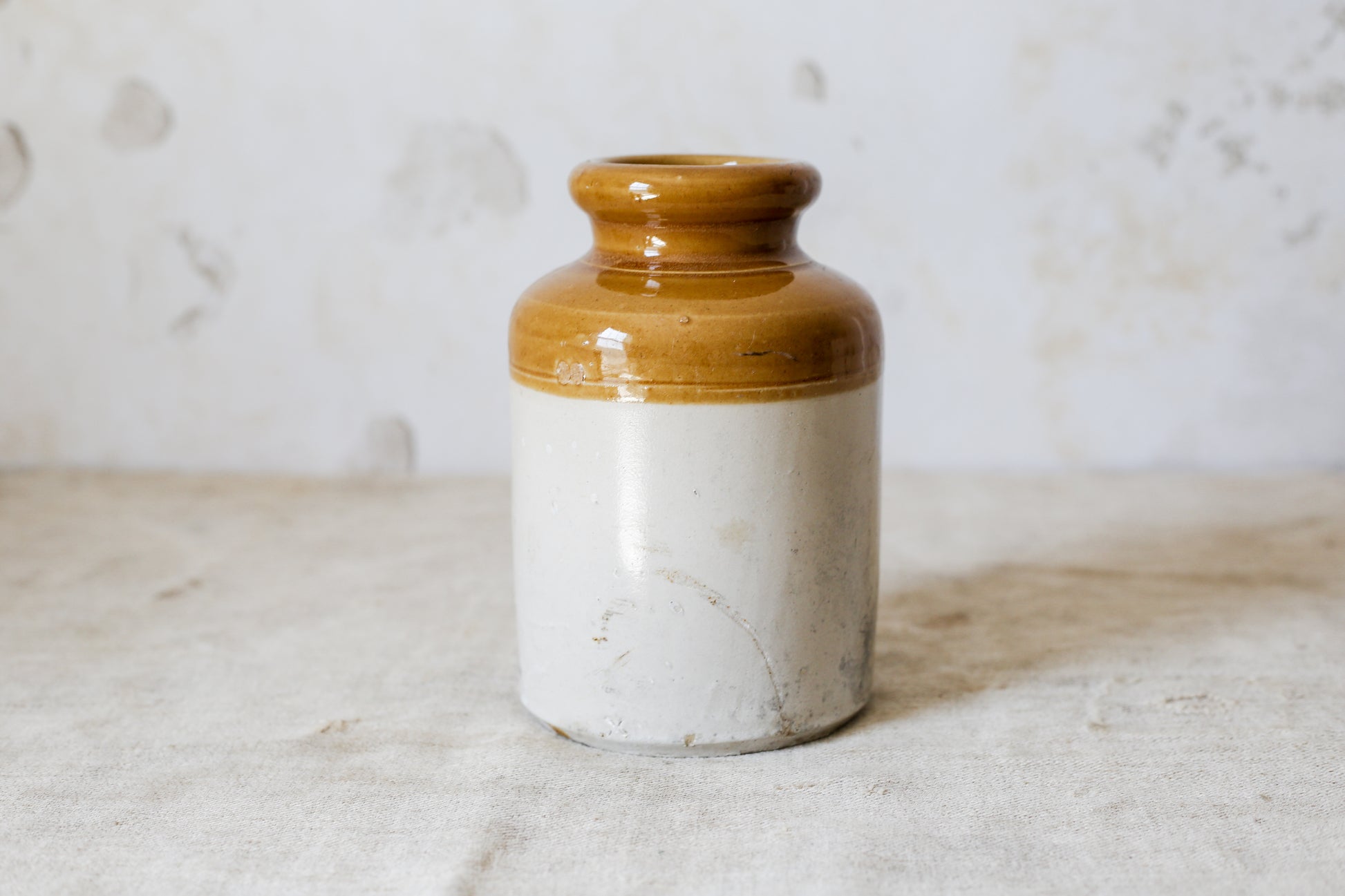 This Antique English Pantry Storage Crock is a charming and practical addition to any kitchen. Made of durable stoneware, it features a beautiful two-tone honey and beige design and is stamped with "E.L.& S." Perfect for storing kitchen utensils or small bouquets, it adds a touch of history and style to your home.