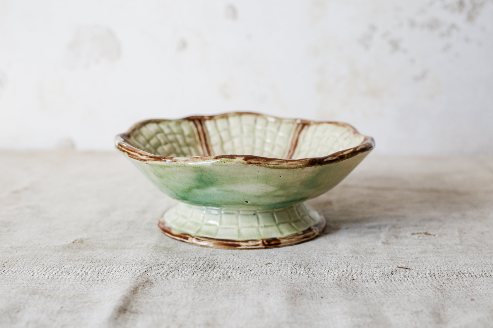 Majolica Green and Pink Begonia Basketweave Pedestal Compote Bowl
