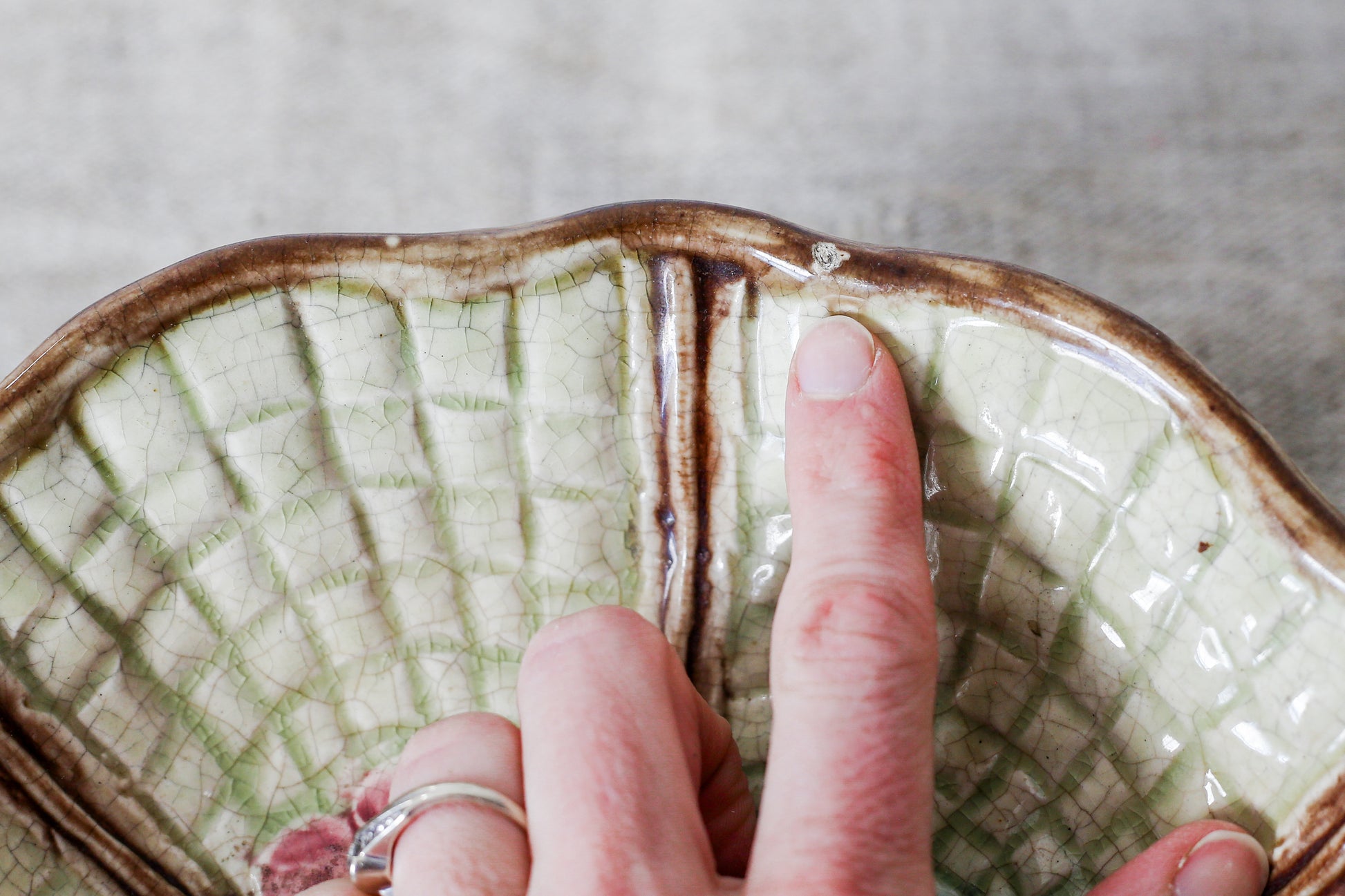 Beautifully designed naturalistic display piece, typical of the late Victorian love of pottery mimicking nature. Estimated age c1880. One small glaze scuff on the edge, and crazing throughout. Otherwise good antique condition.