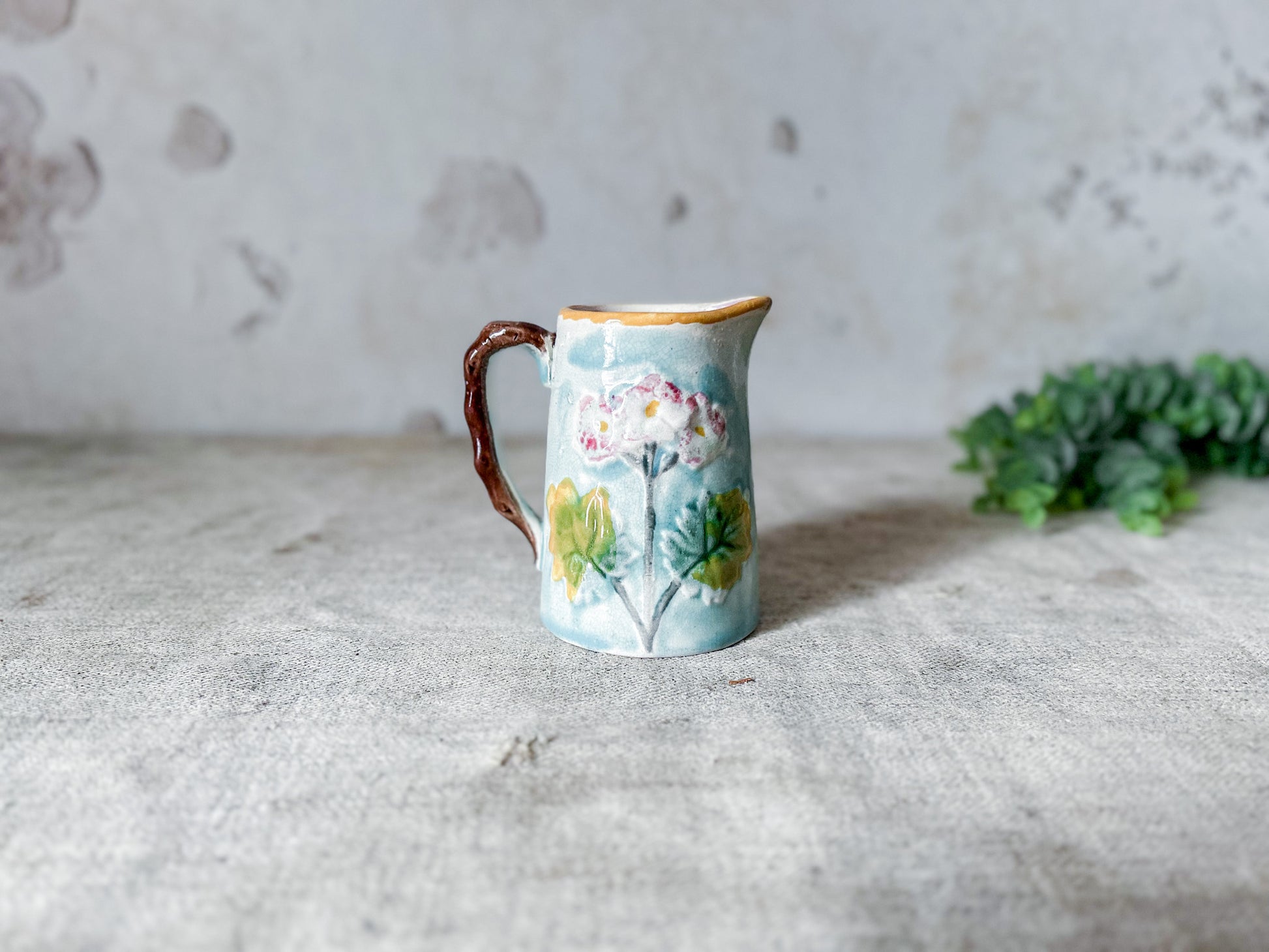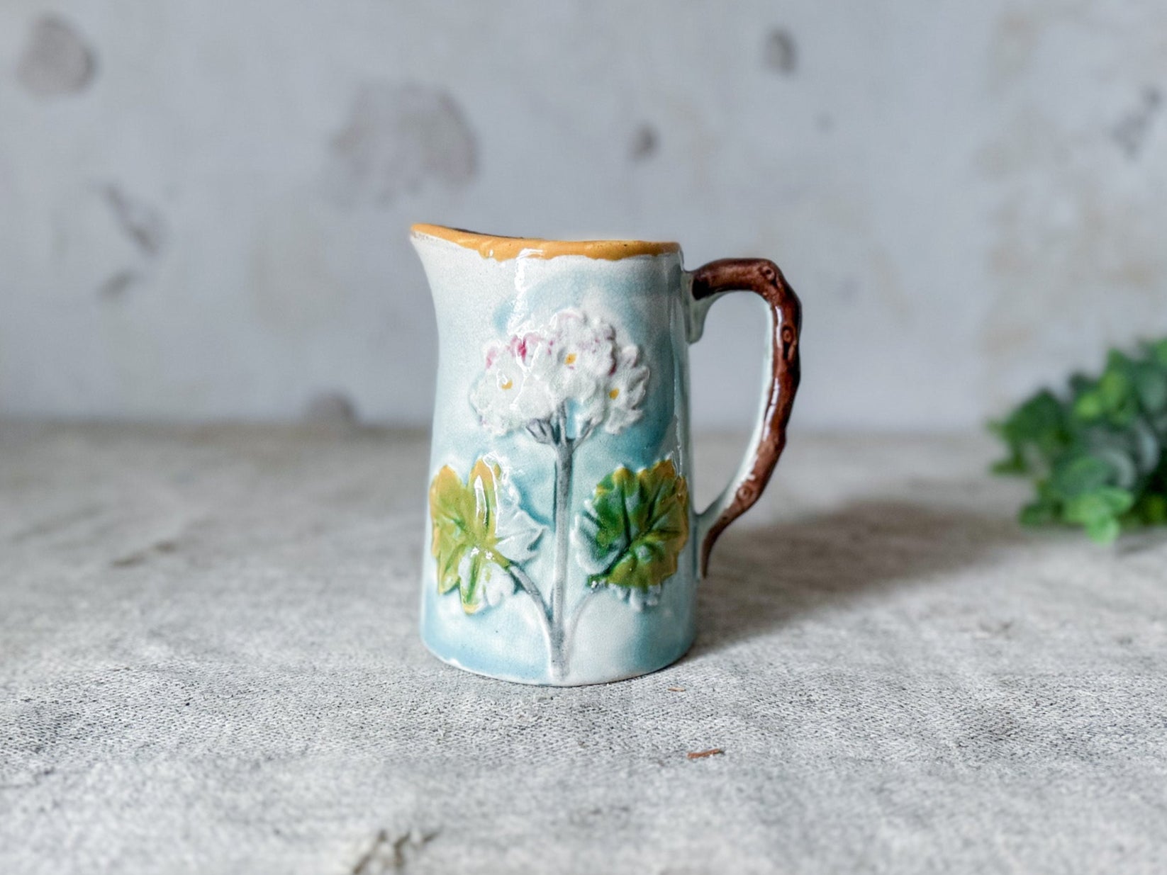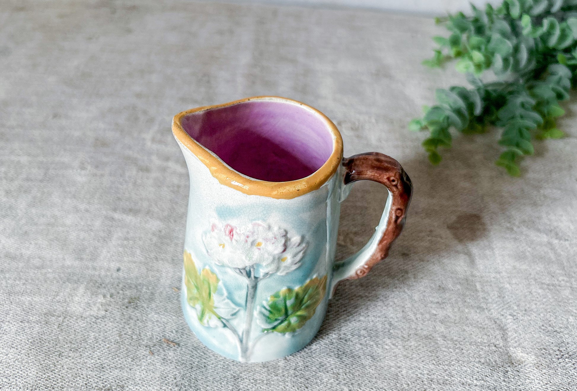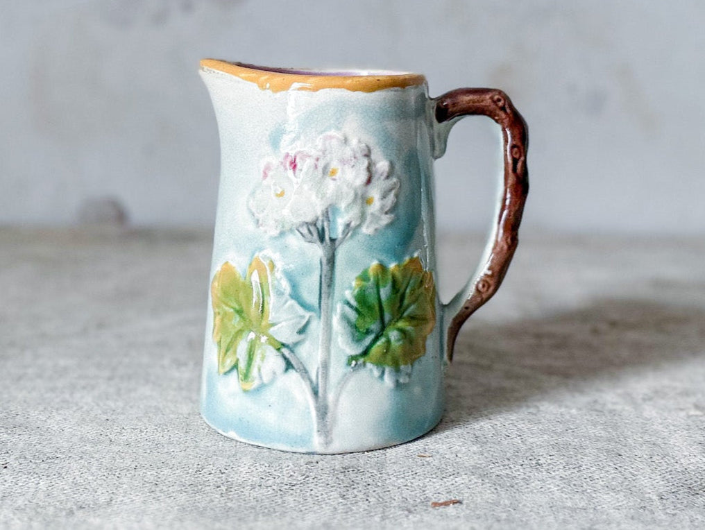 Available is an antique majolica pitcher in bright colors. White flowers (possibly geraniums or dogwoods) are set against a robin's egg-blue background. The handle is designed to look like a tree branch. Pink glazed interior. Light crazing throughout. No maker's mark.