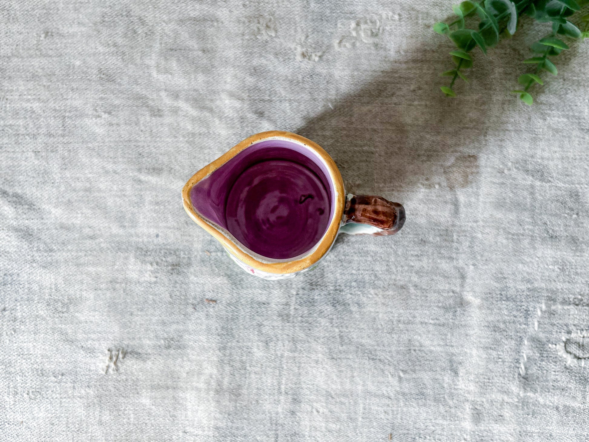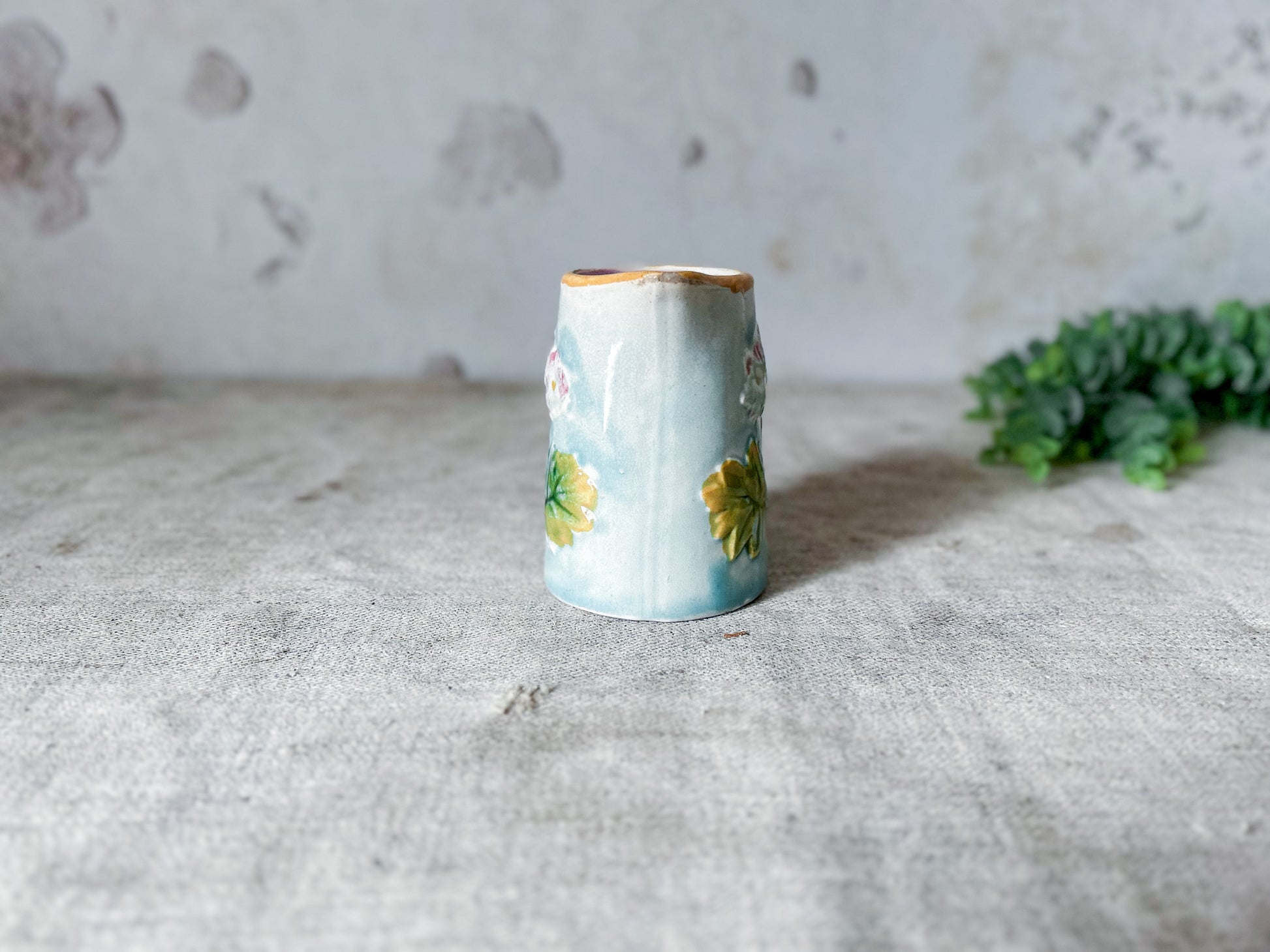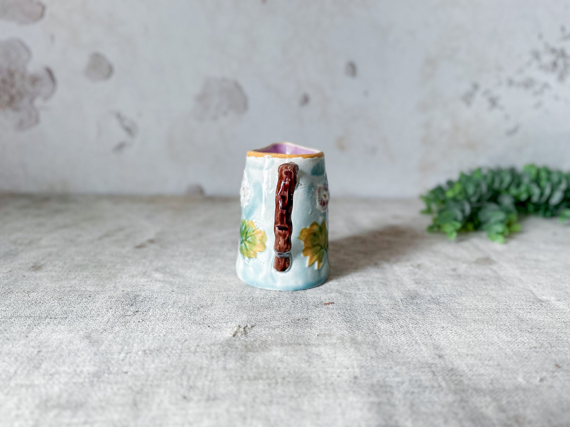 Available is an antique majolica pitcher in bright colors. White flowers (possibly geraniums or dogwoods) are set against a robin's egg-blue background. The handle is designed to look like a tree branch. Pink glazed interior. Light crazing throughout. No maker's mark.