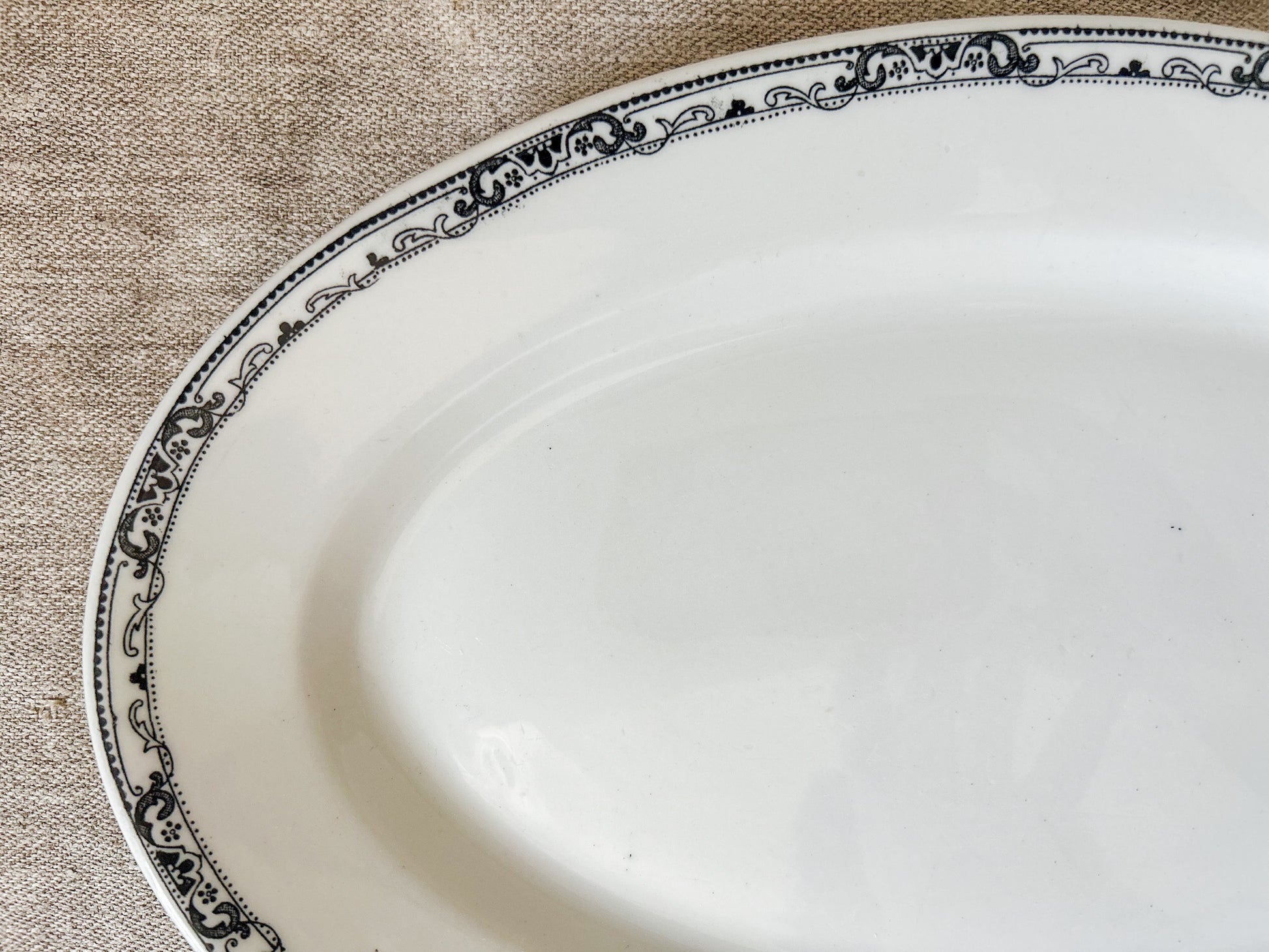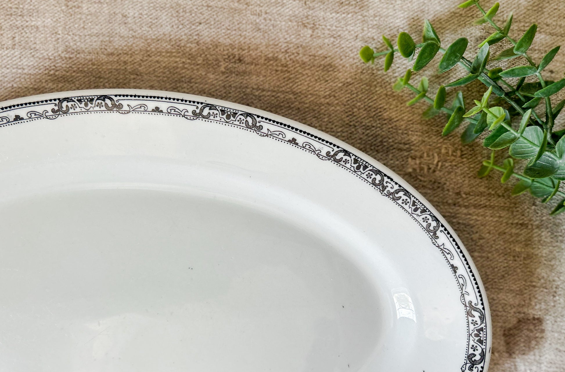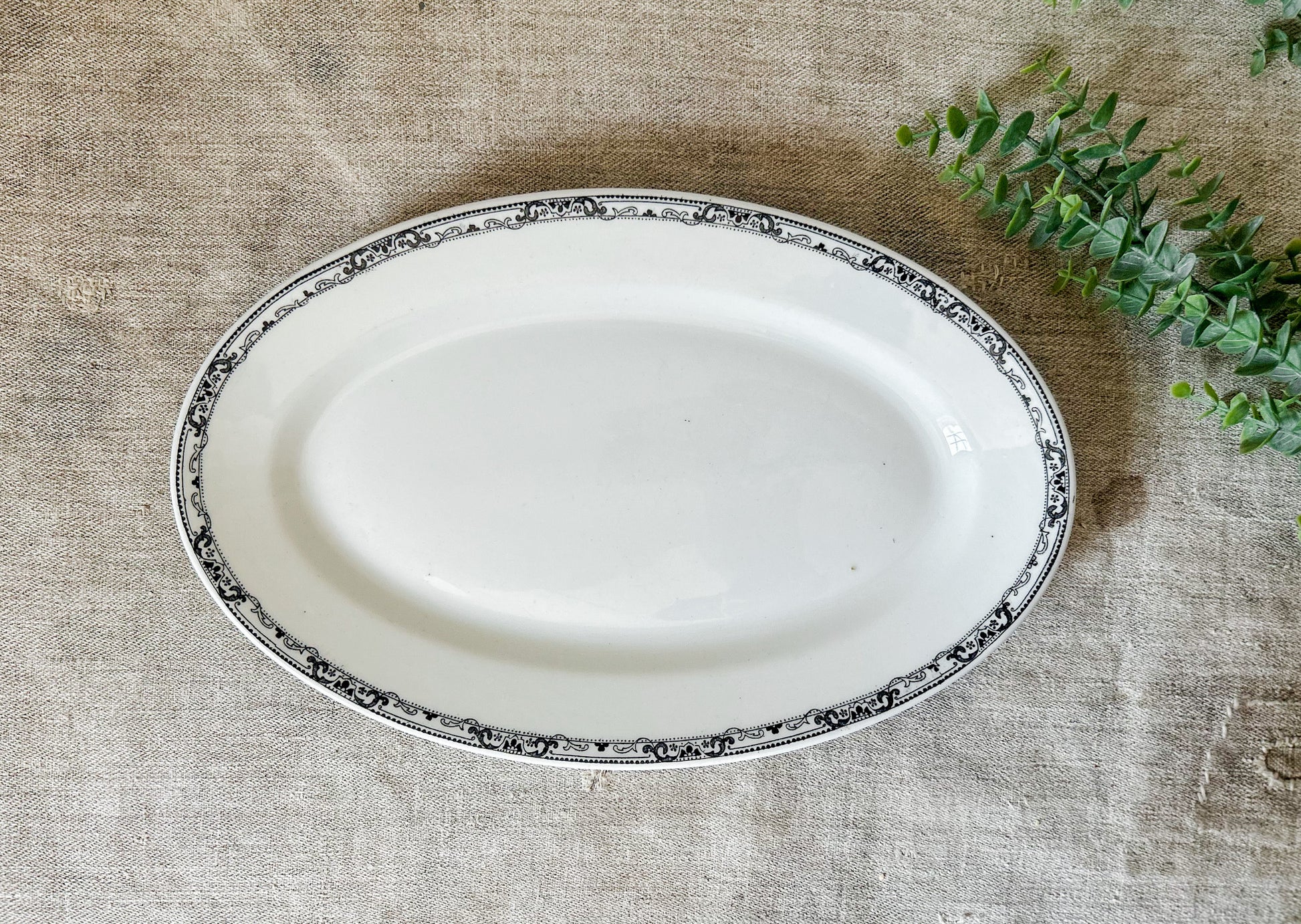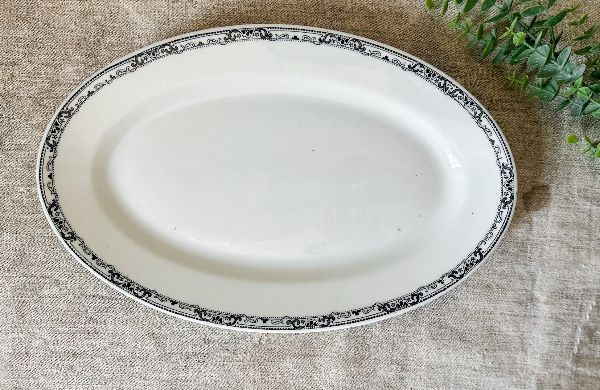 Nastraus was a line of hotel serving ware produced by Nathan & Strauss in New York City in the 1920s and 1930s. This commercial platter was made to withstand heavy use and decorated with an attractive scrolled black and white pattern.