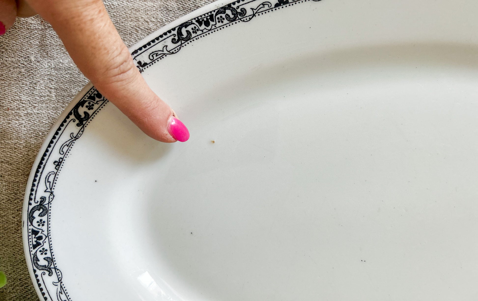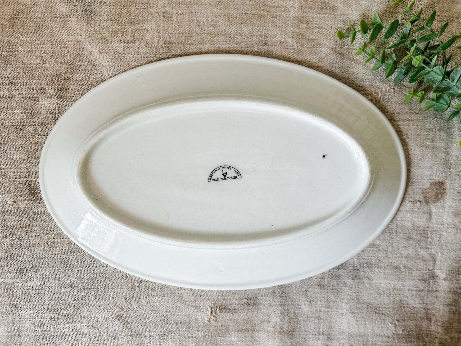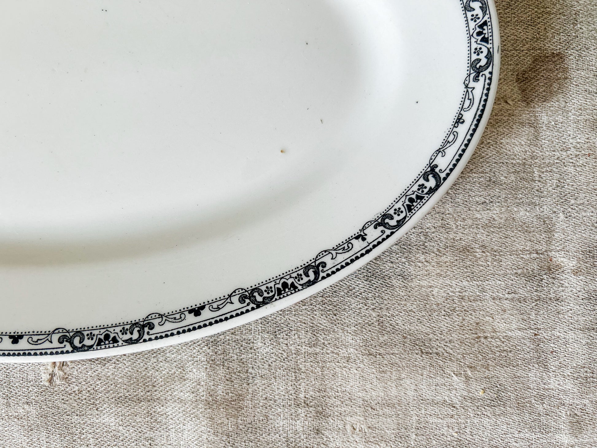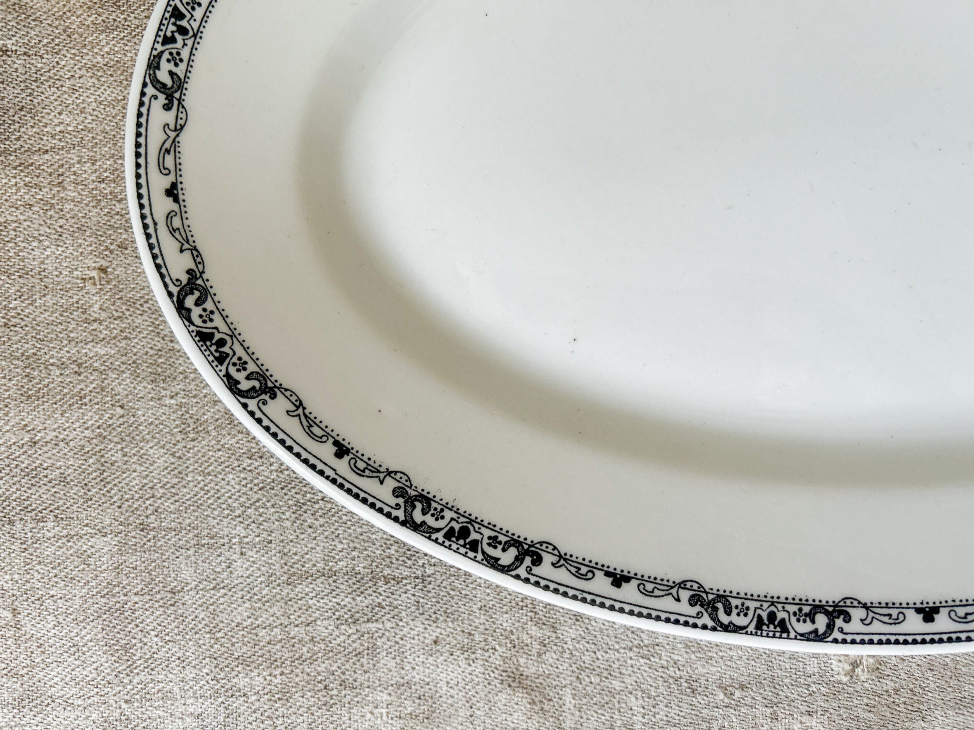 Nastraus was a line of hotel serving ware produced by Nathan & Strauss in New York City in the 1920s and 1930s. This commercial platter was made to withstand heavy use and decorated with an attractive scrolled black and white pattern.
