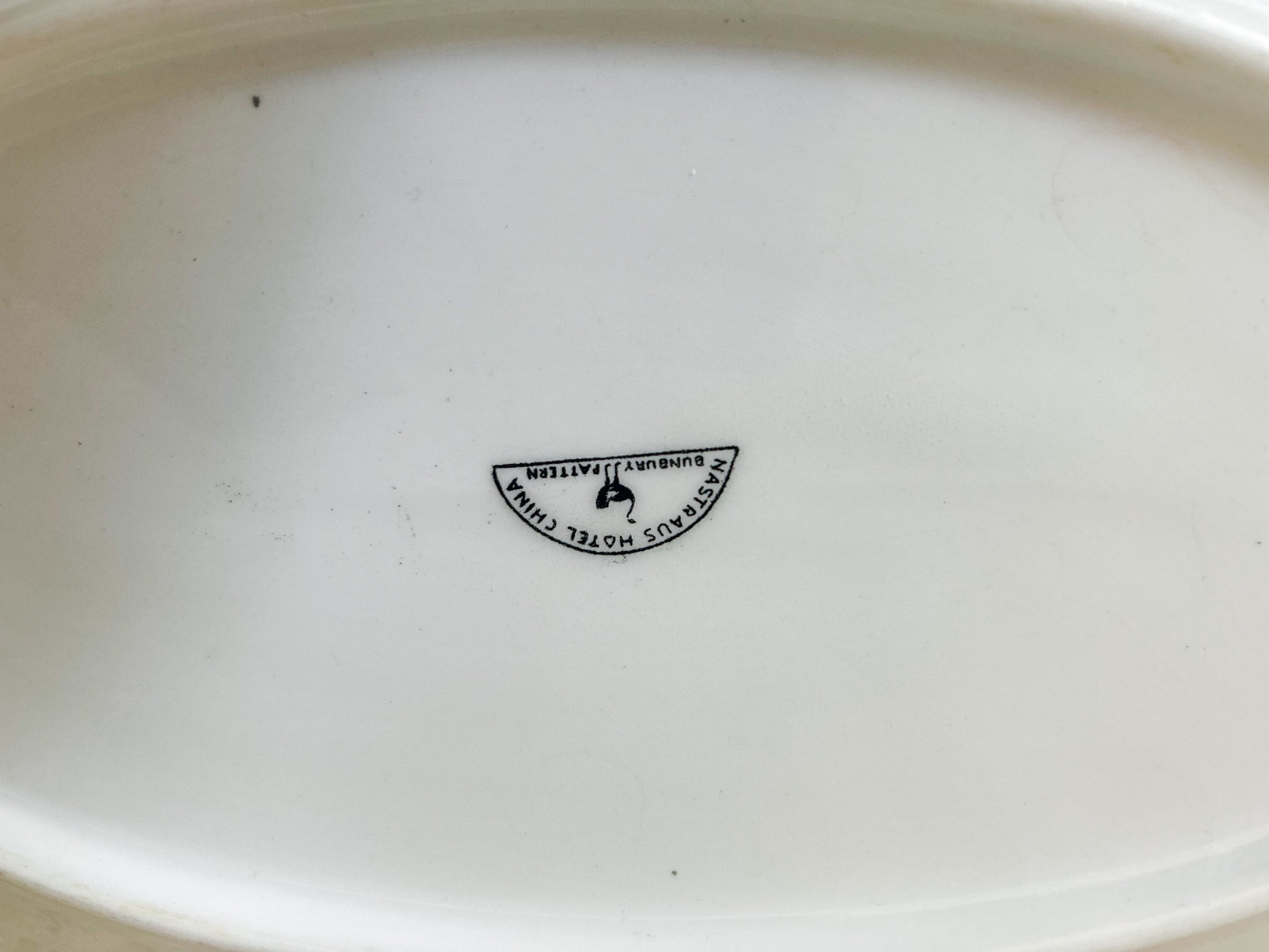 Available is a vintage hotel ware platter with strong graphics and great condition. The backstamp shows an ostrich within an oval and the words "Nastraus Hotel China Bunbury Pattern."
