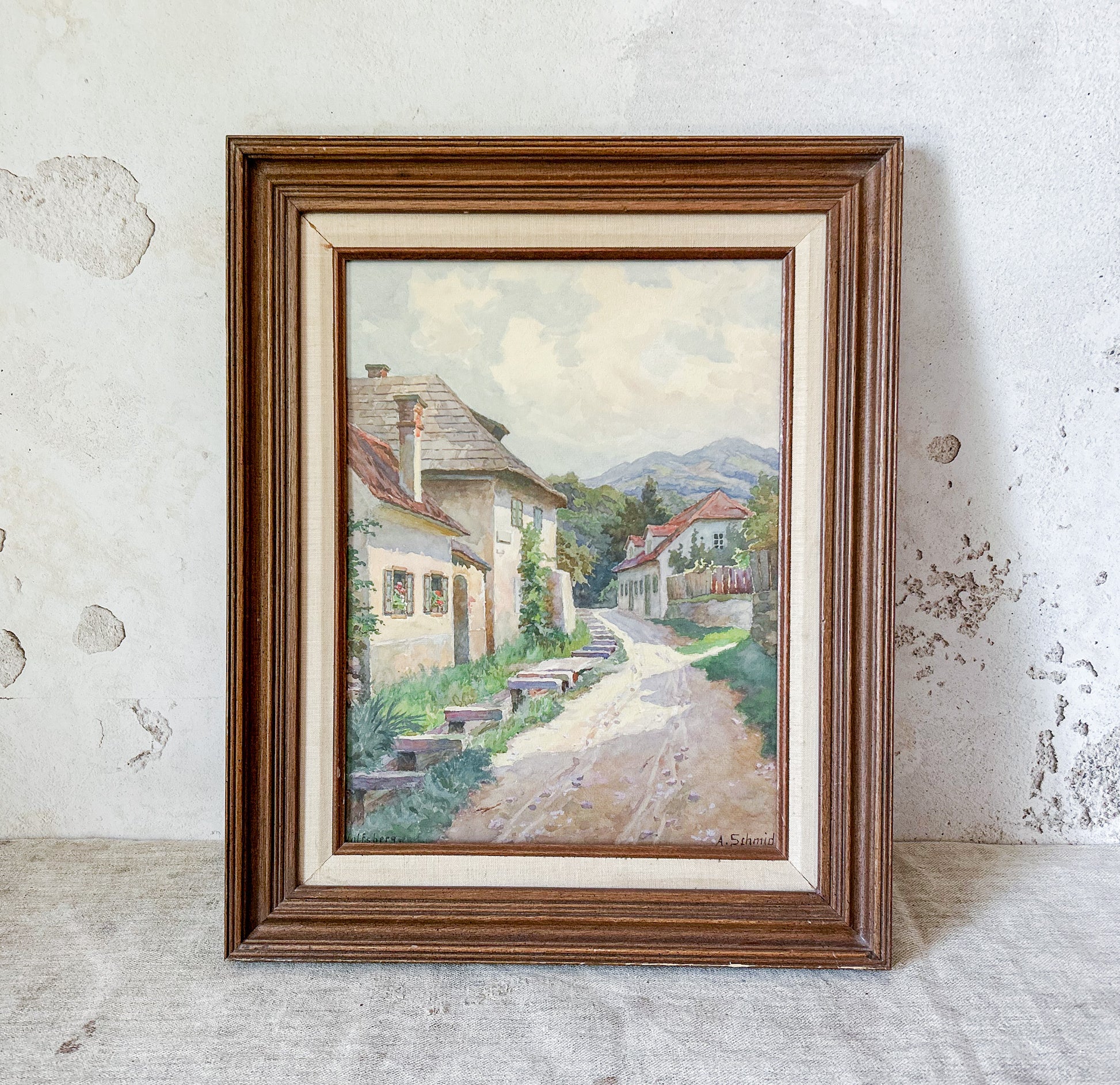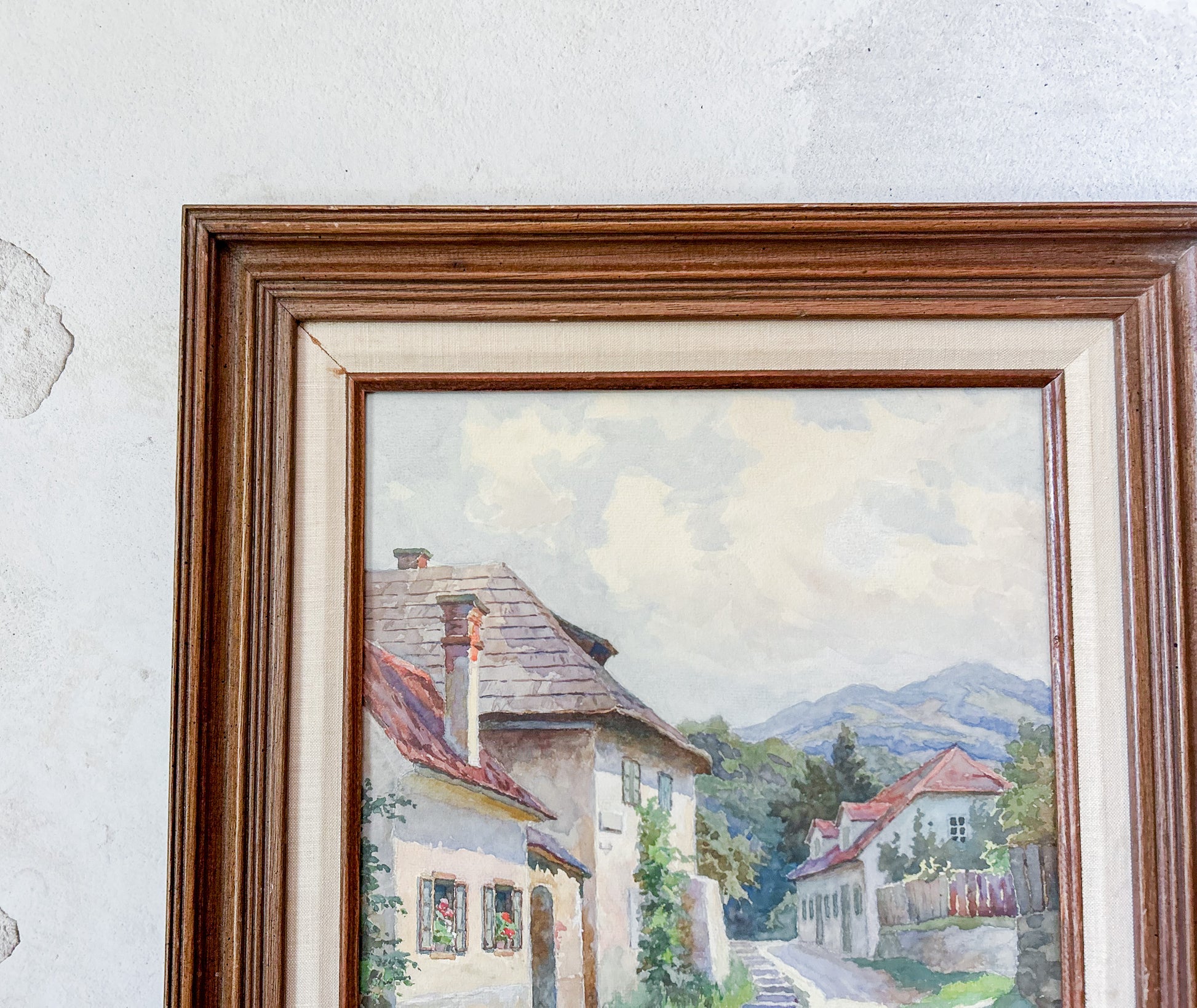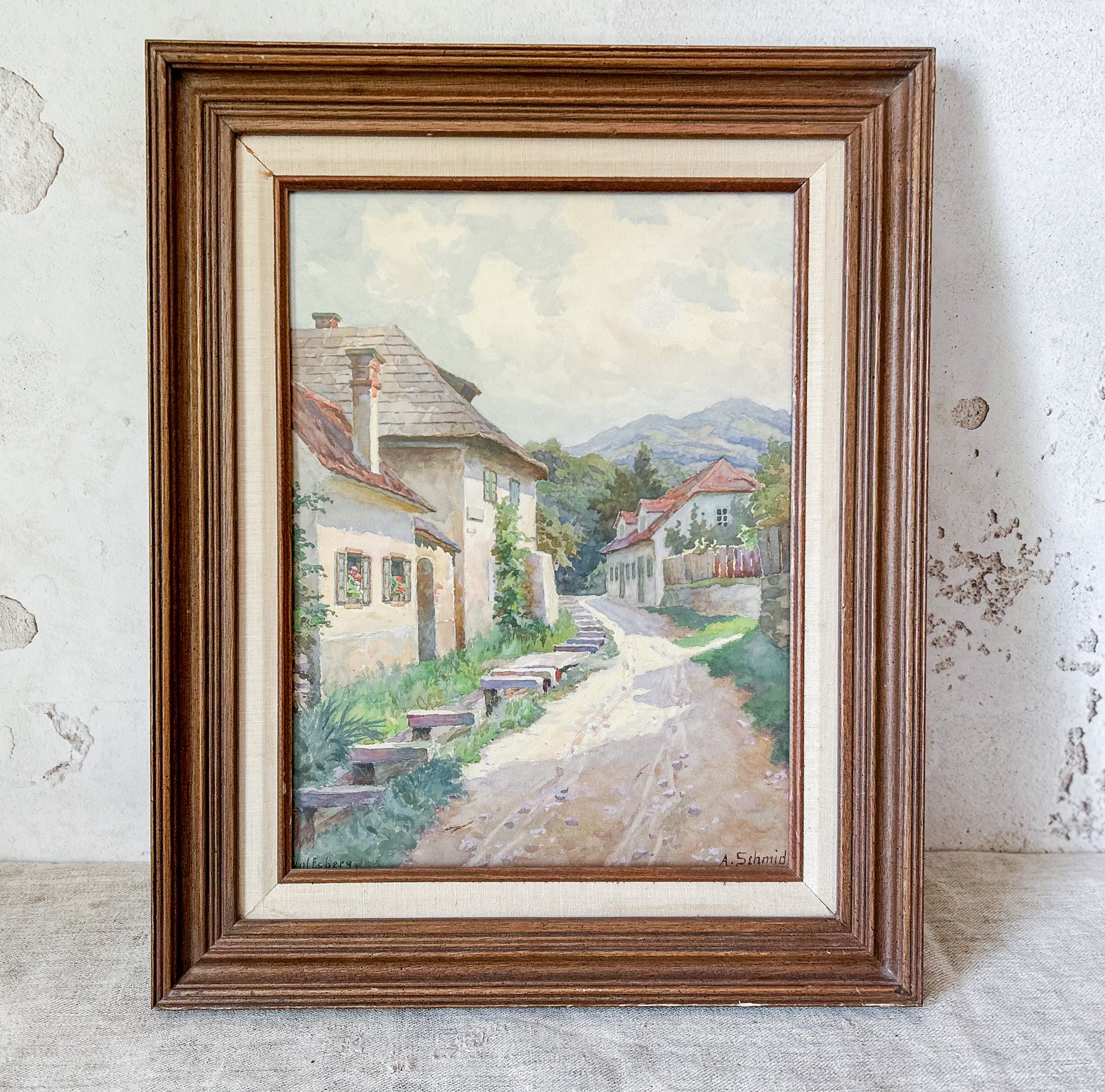Available is a framed original watercolor painting of a charming European village. The painting is framed in wood with linen inset. The scene shows several Alpine homes set against a mountain backdrop. The bottom right corner is signed "A. Schmidt."