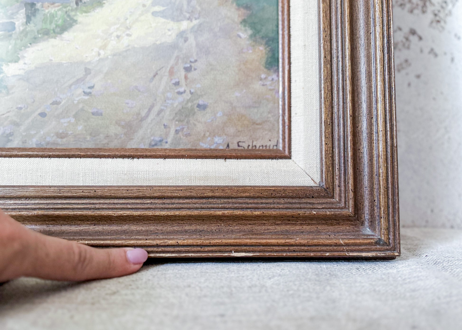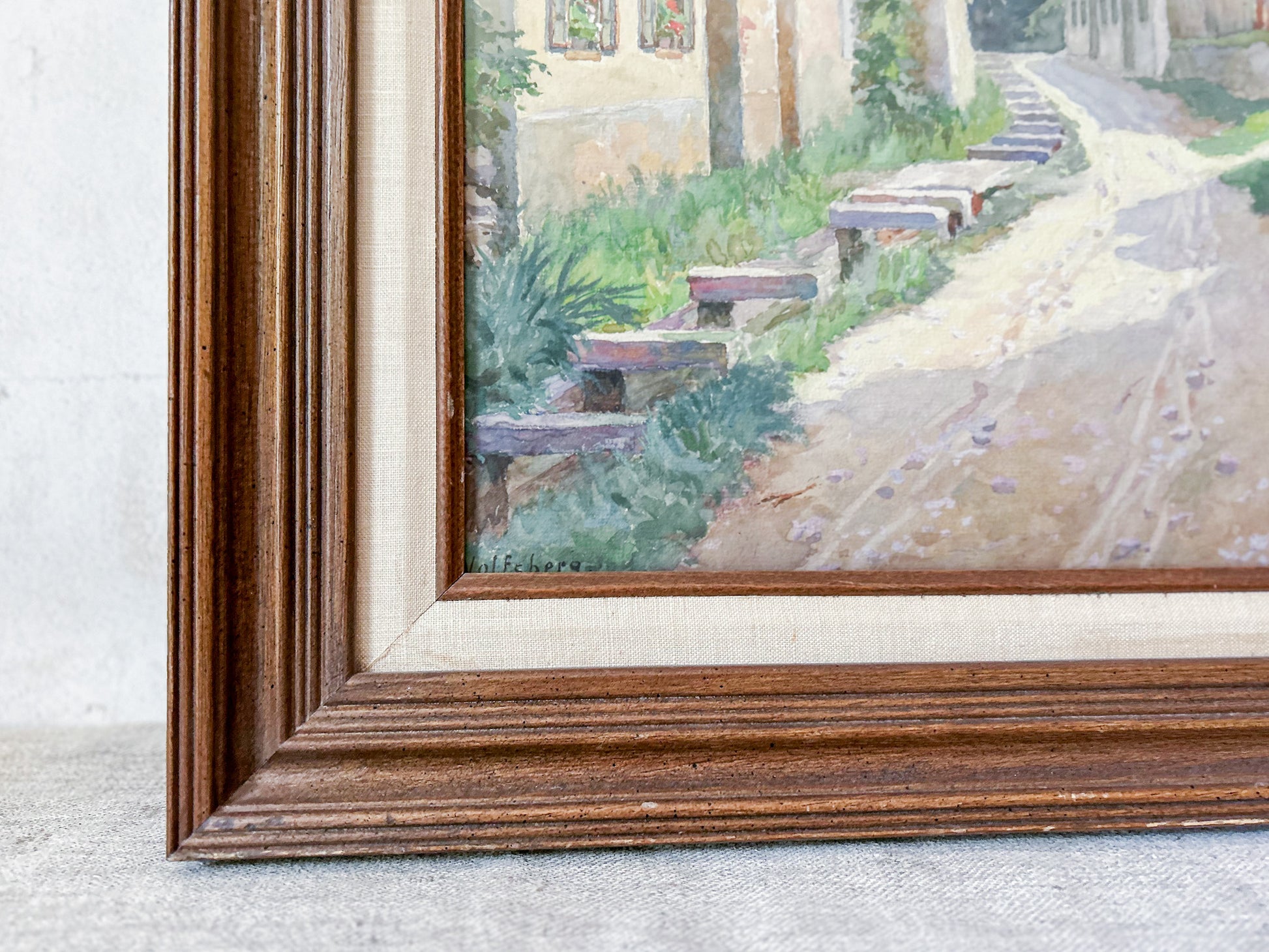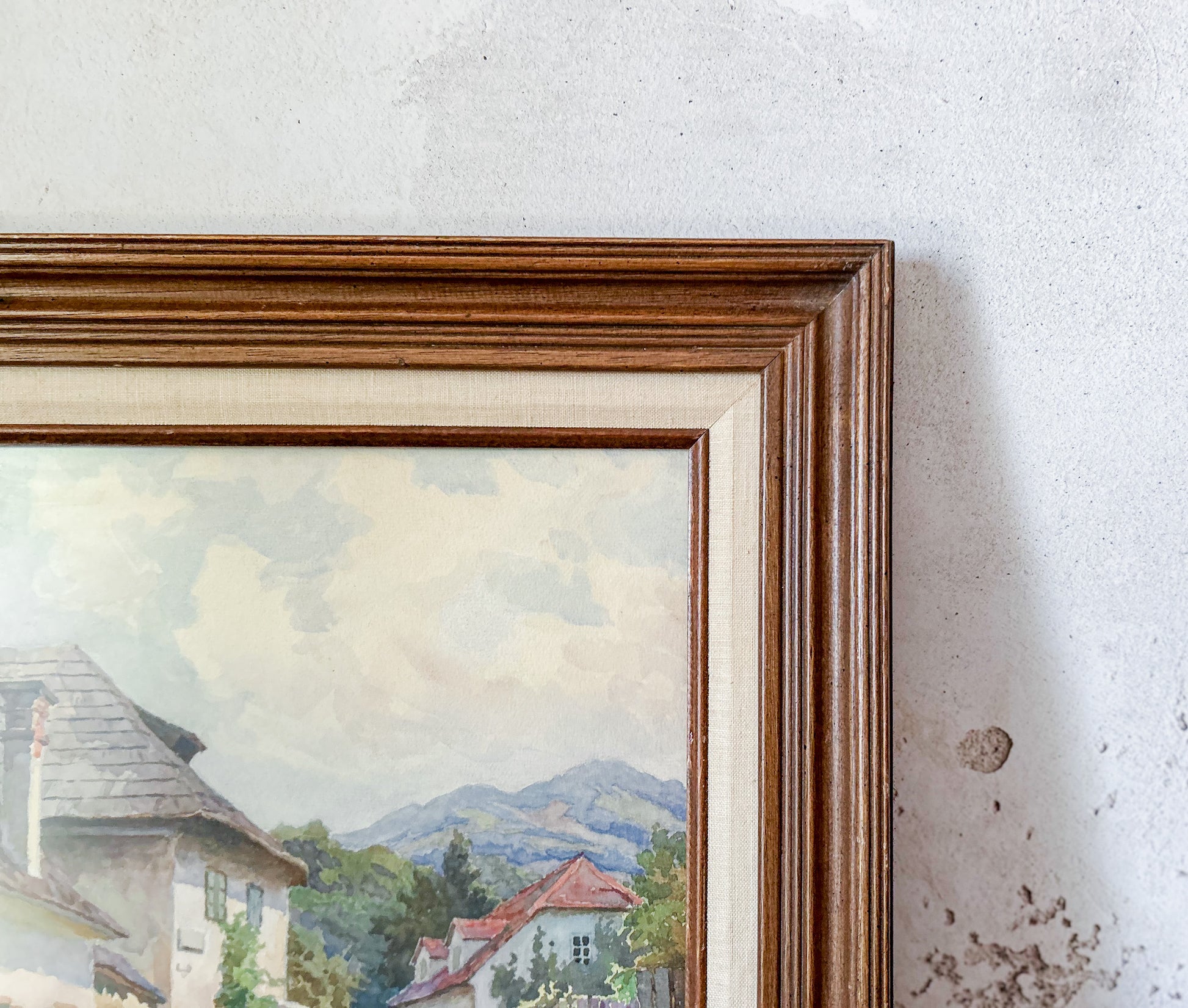 Available is a framed original watercolor painting of a charming European village. The painting is framed in wood with linen inset. The scene shows several Alpine homes set against a mountain backdrop. The bottom right corner is signed "A. Schmidt."