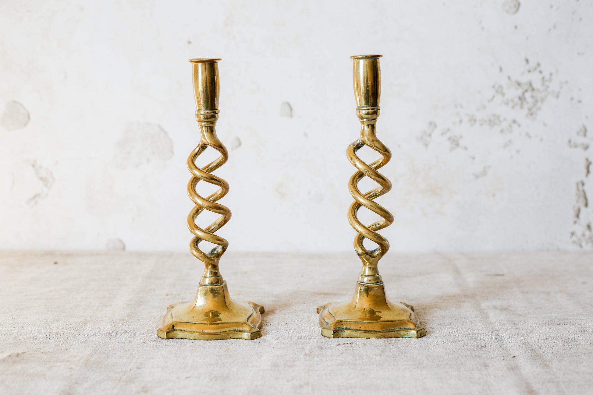 Pair of solid cast brass candlestick holders with open barley twist or spiral stems. The bases are square with flared corners. Bottoms show signs of sand casting, with rough surface. Lovely golden patina with minor signs of wear. Estimated age early to mid 19th century.