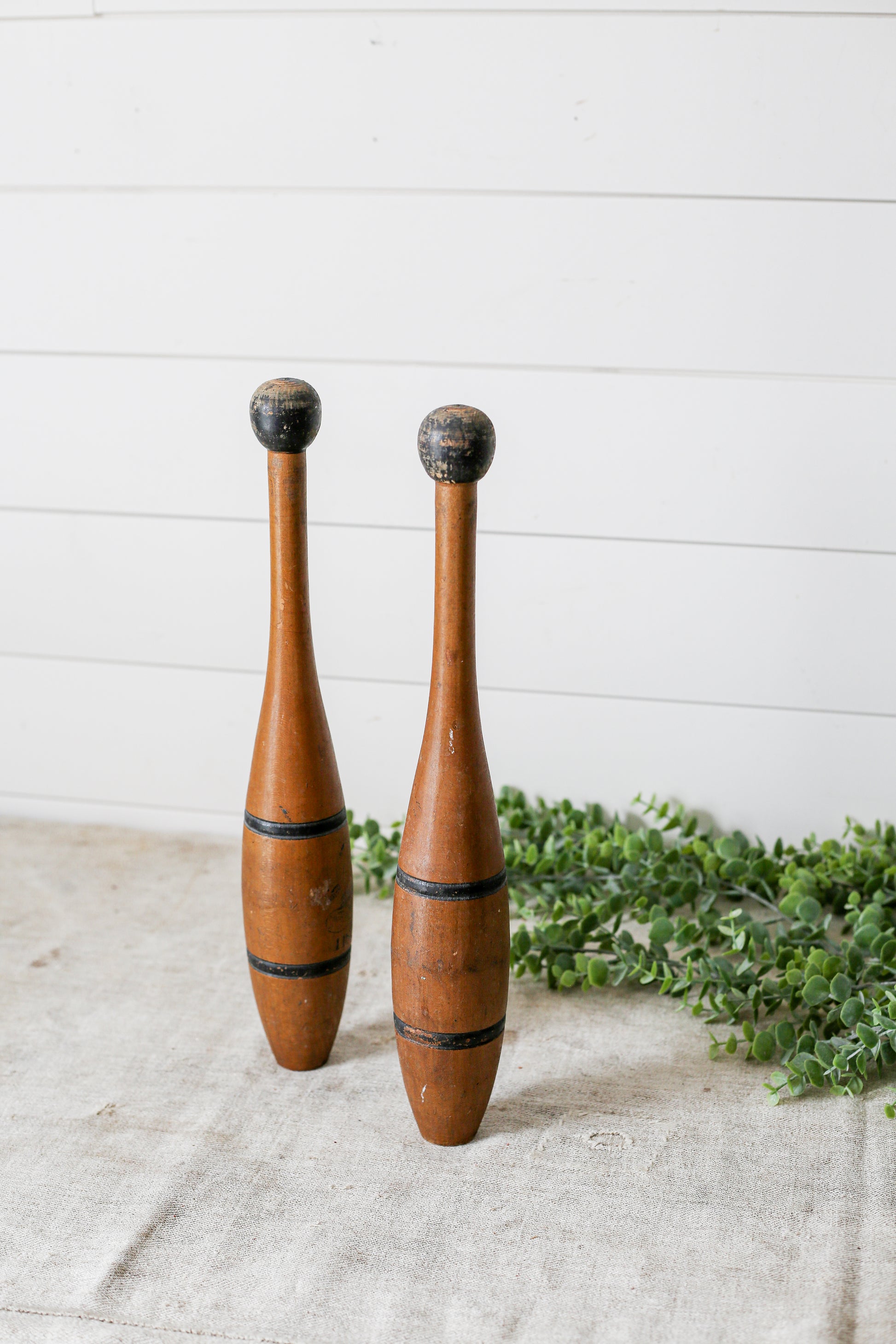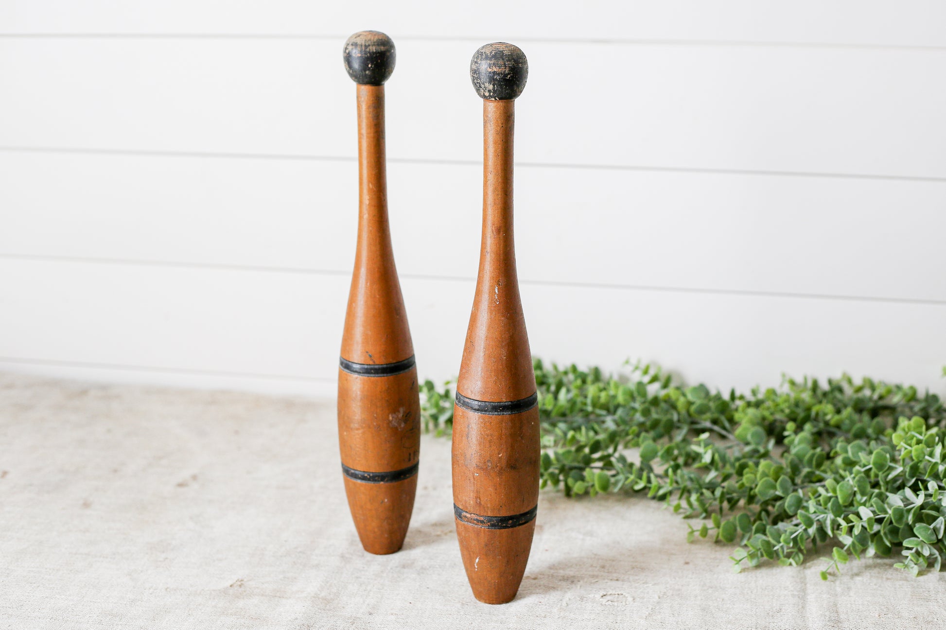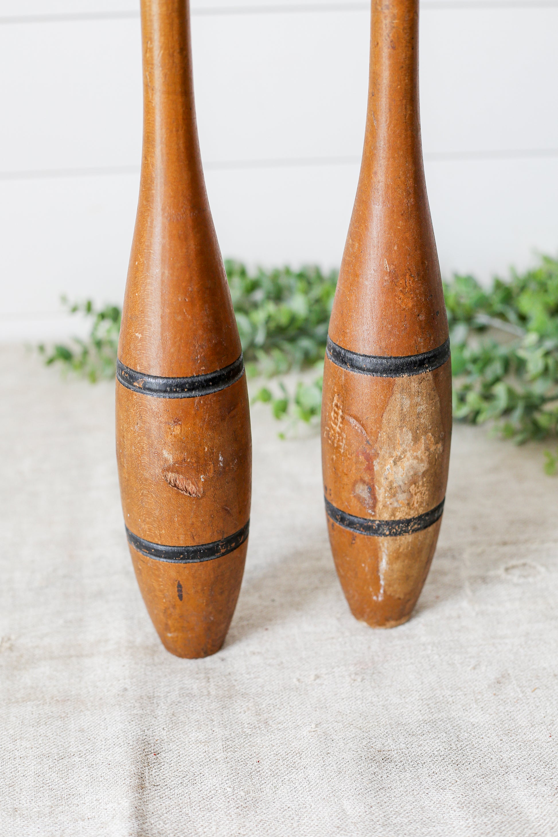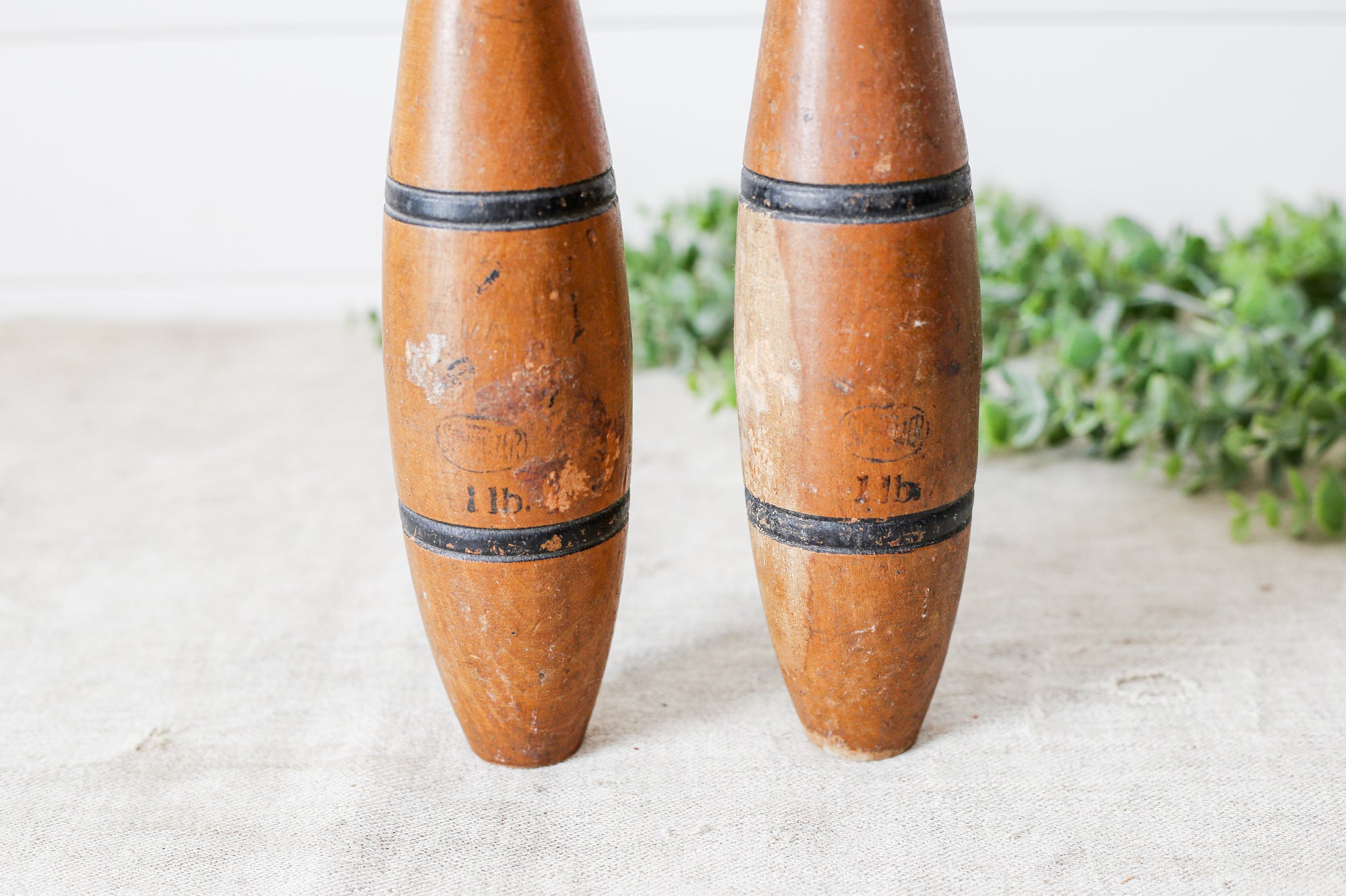 Available is a matching pair of two wooden 1 lb. juggling pins. These vintage clubs were used in circus performances or as exercise tools. They make great rustic decor statement pieces.