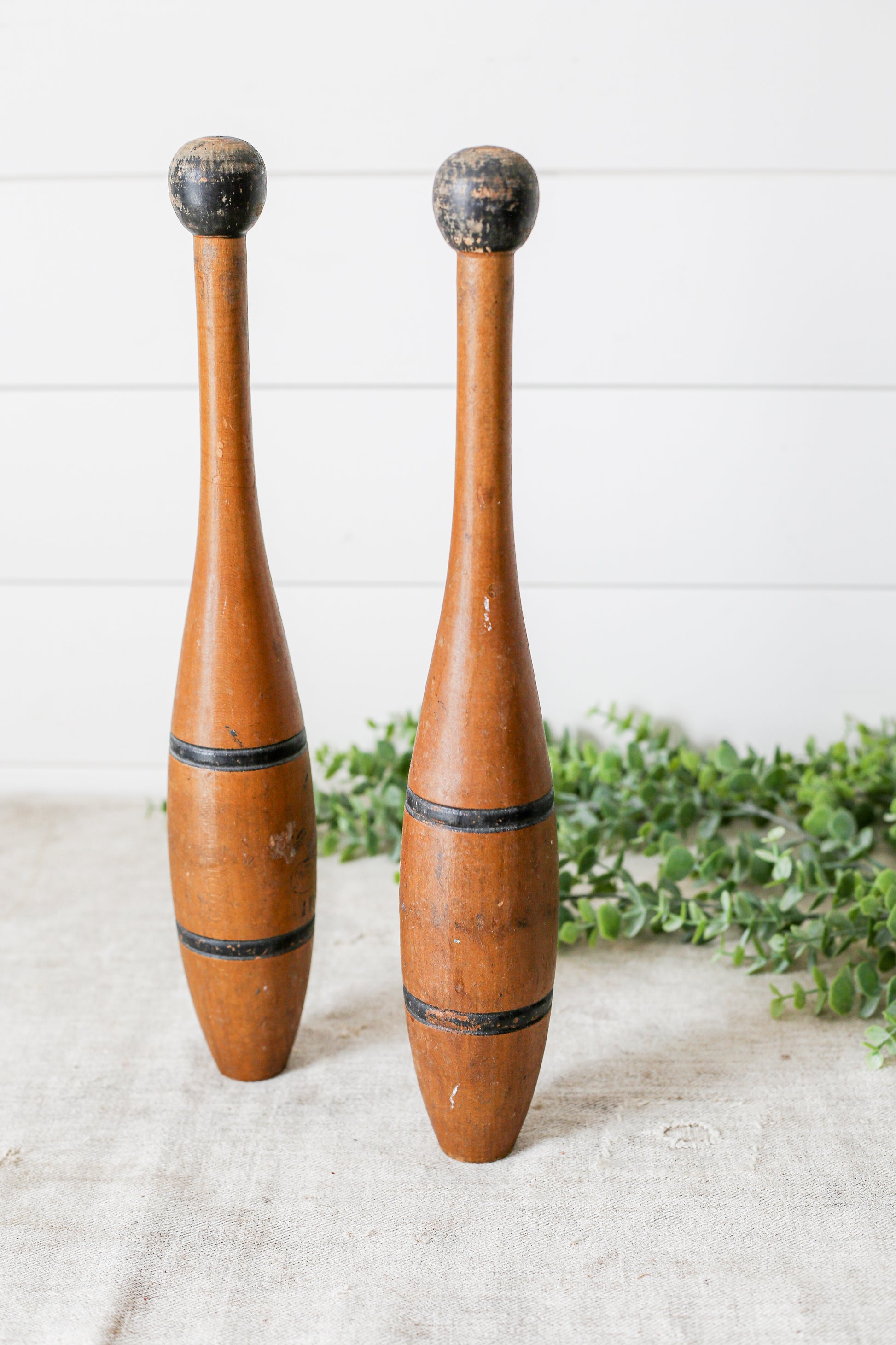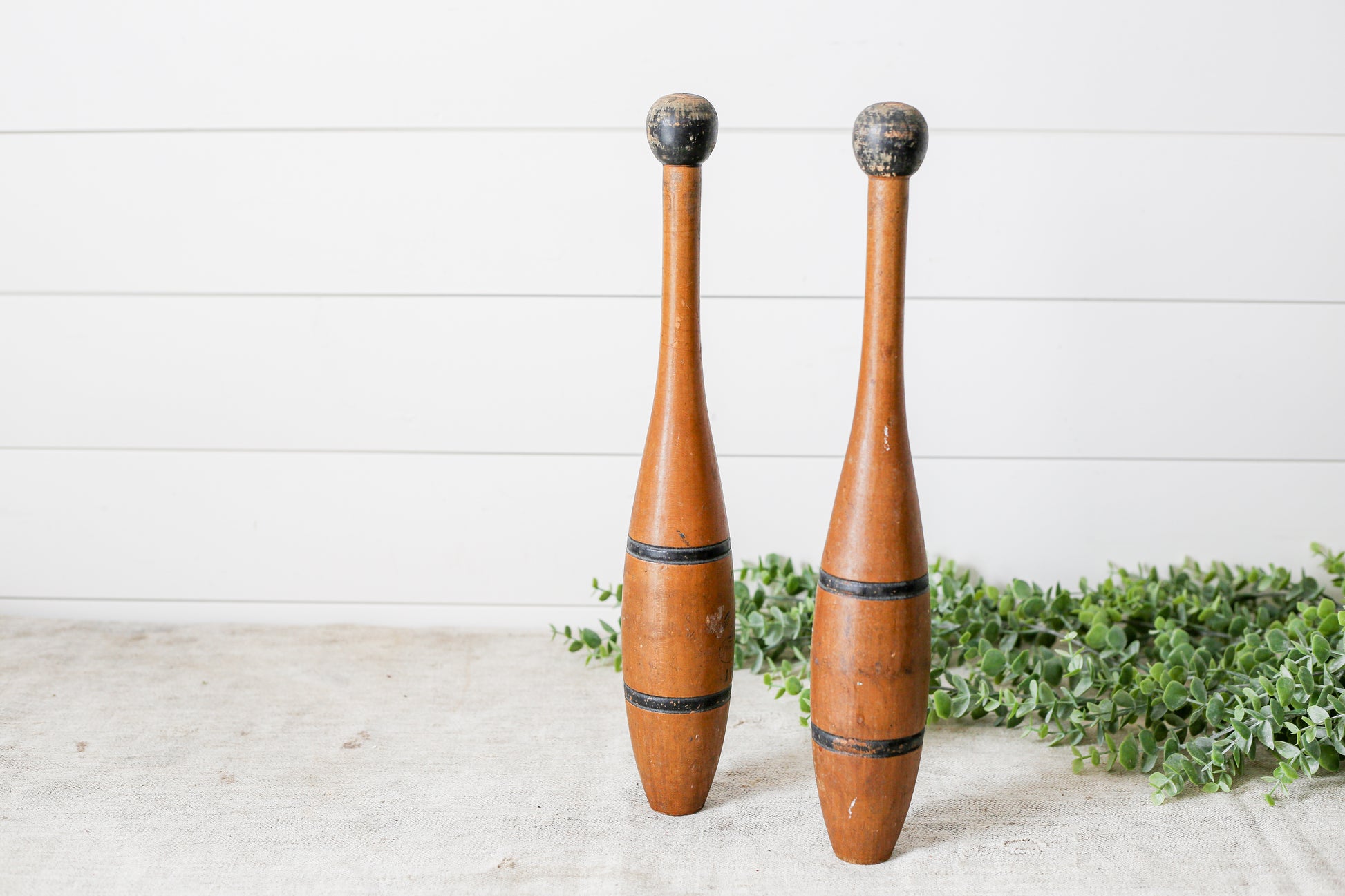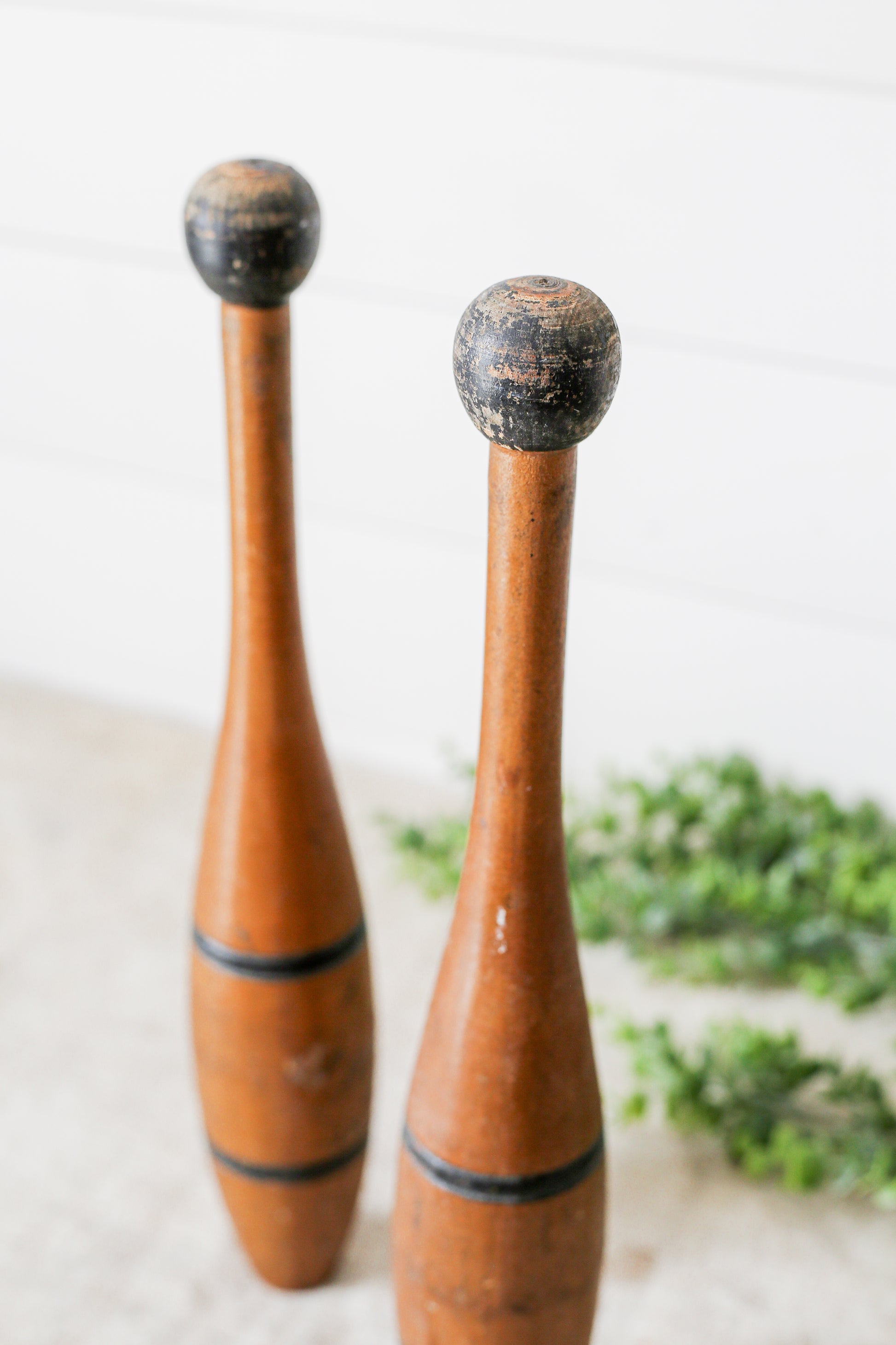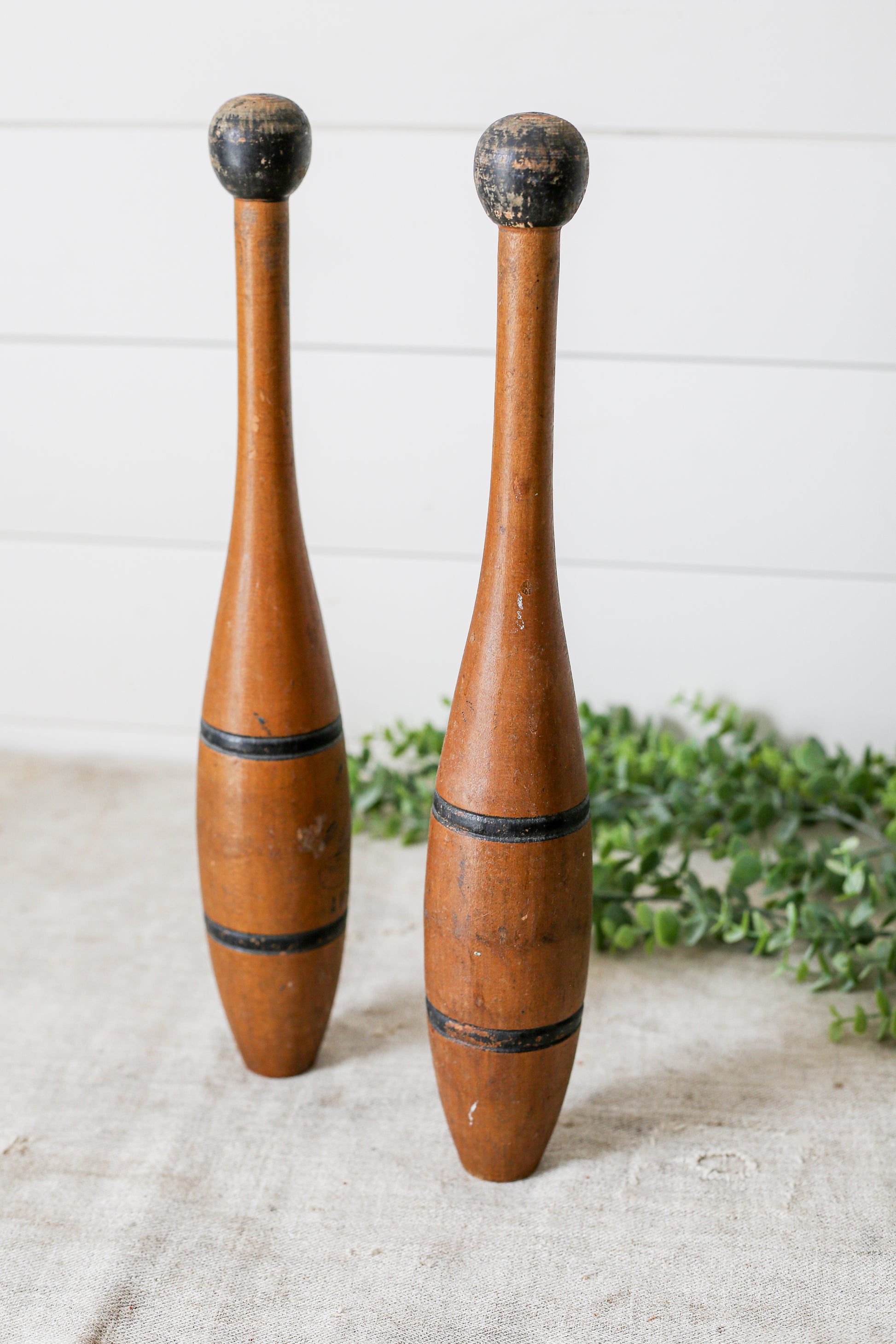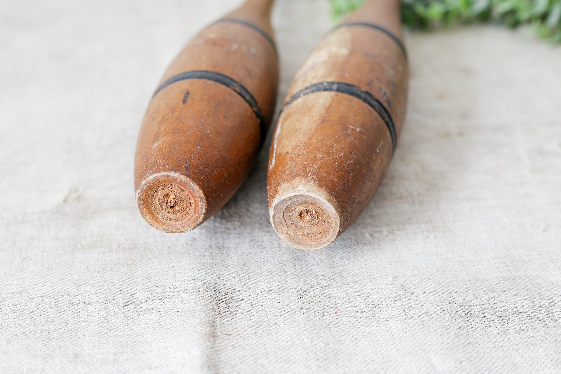 Available is a matching pair of two wooden 1 lb. juggling pins. These vintage clubs were used in circus performances or as exercise tools. They make great rustic decor statement pieces.