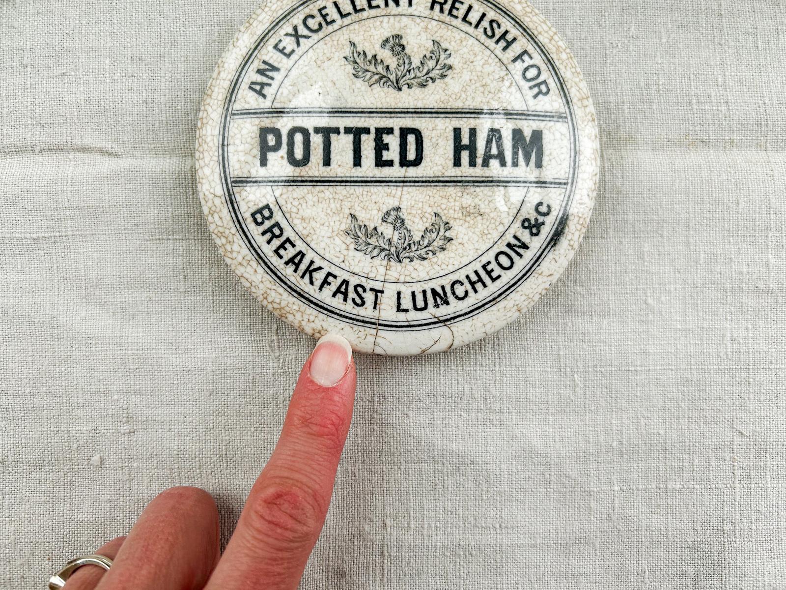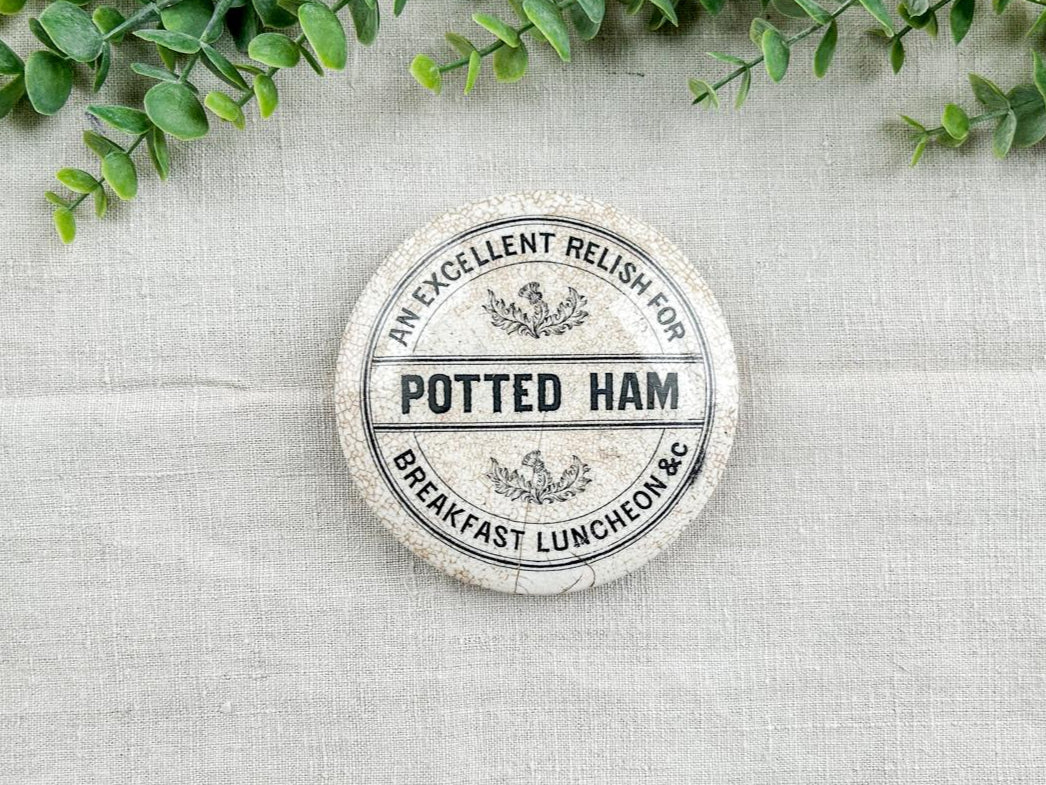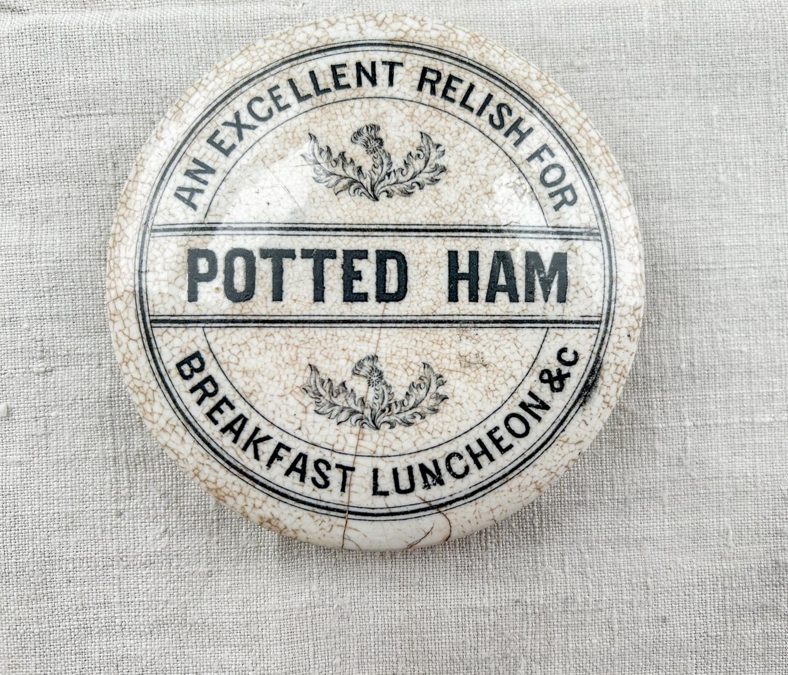 Attractive design with thistles and script that reads "Potted Ham, an excellent relish for breakfast luncheon &c". No base included.