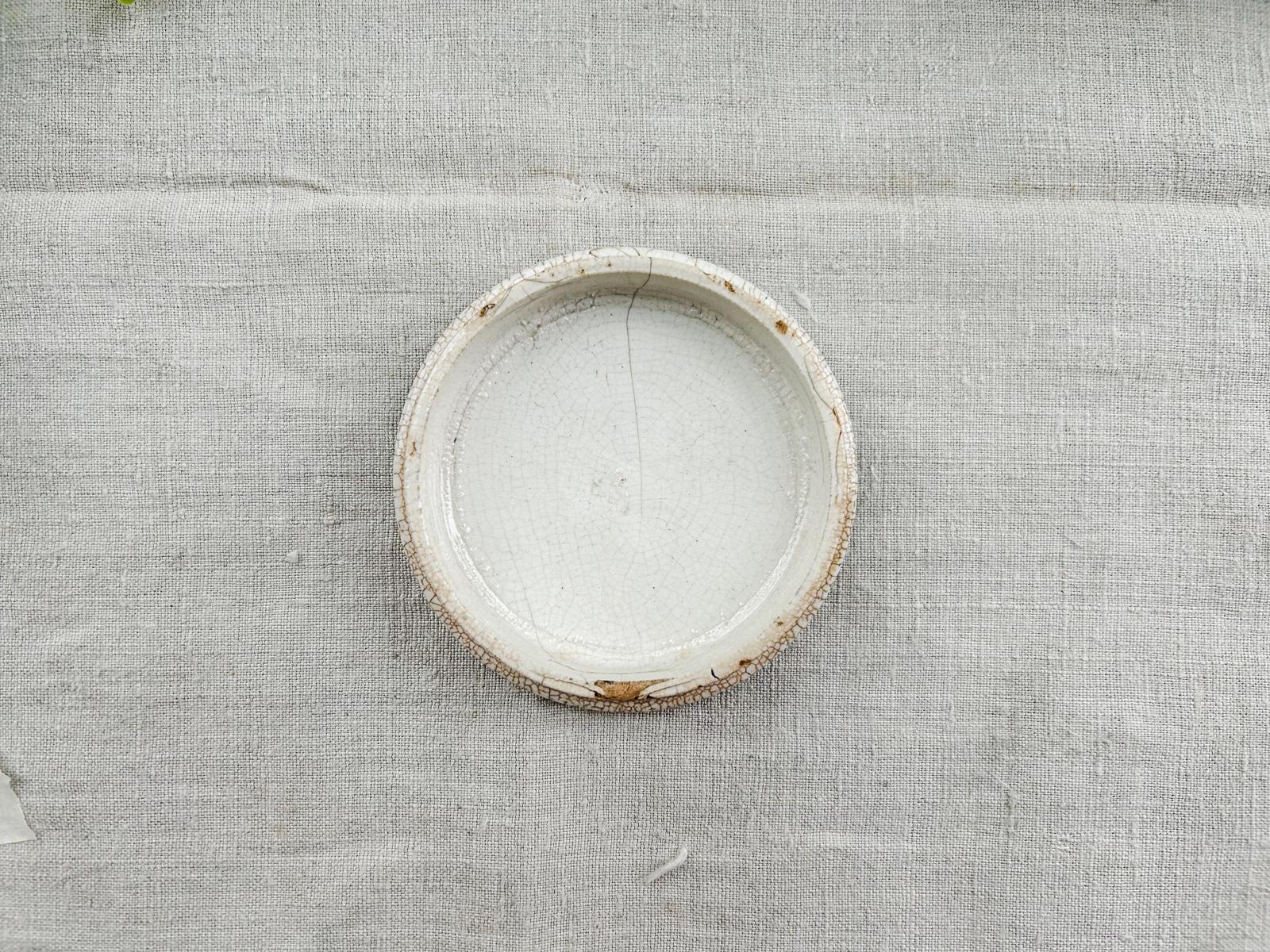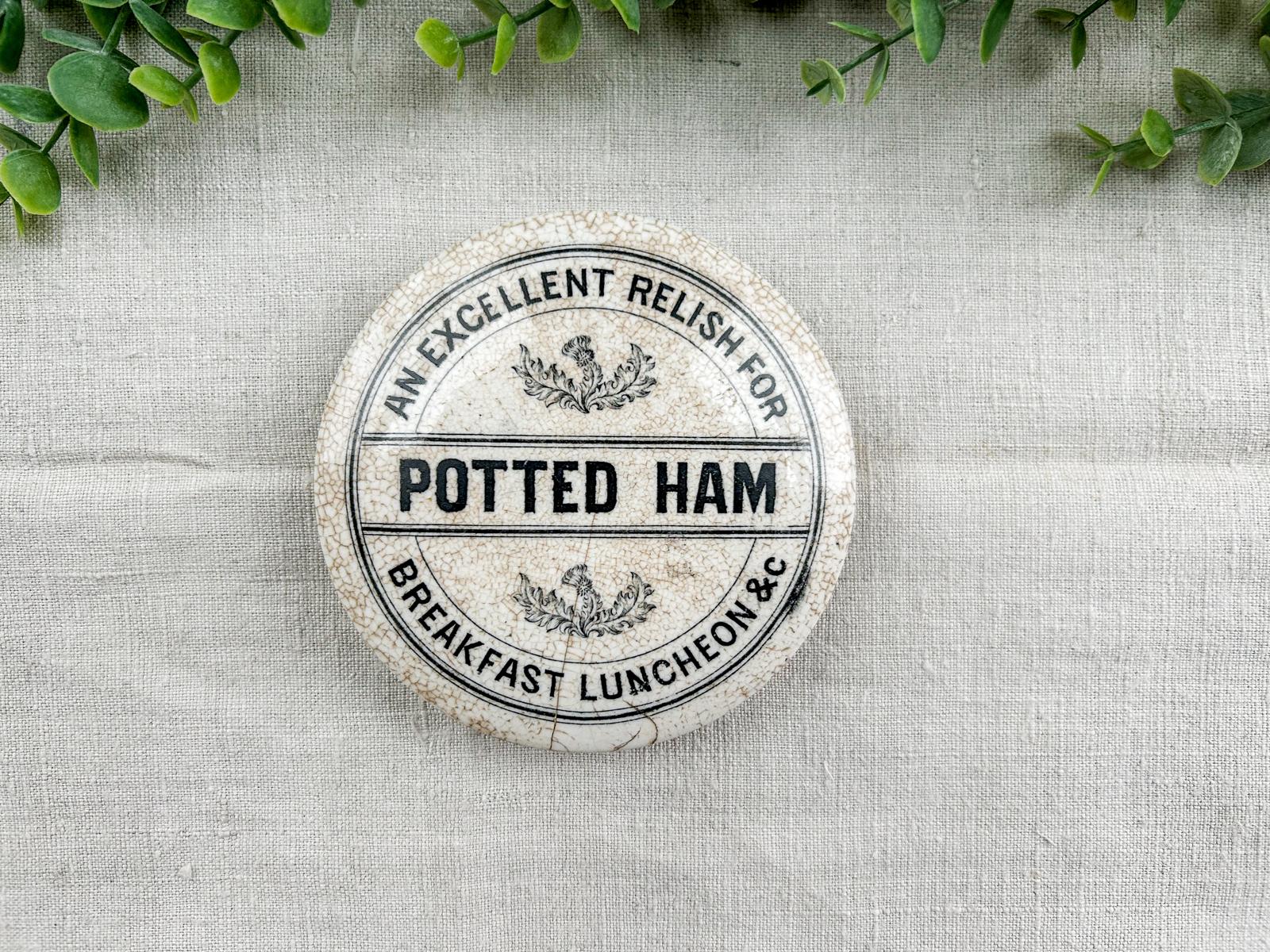 Antique potted ham meat pot lid featuring classic stoneware design. A collectible piece of culinary history, often used for preserving meats in the 19th and early 20th centuries.