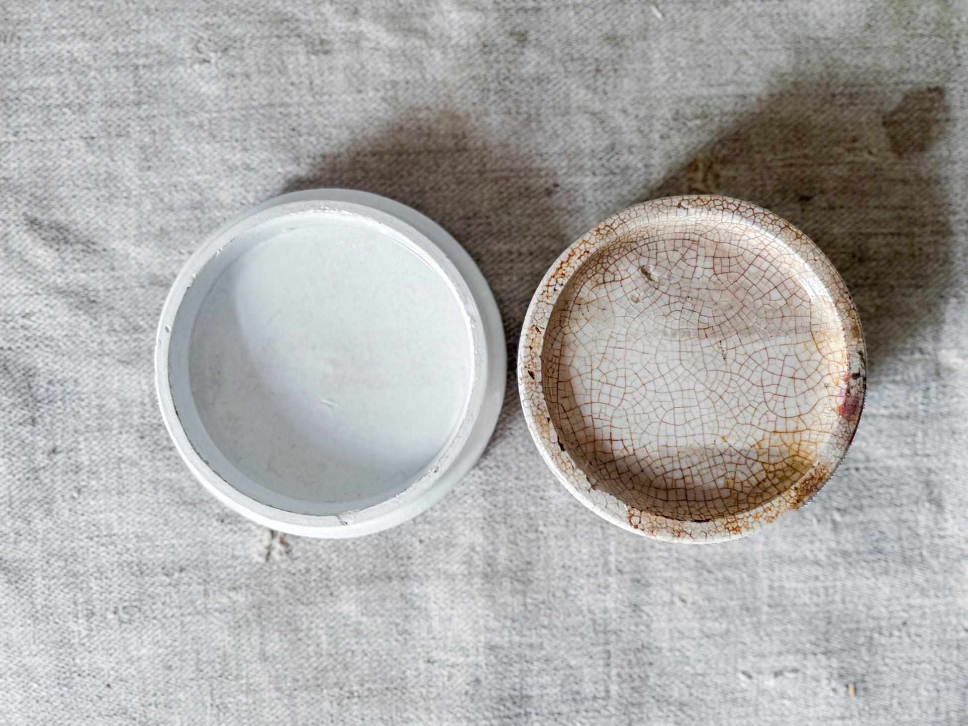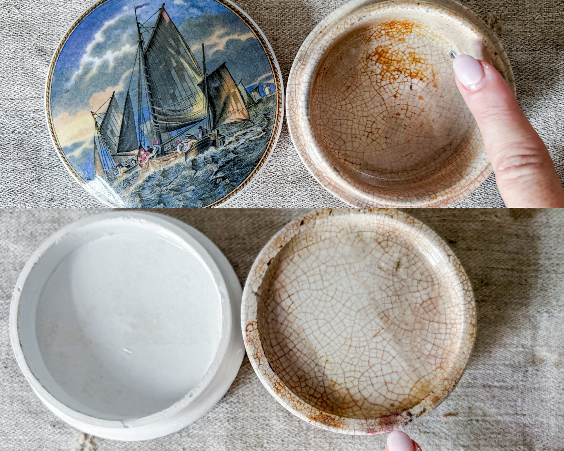 The lid and base are both crazed, but the base is heavily stained, while the lid remains clean. Great display piece for an maritime vignette.