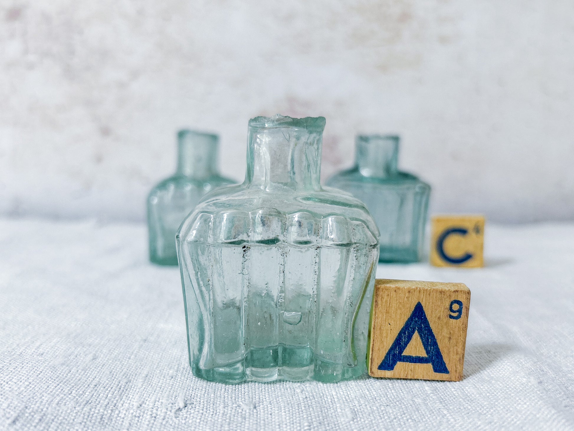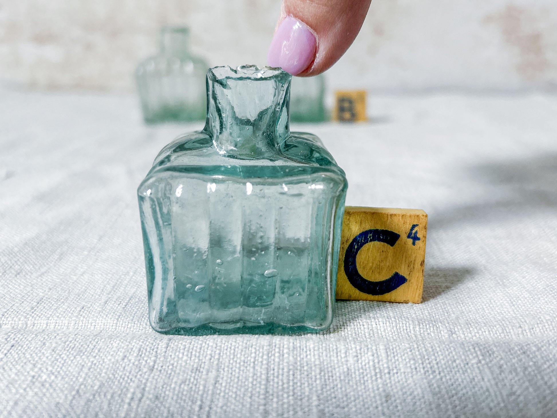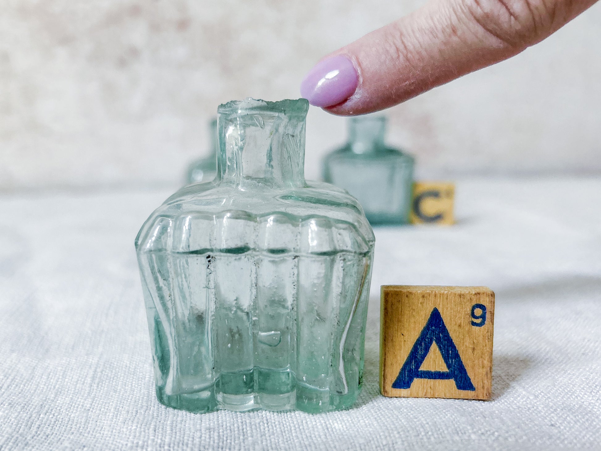 CHOICE Antique English Aqua Glass Ribbed Inkwells