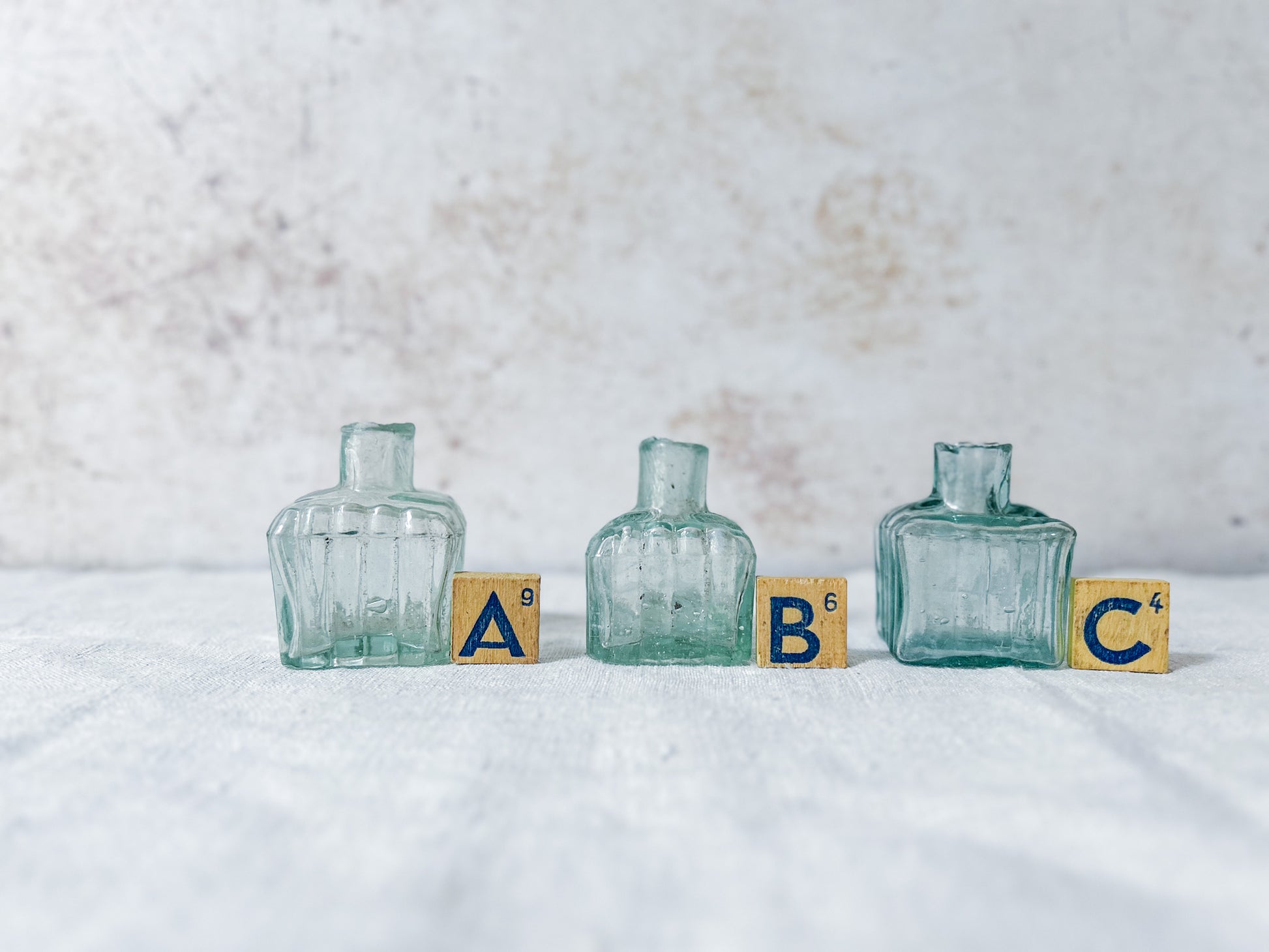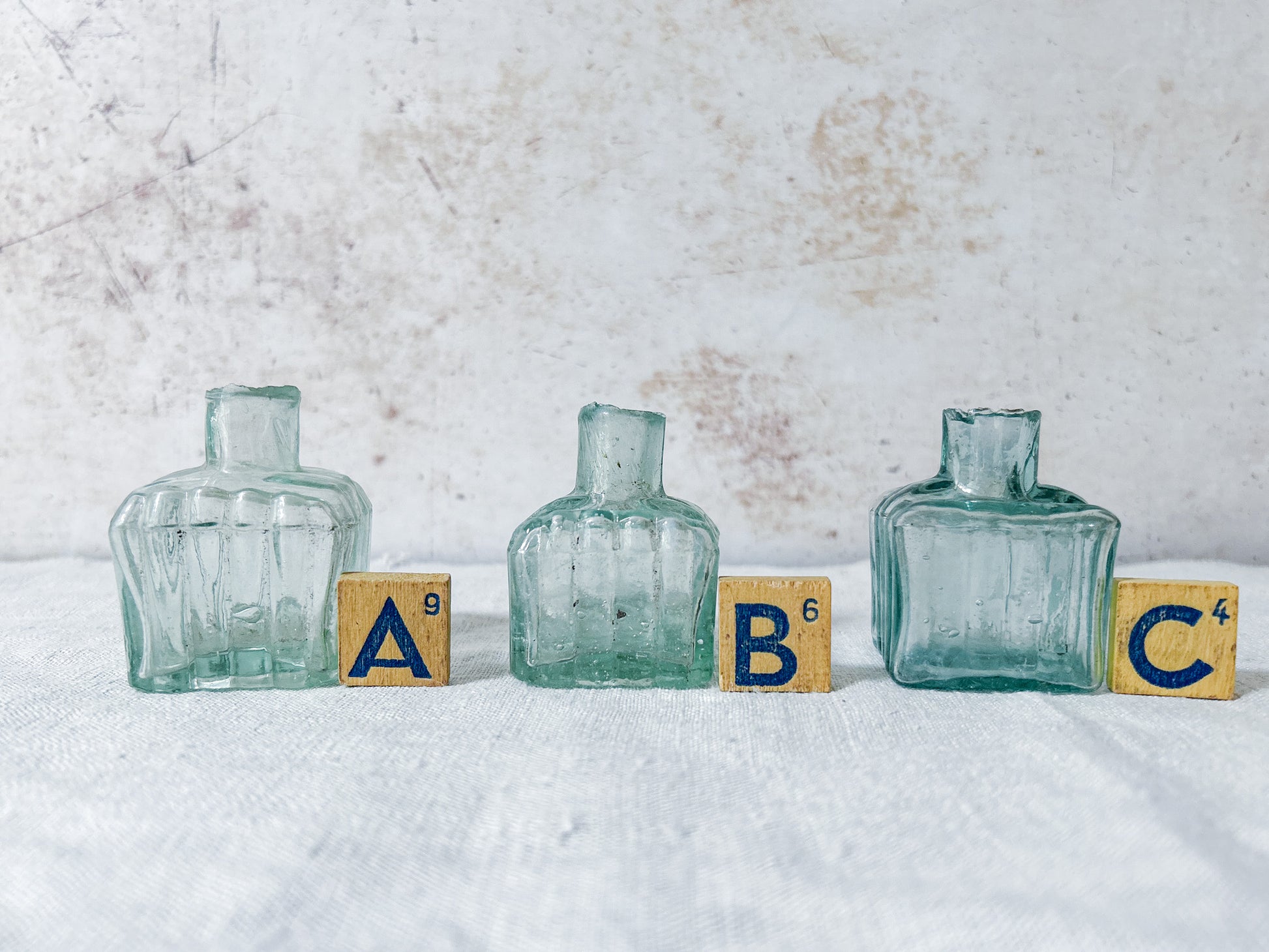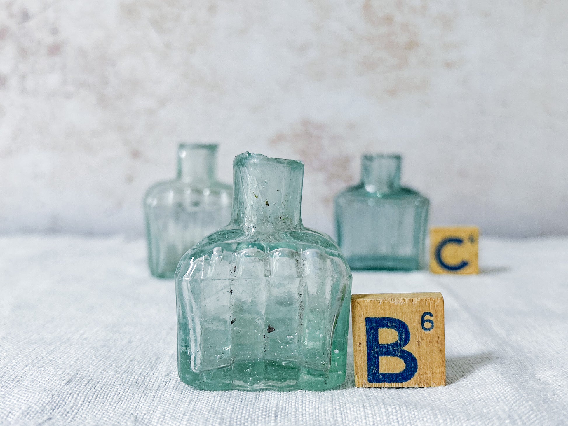 CHOICE Antique English Aqua Glass Ribbed Inkwells