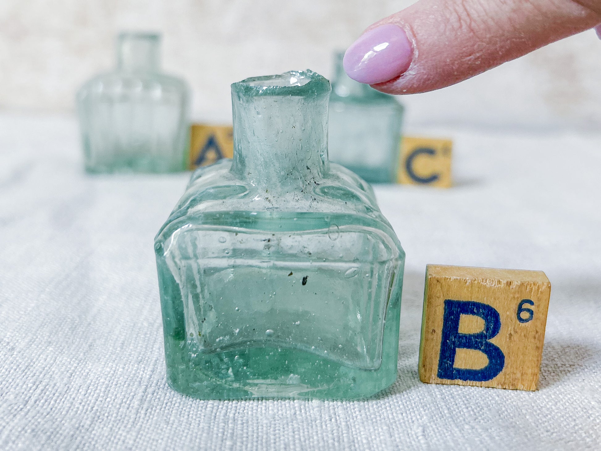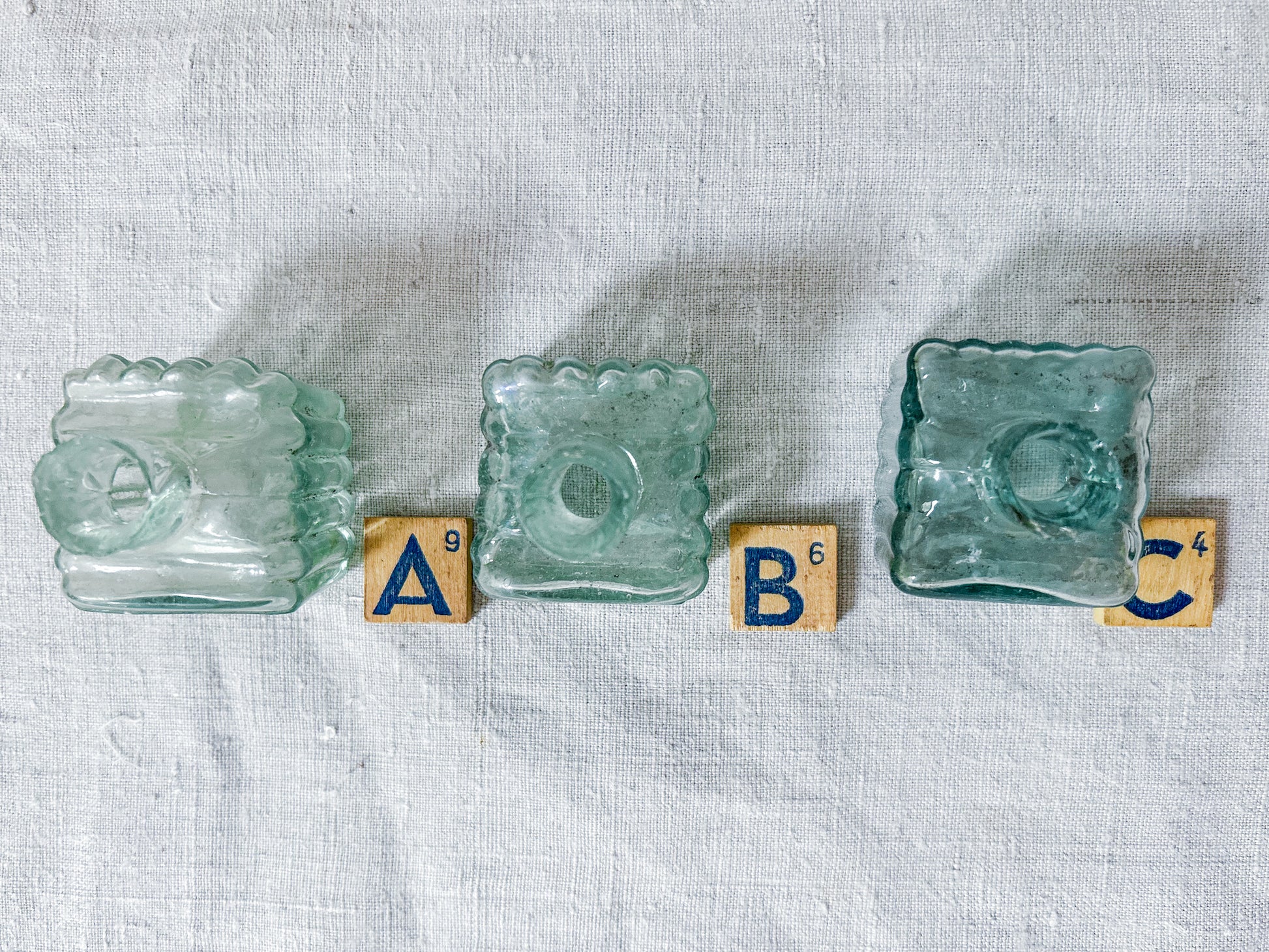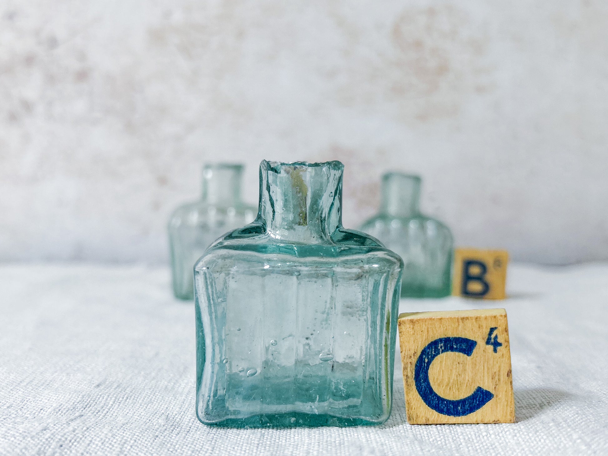Available is your choice of three antique English inkwells. These all have ribbed sides and are square shaped. Sheared glass tops and beautiful soft aqua green color.