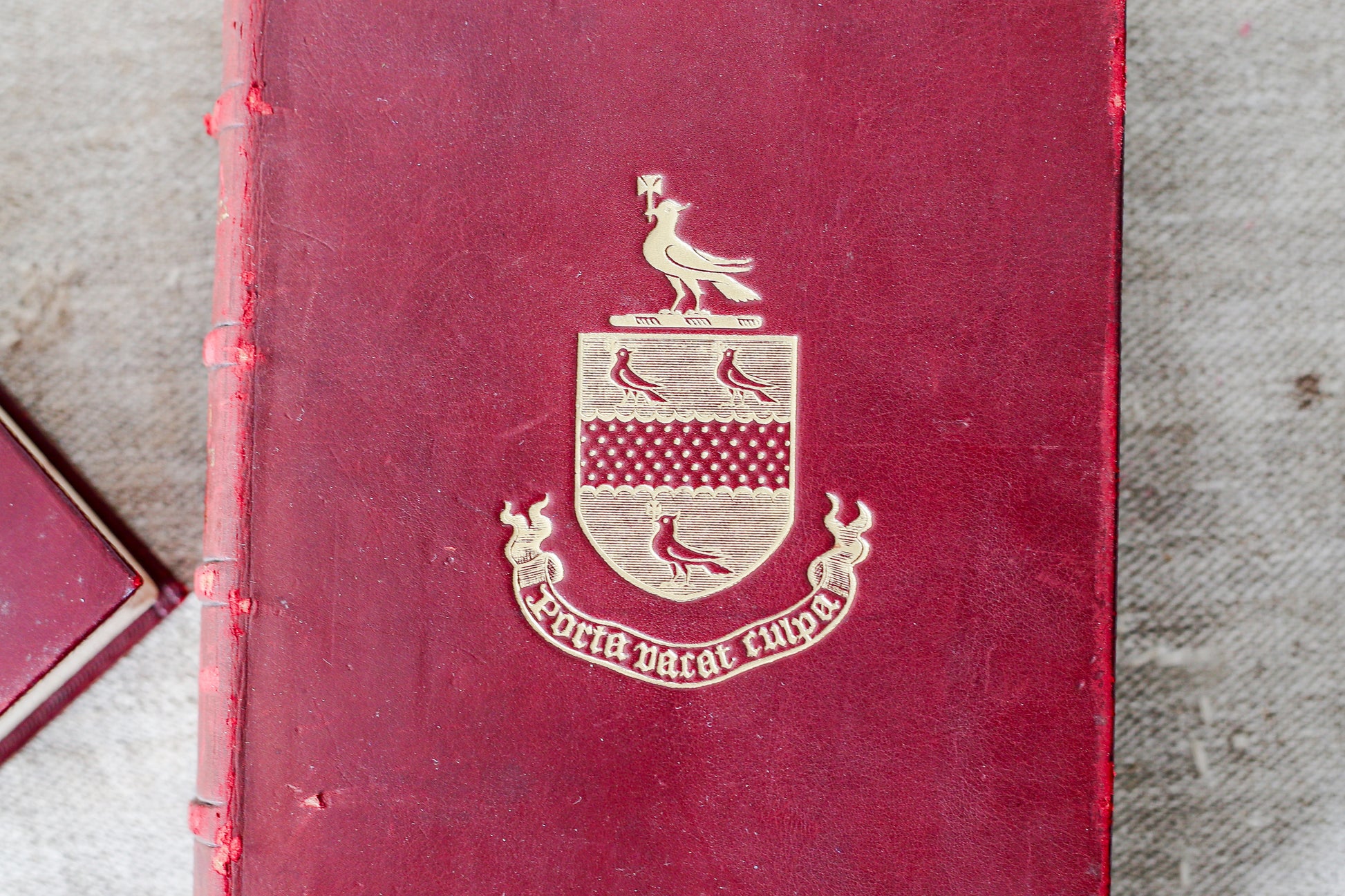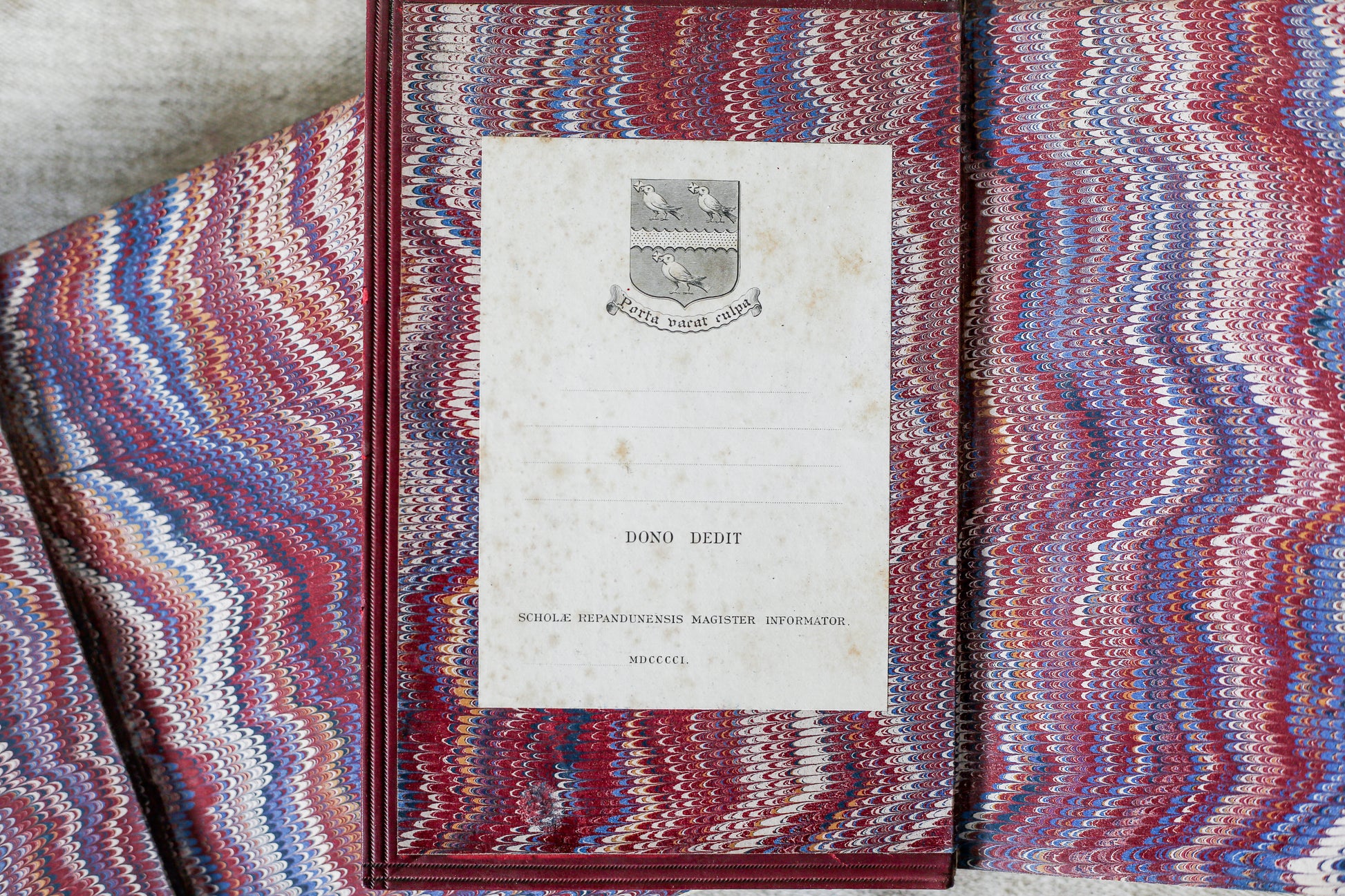 Set of two antique books, given as school prize to pupils. Full red calf prize binding with Repton School crest gilt-stamped to front board and spine, with raised bands and gilt lettering to the latter; marbled endpapers, top edge gilt.