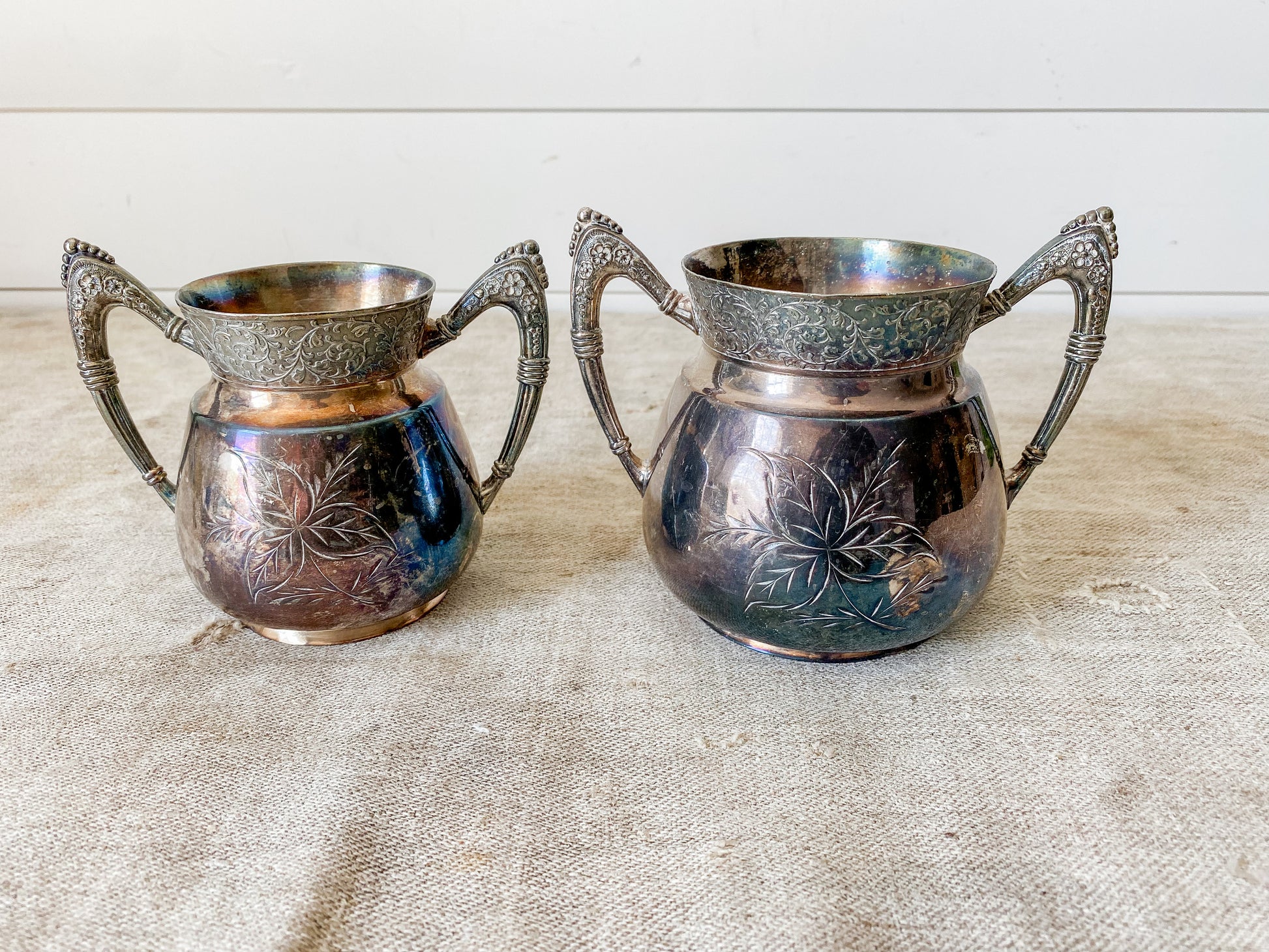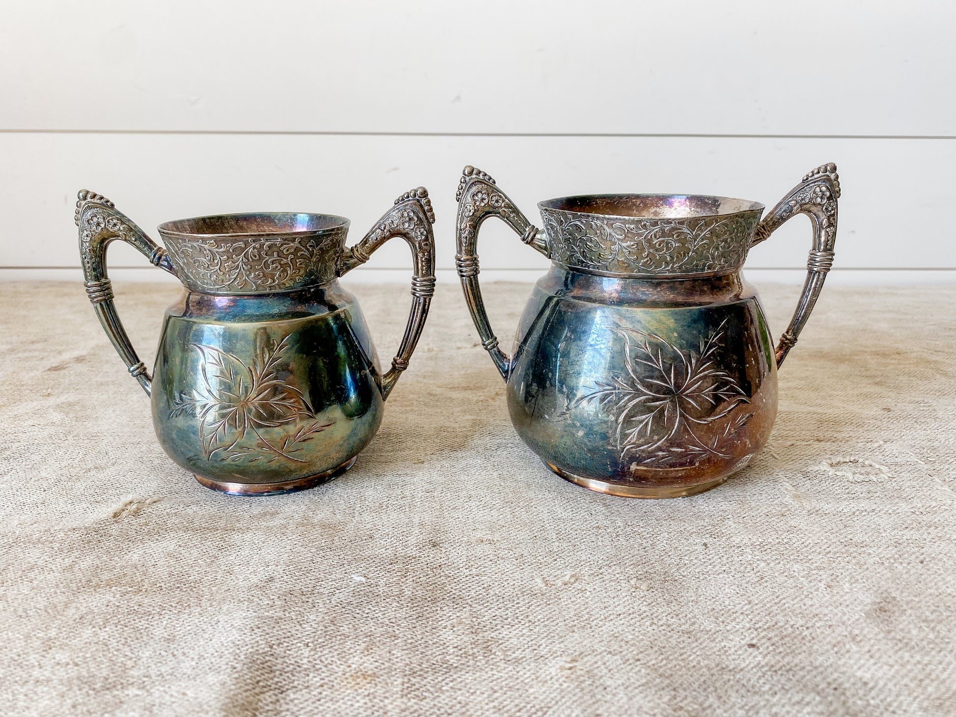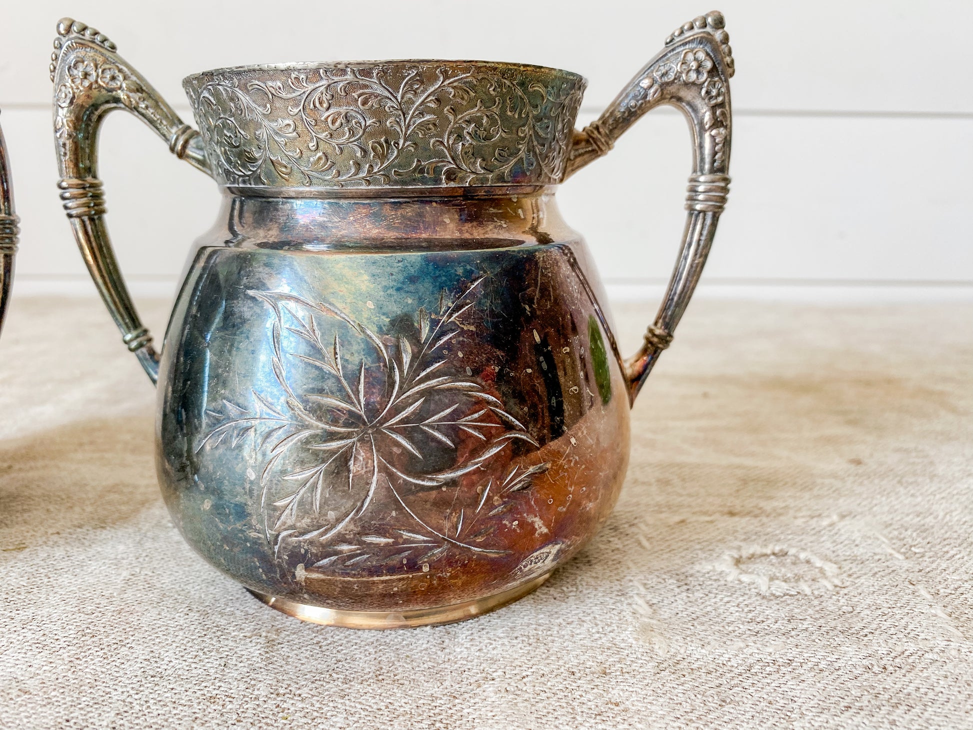 Available is a beautiful pair of 2 matching silver plate sugar bowls. Each has gorgeous patina, with etched floral details on front and back and trophy style handles with raised floral motifs.