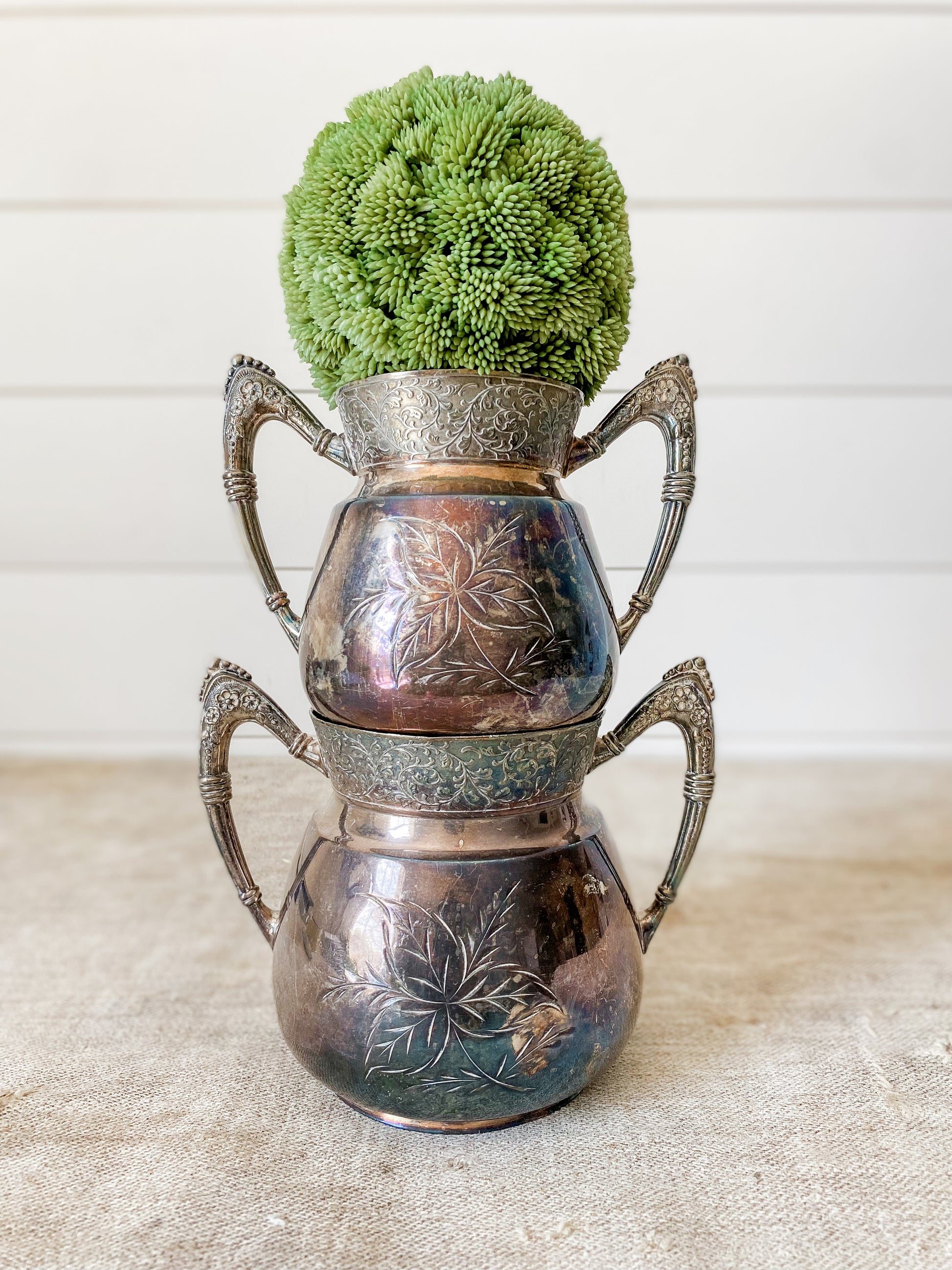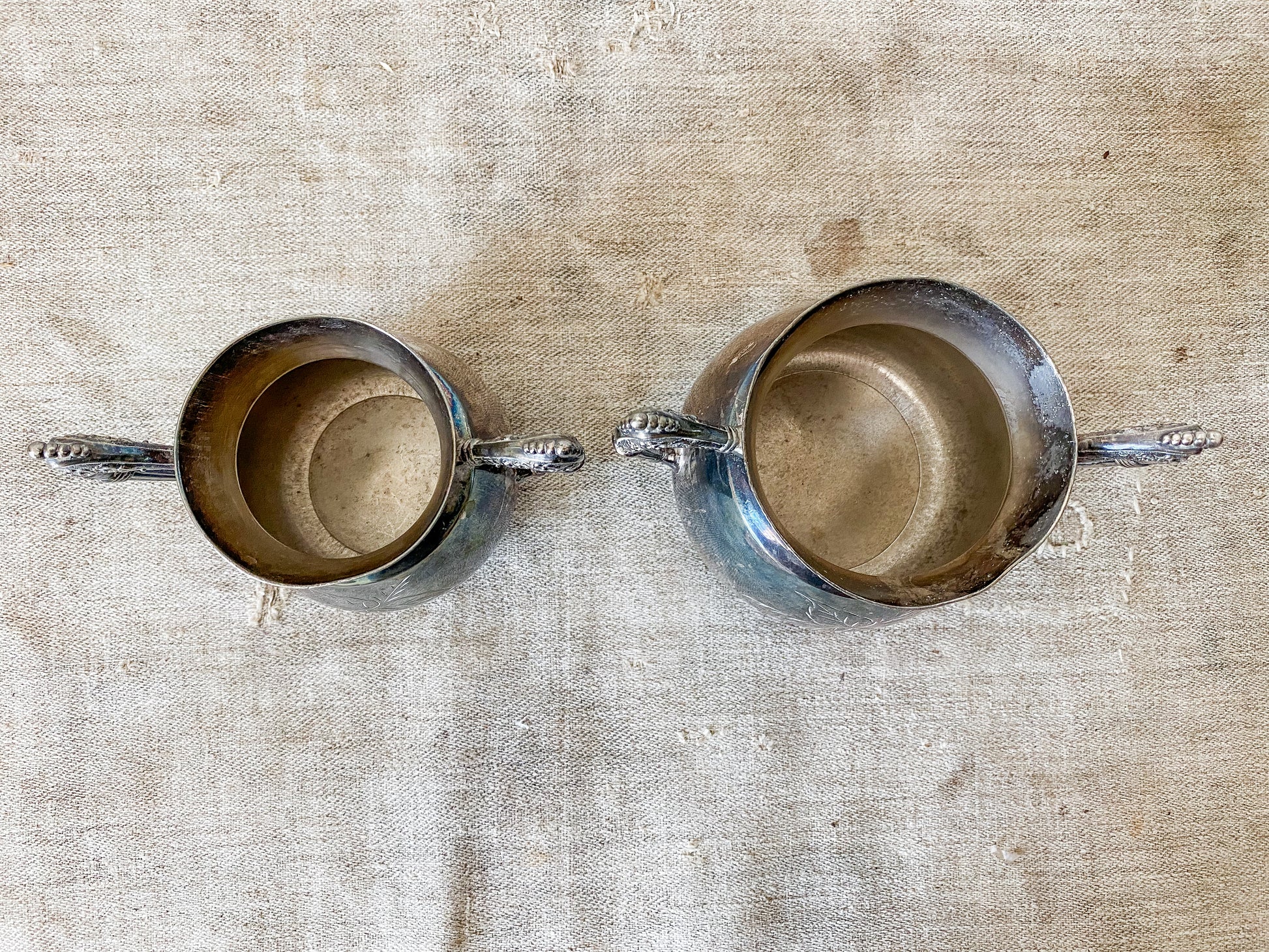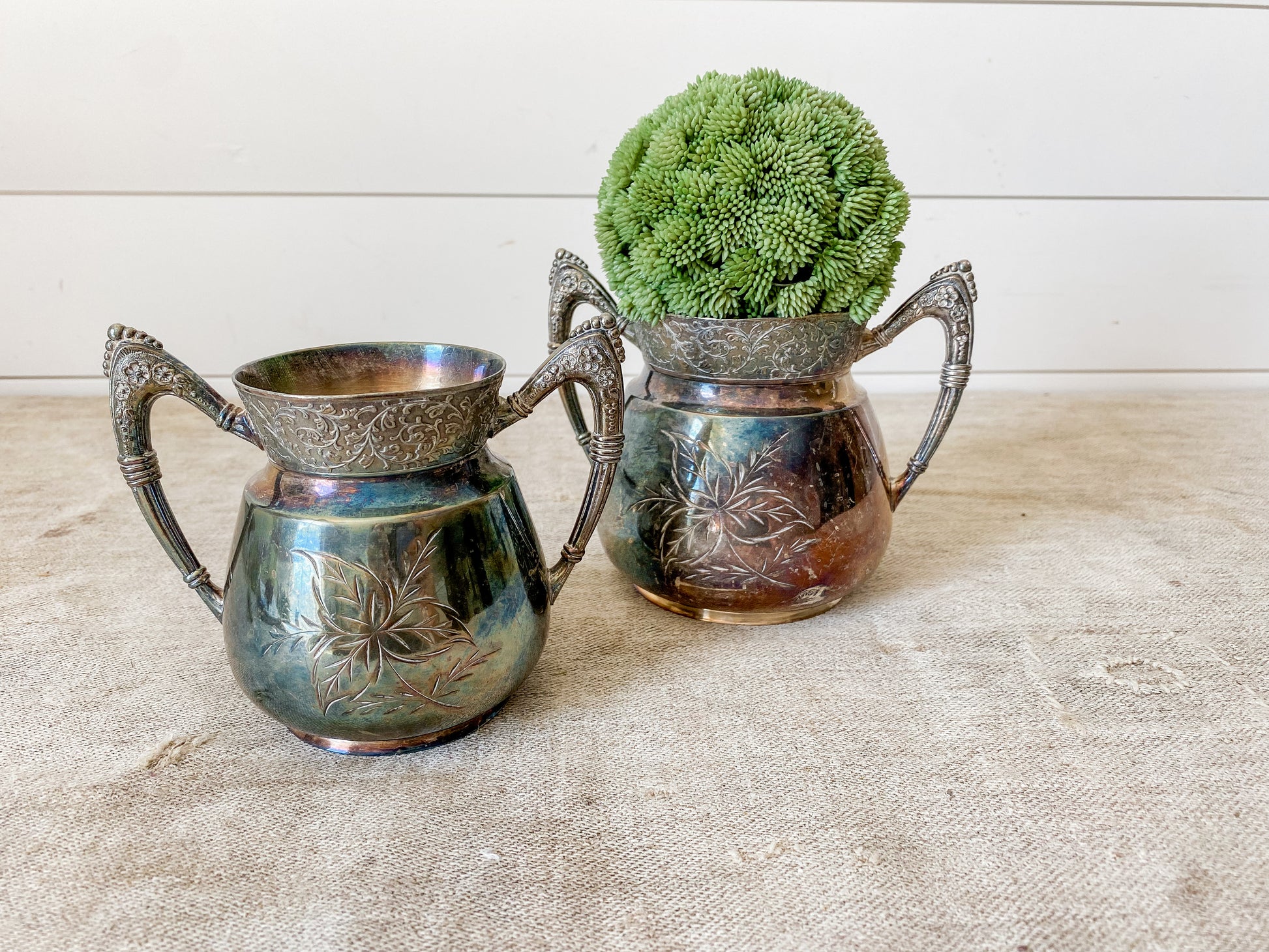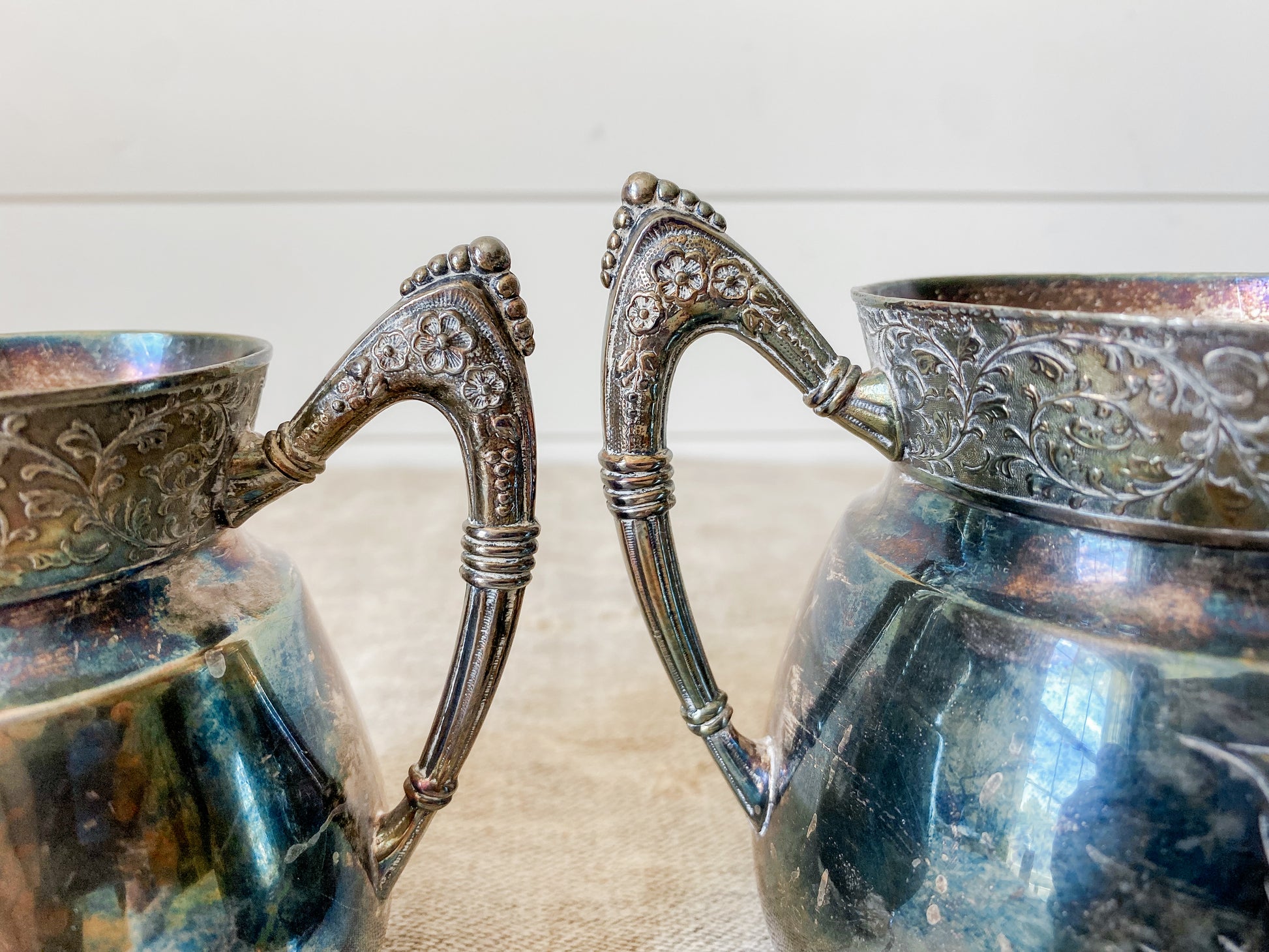 Available is a beautiful pair of 2 matching silver plate sugar bowls. Each has gorgeous patina, with etched floral details on front and back and trophy style handles with raised floral motifs.