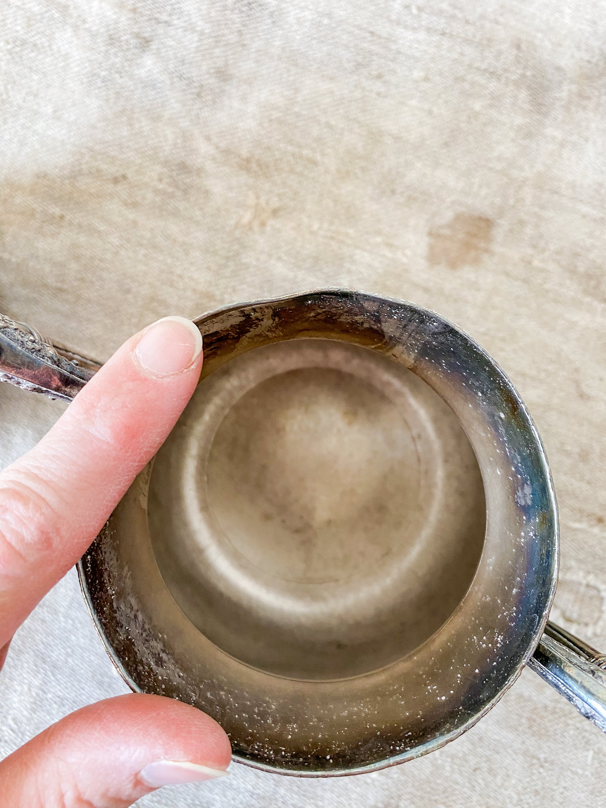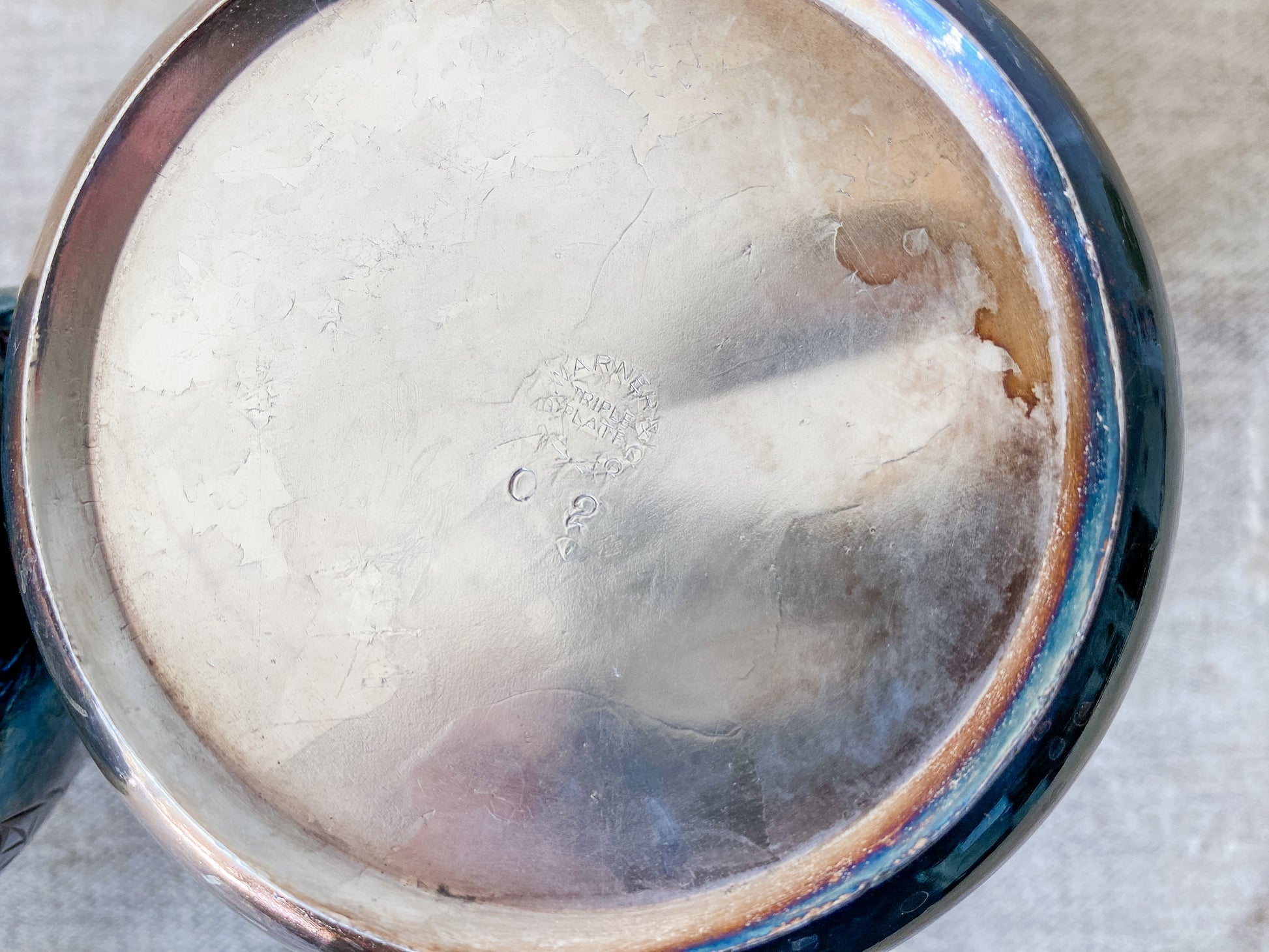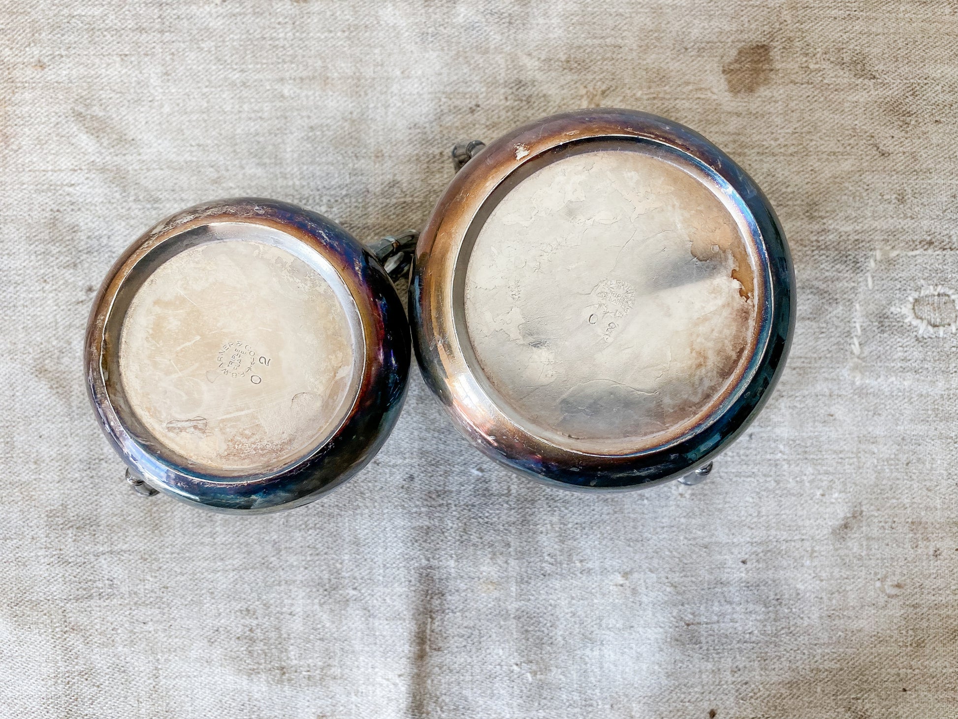 They are slightly different sizes, which adds interest, especially when stacked for display as shown in the last photo. The larger one has some flattening to the opening rim and a small dent in the side. Base is stamped "Warner Triple Plate Co."