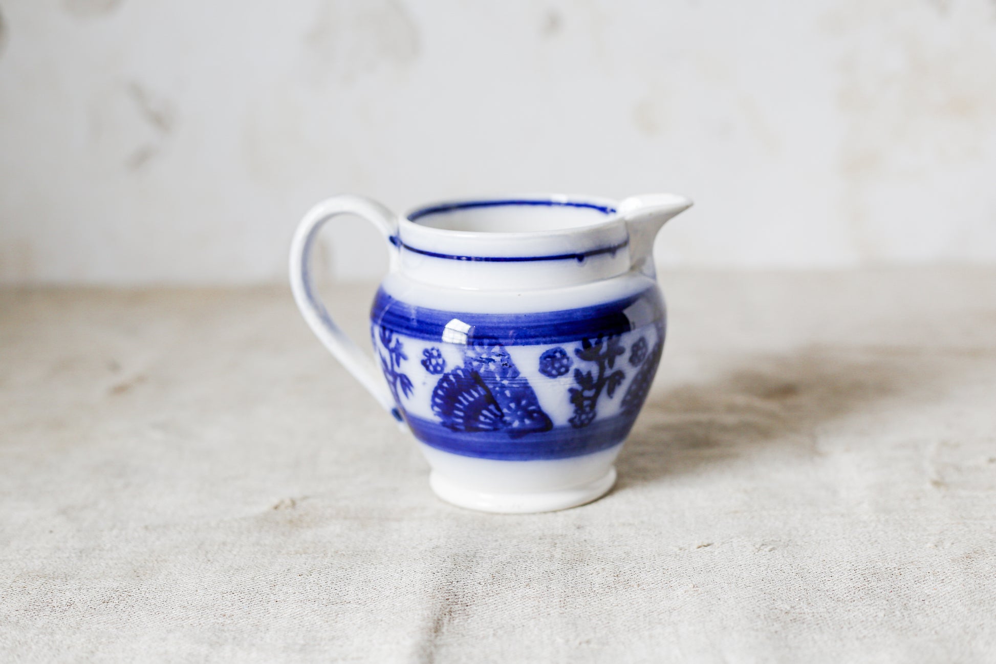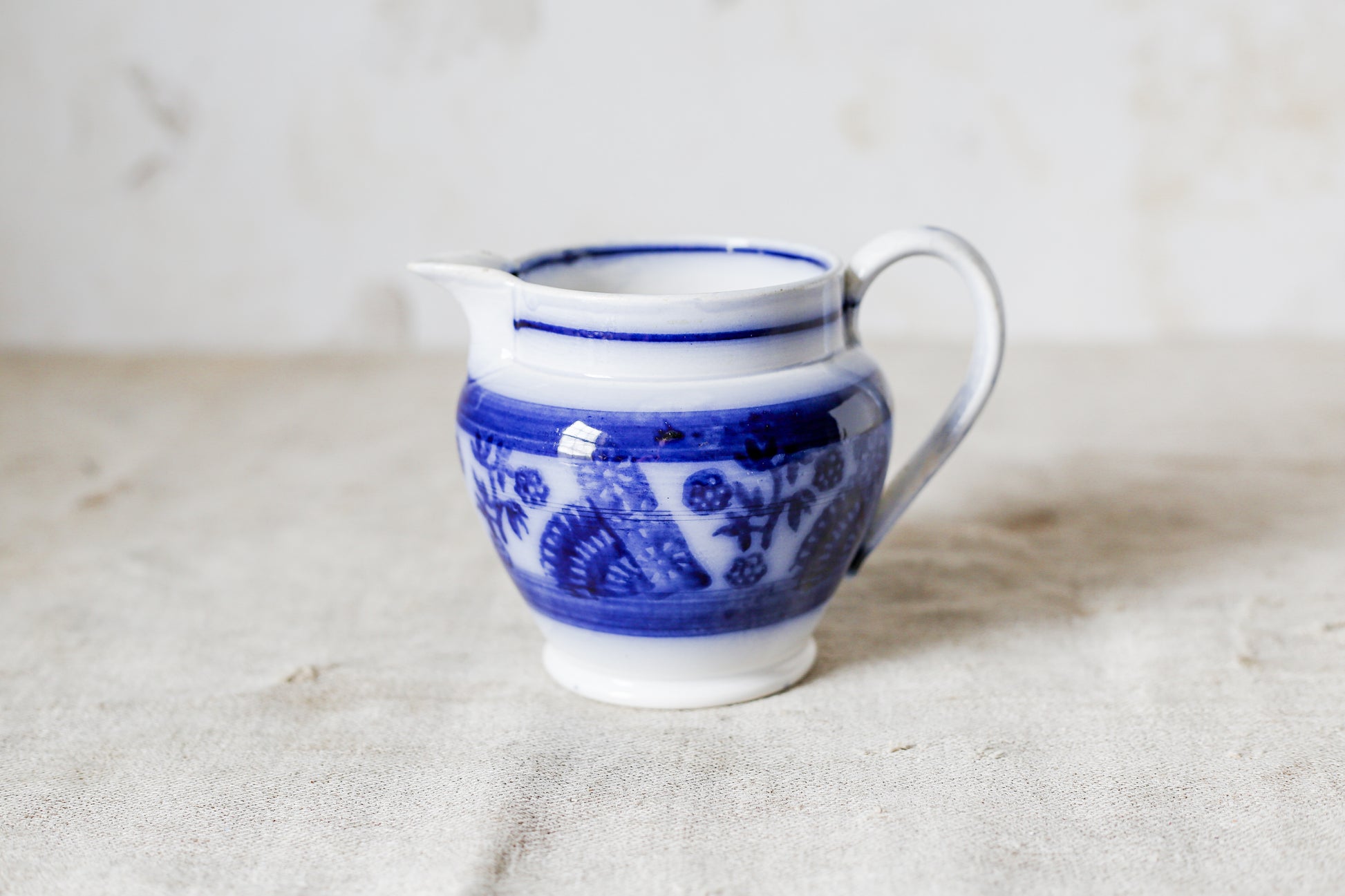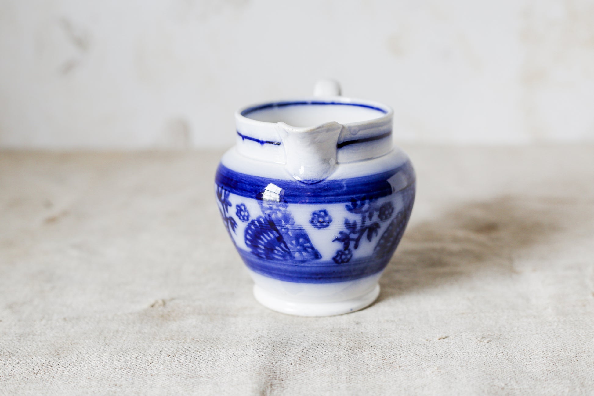 Available is an antique ironstone cream pitcher. The flow blue transferware pattern has chinoiserie style fans and flowers, with blue bands around the body and top rim of the pitcher. Lovely small size with curved handle. No maker's stamp. Exact age unknown.