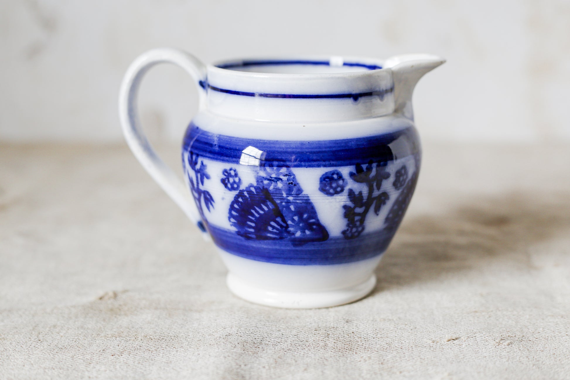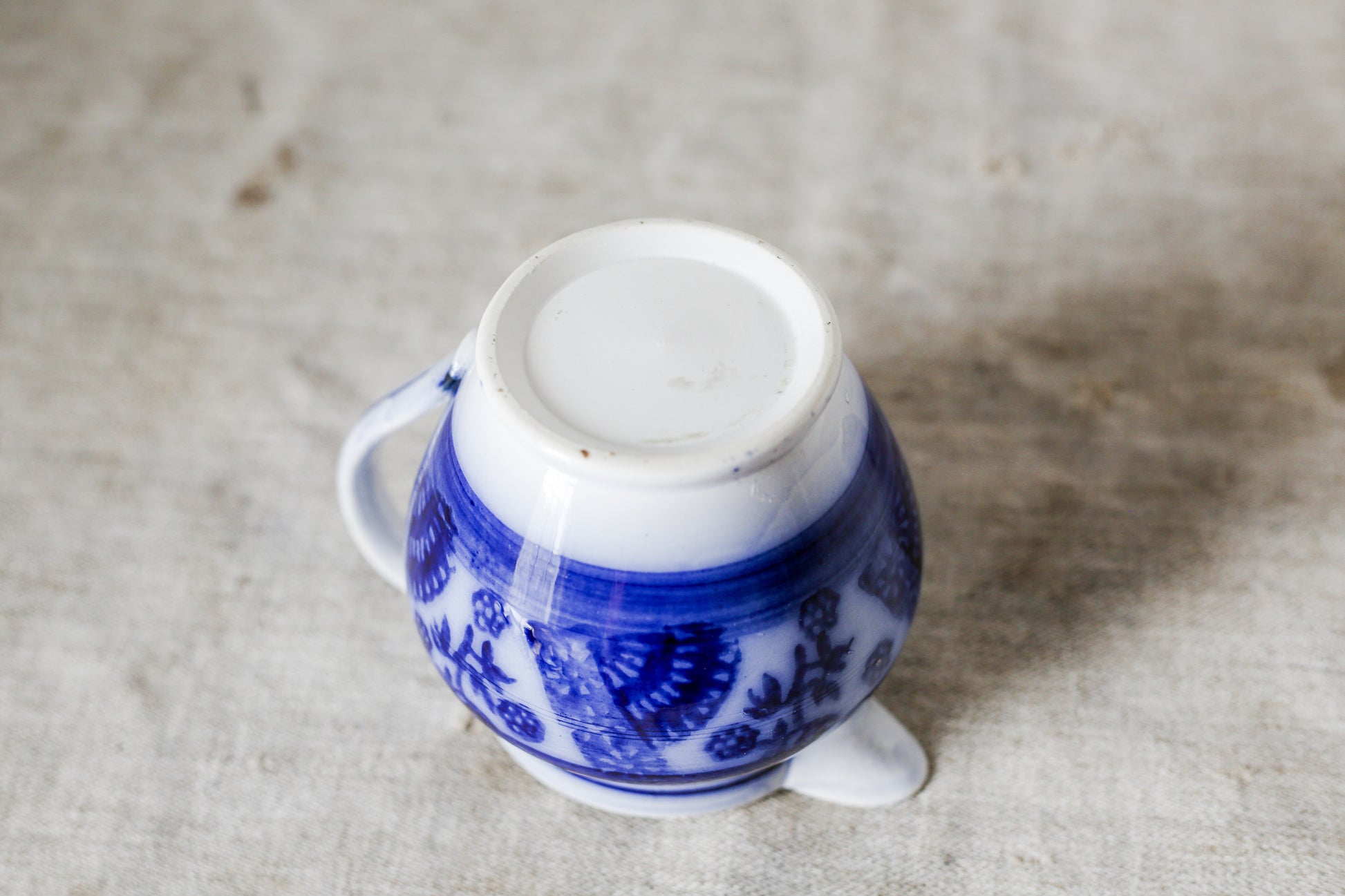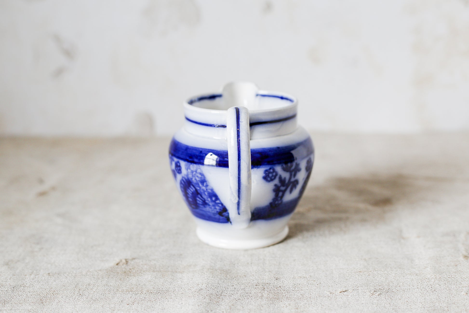 Available is an antique ironstone cream pitcher. The flow blue transferware pattern has chinoiserie style fans and flowers, with blue bands around the body and top rim of the pitcher. Lovely small size with curved handle. No maker's stamp. Exact age unknown.