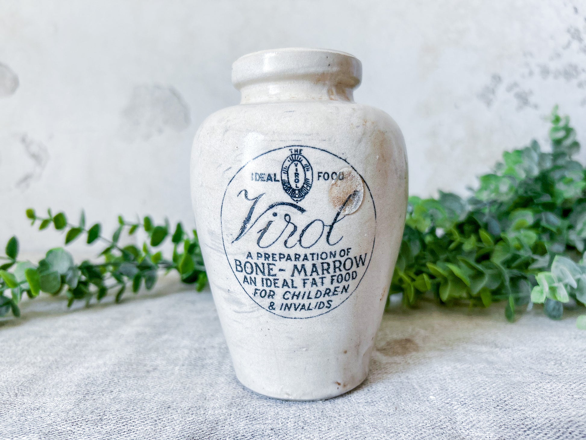 Available is an antique Virol bone marrow pot, salvaged from a Victorian dump site in England. Virol was a food supplement advertised for nutritional support of children and invalids.