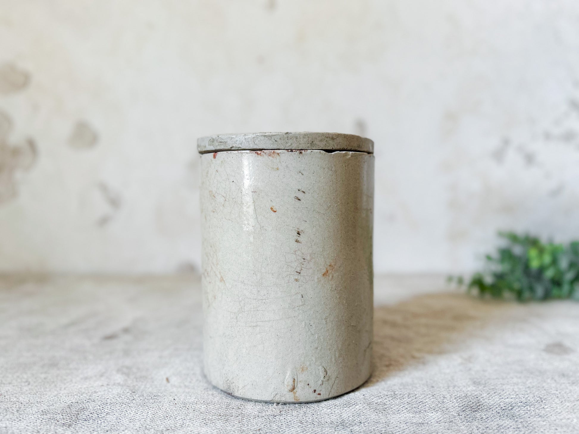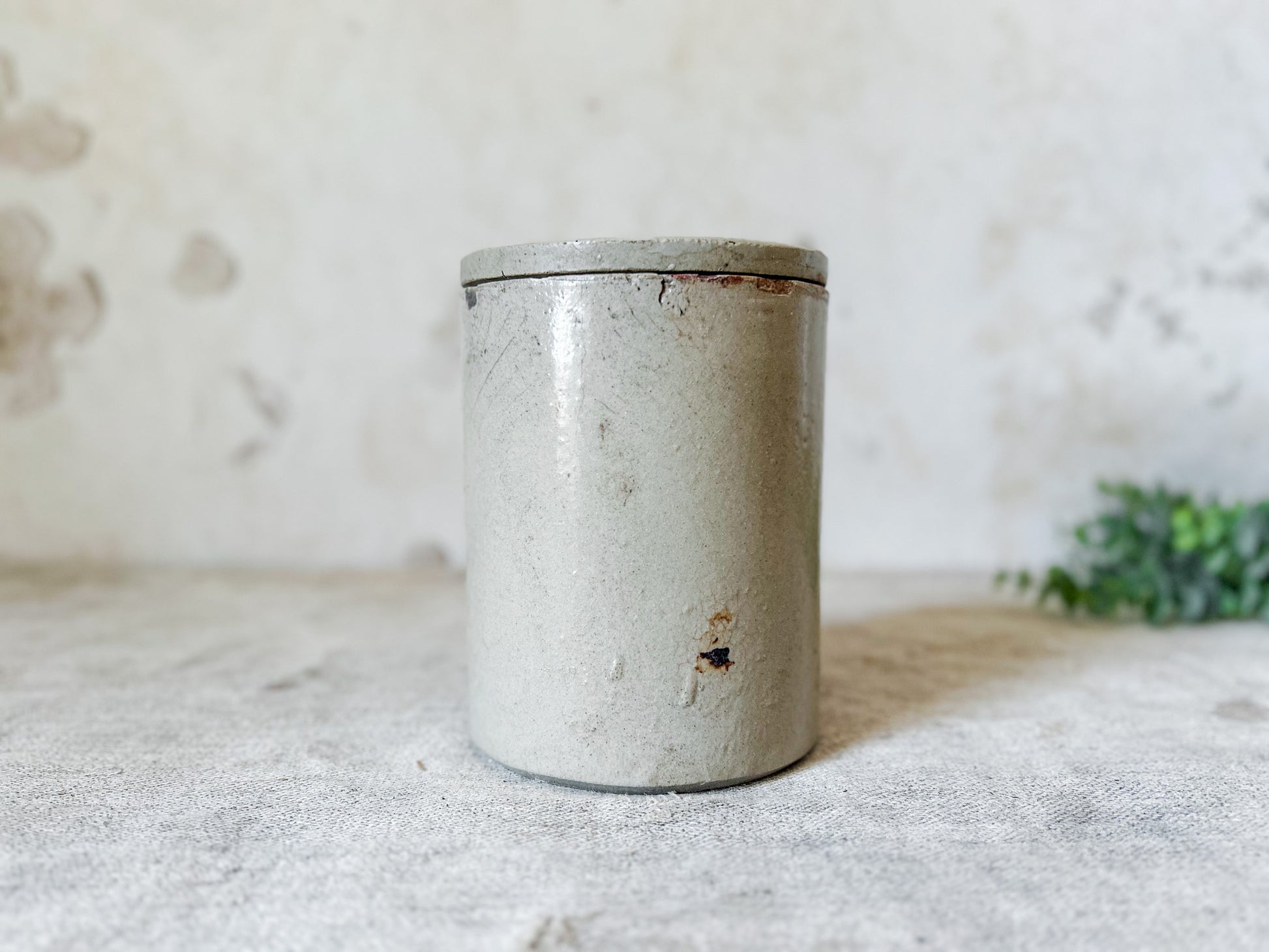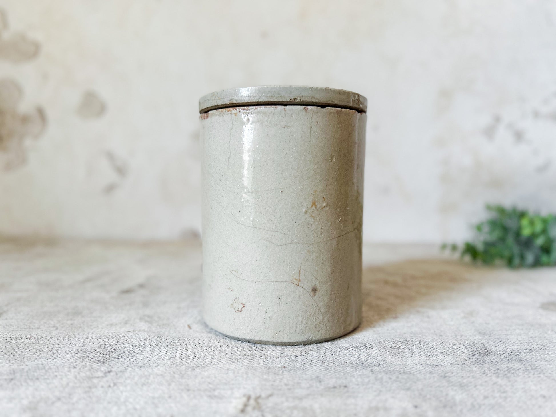 Available is an antique storage jar with cool neutral matte glaze. This piece was used as a pantry crock and includes the original lid. The lid sits on top and is not secured to the top.