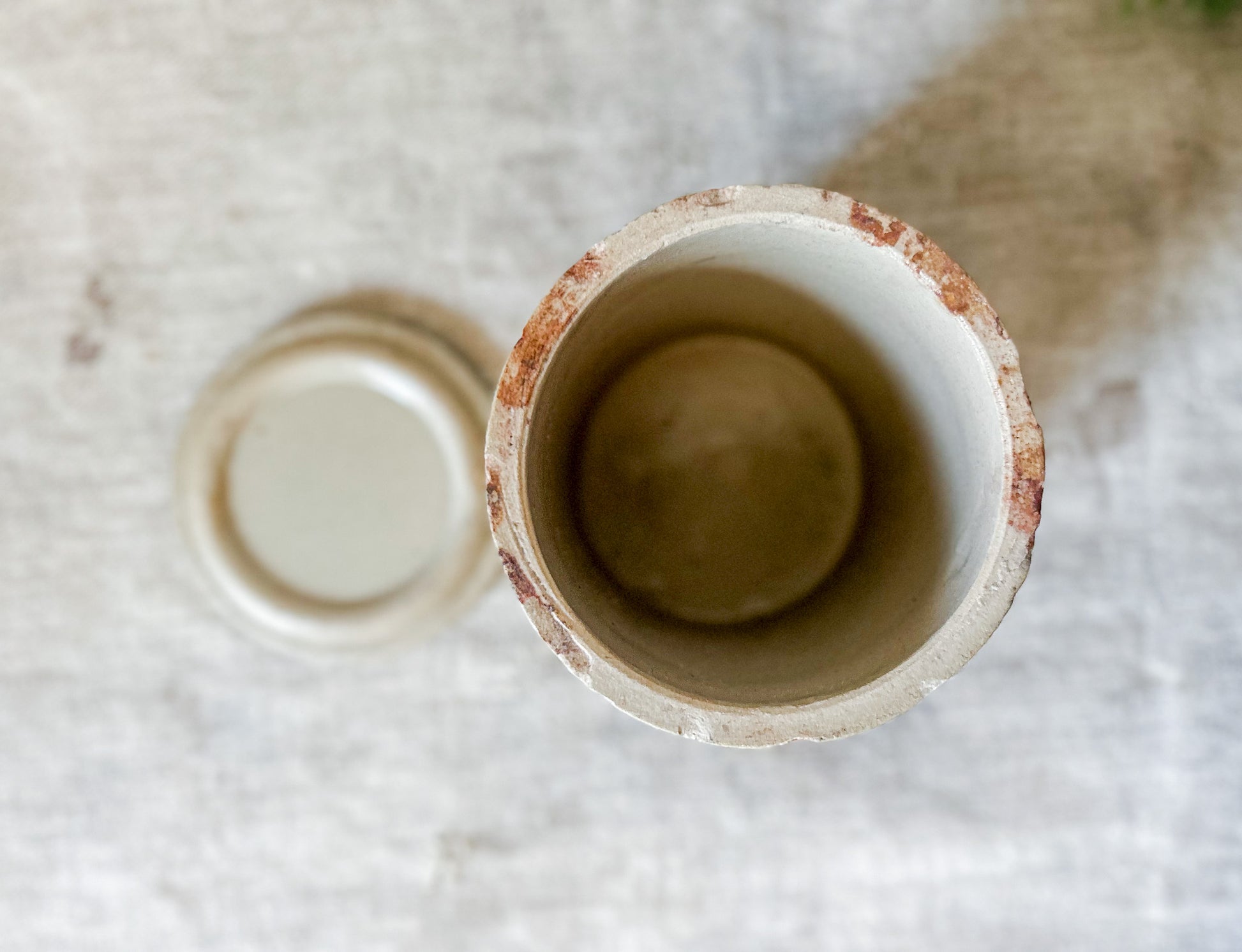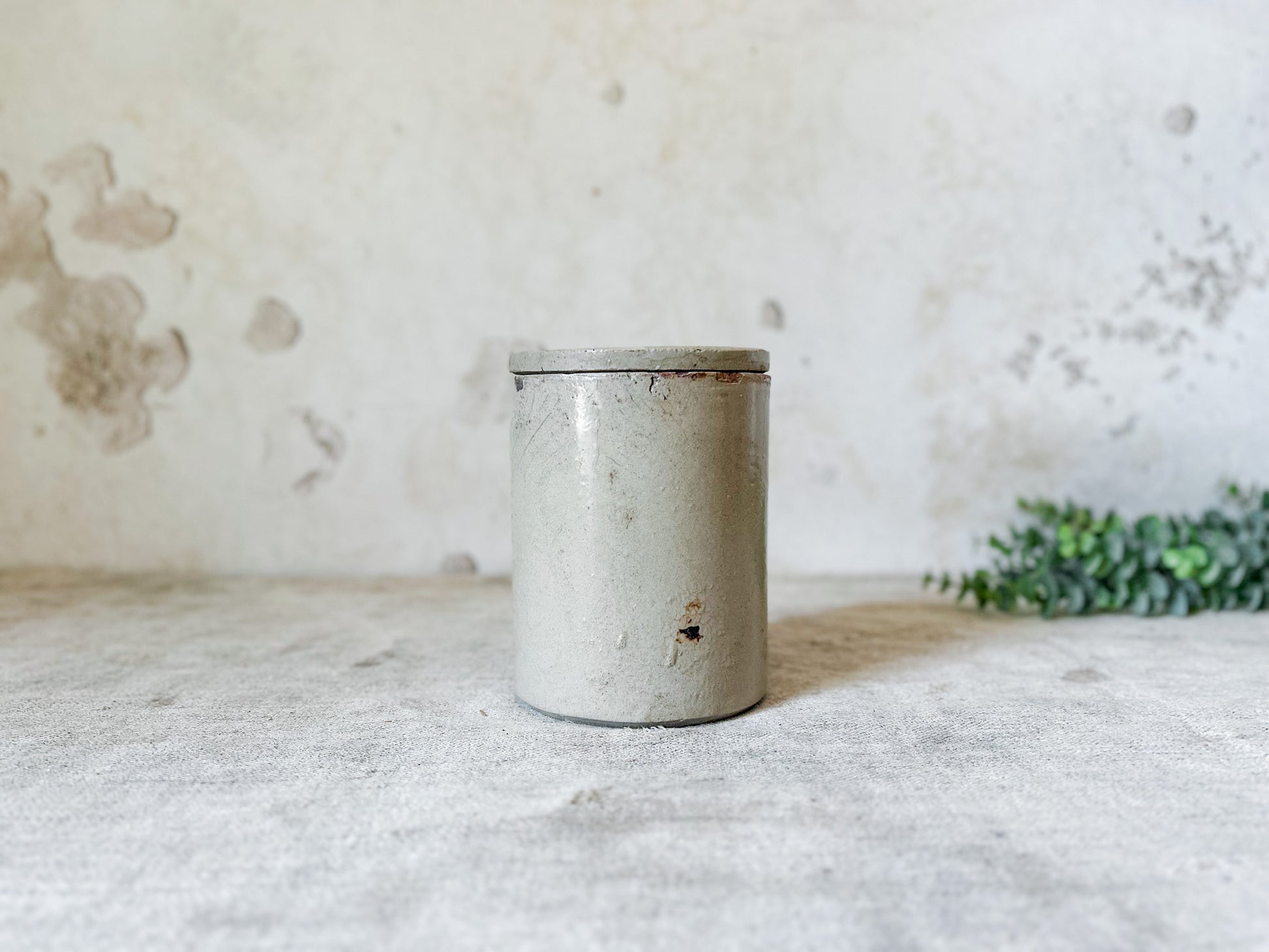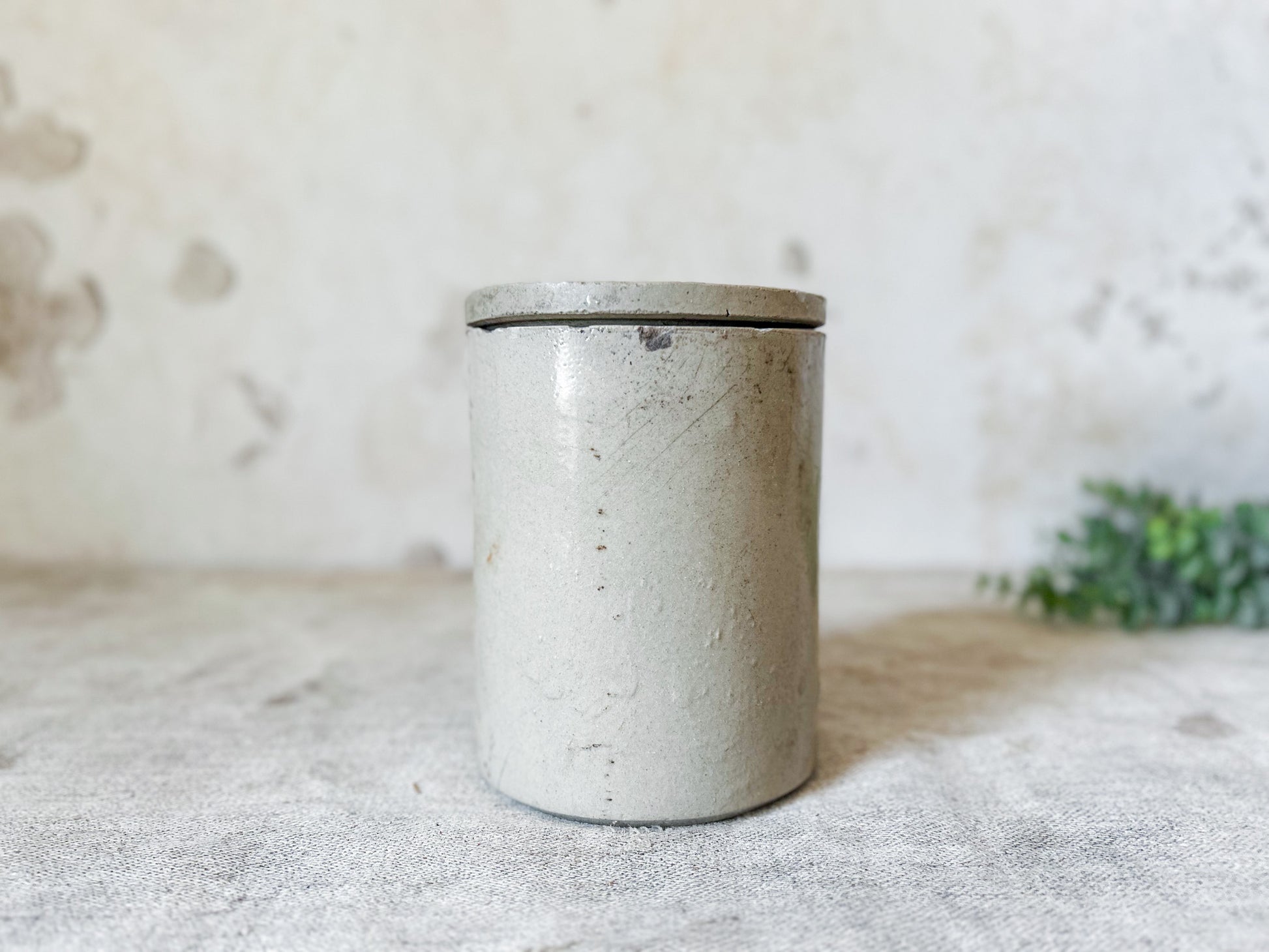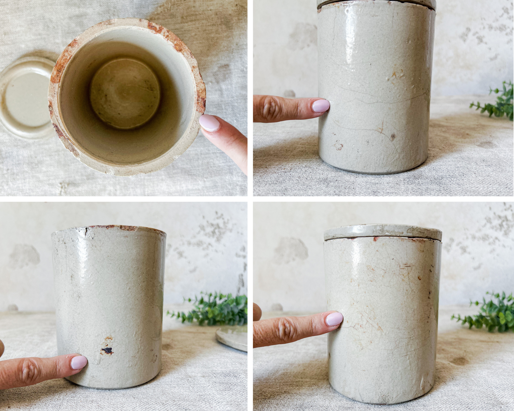 Available is an antique storage jar with cool neutral matte glaze. This piece was used as a pantry crock and includes the original lid. The lid sits on top and is not secured to the top.