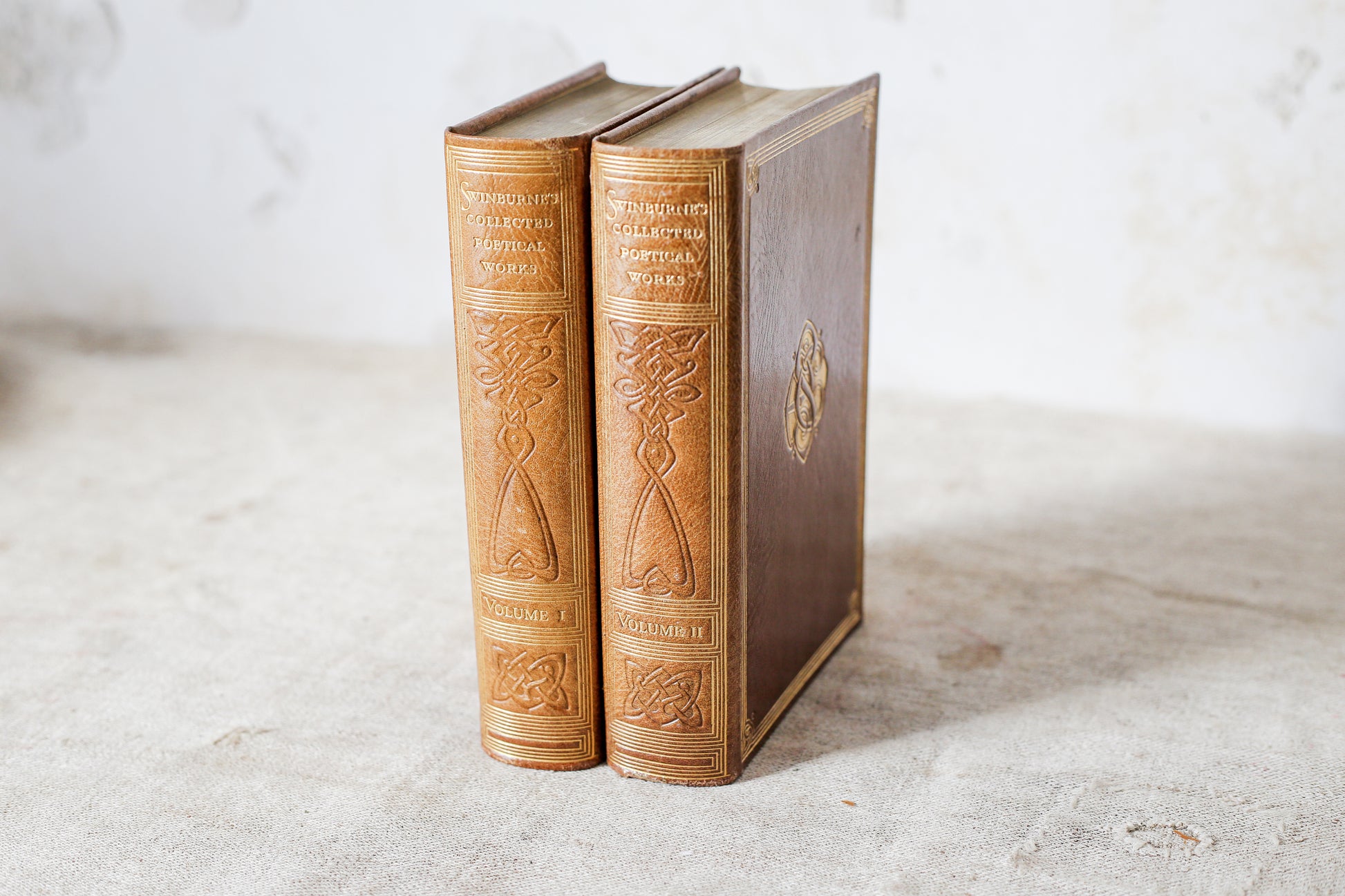 Set of Collected Poetical Works by Algernon Swinburne, published 1924. Full leather binding with gilt lettering and decoration on the front covers. Minor separation starting on the inside cover of Volume 2. Publication date of 1924. Algernon Charles Swinburne (1837-1909) was a rebellious, highly musical Victorian English poet and critic.