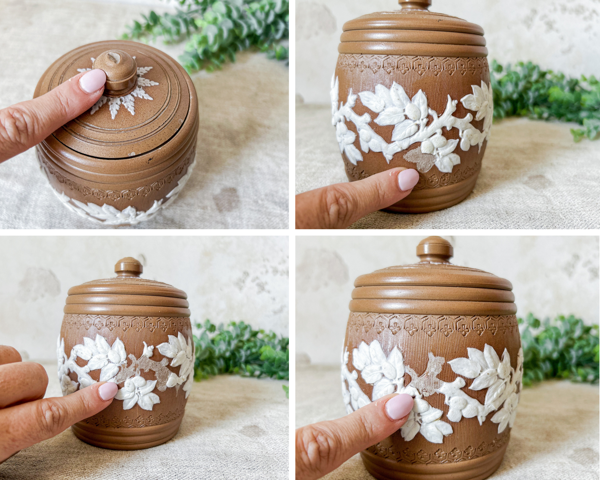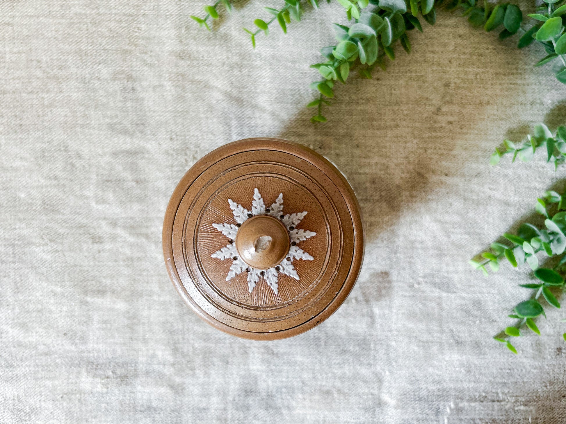 Imported from England, where it was salvaged from a Victorian dump site. Several applique pieces are missing. Knob of lid appears to have small chip or missing point. Overall perfectly worn, unique piece for small storage and display.