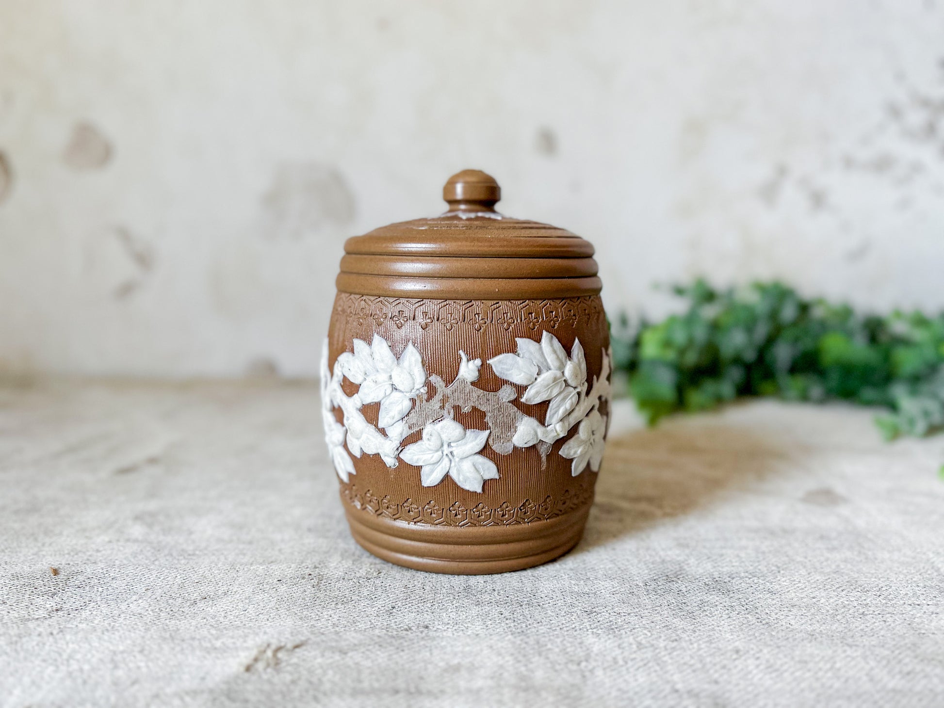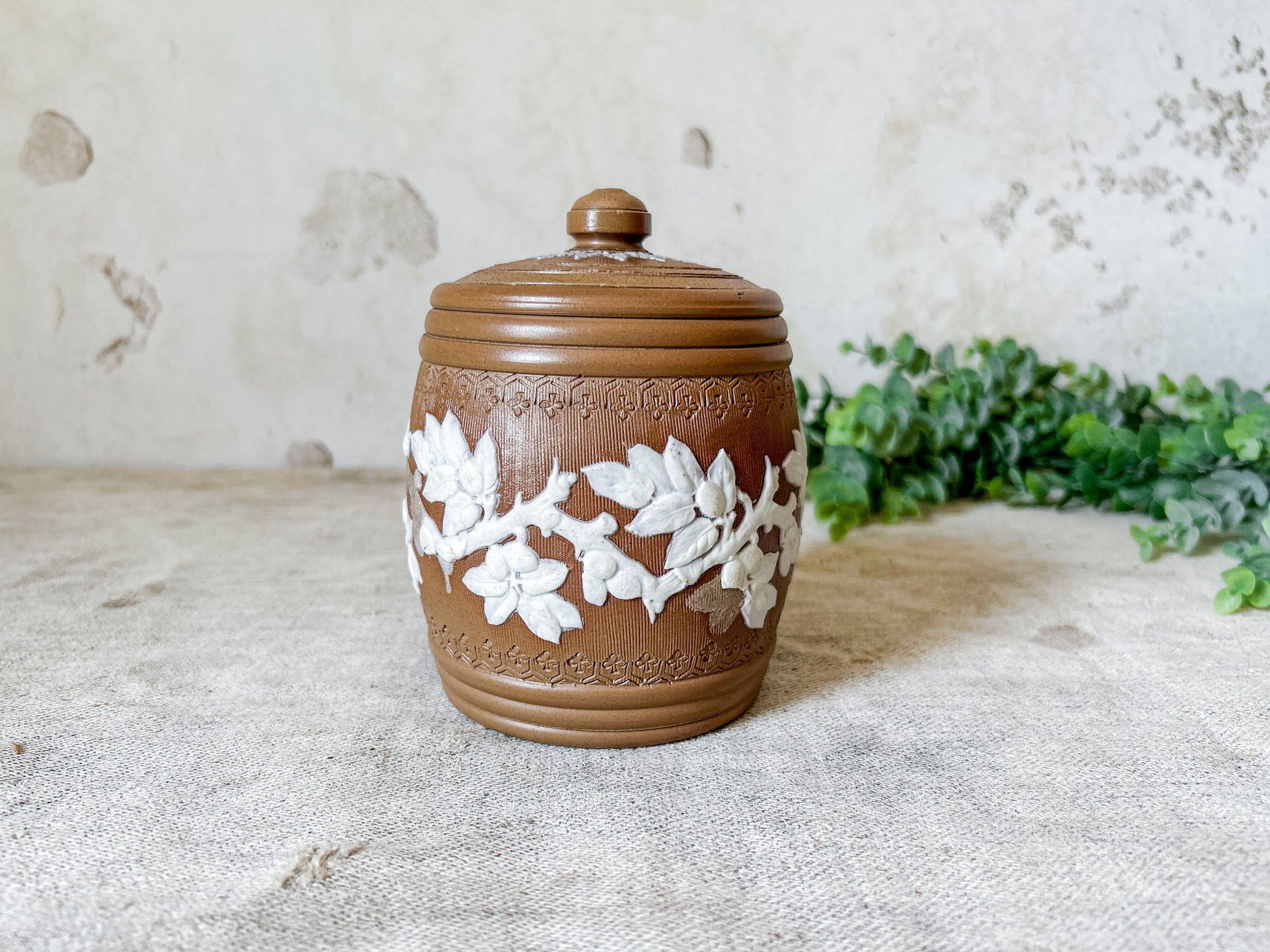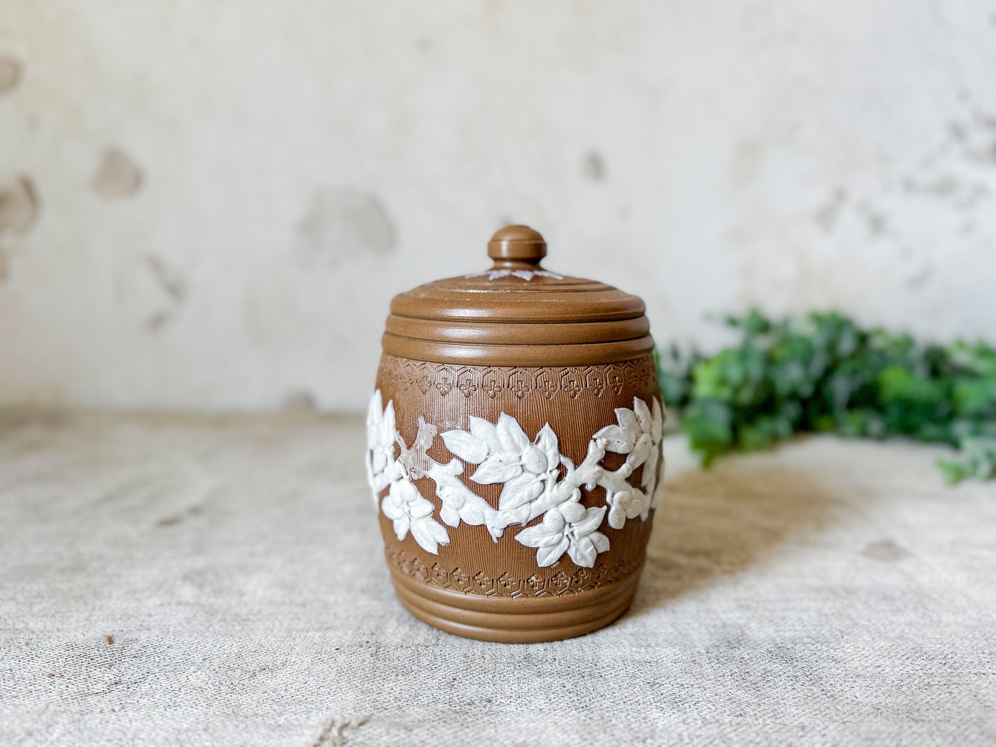 Available is an antique stoneware tobacco jar with lid. The attractive white applique floral pieces decorate the sides, with incised detail and molding on the body. The jar has an impressed stamp on the base reading 'Silicon Doulton Lambeth.' Estimated age c1890.