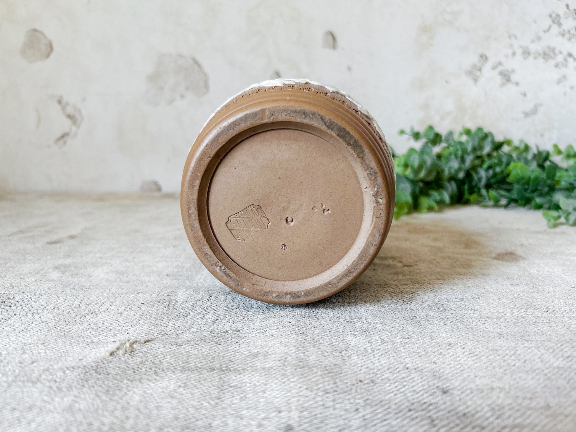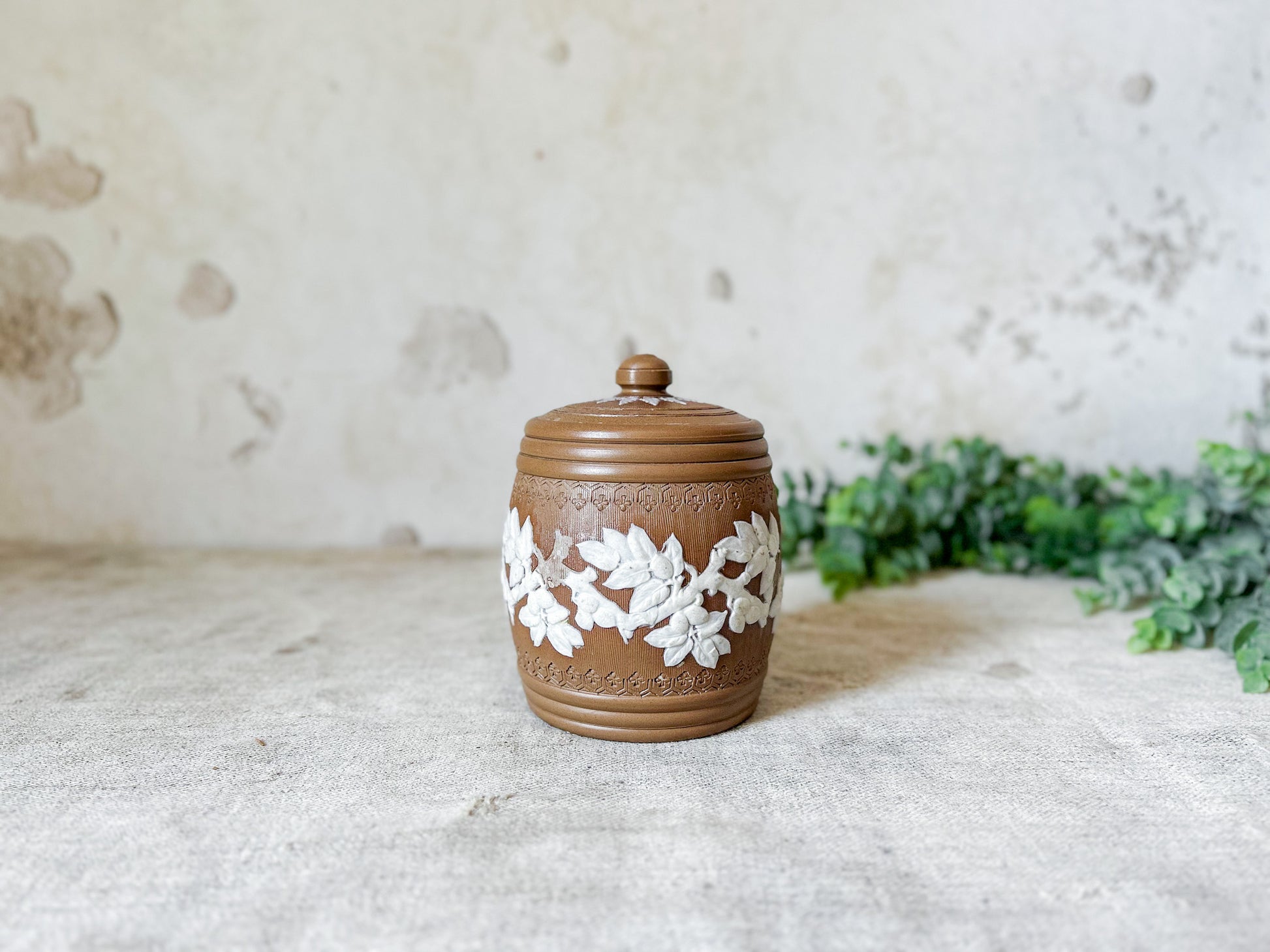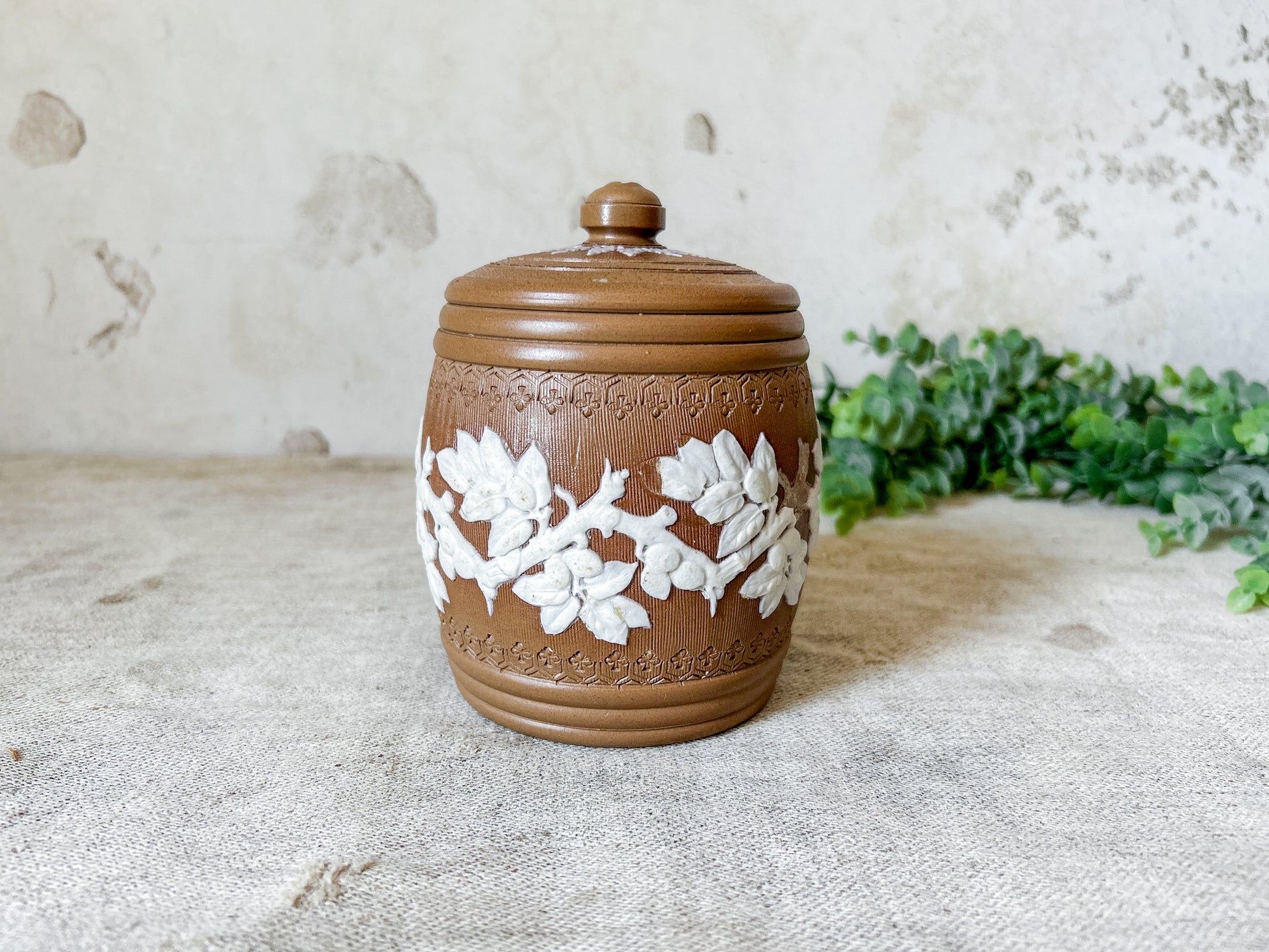 Available is an antique stoneware tobacco jar with lid. The attractive white applique floral pieces decorate the sides, with incised detail and molding on the body. The jar has an impressed stamp on the base reading 'Silicon Doulton Lambeth.' Estimated age c1890.