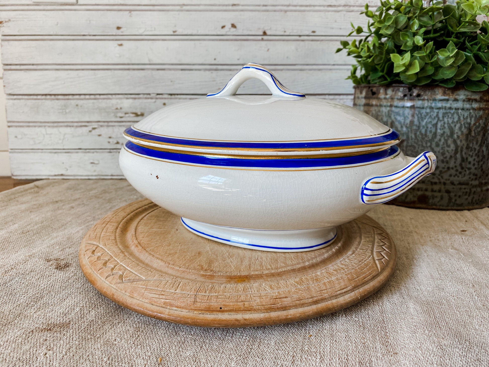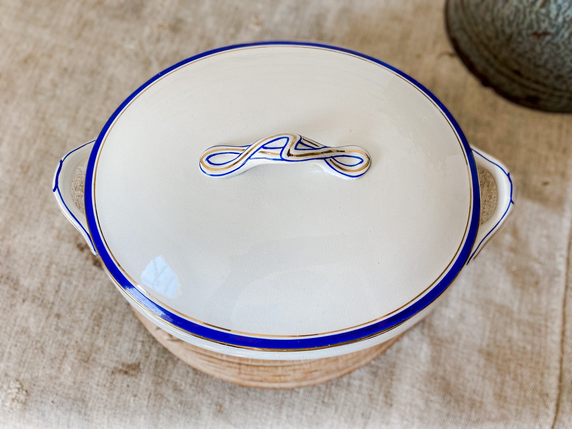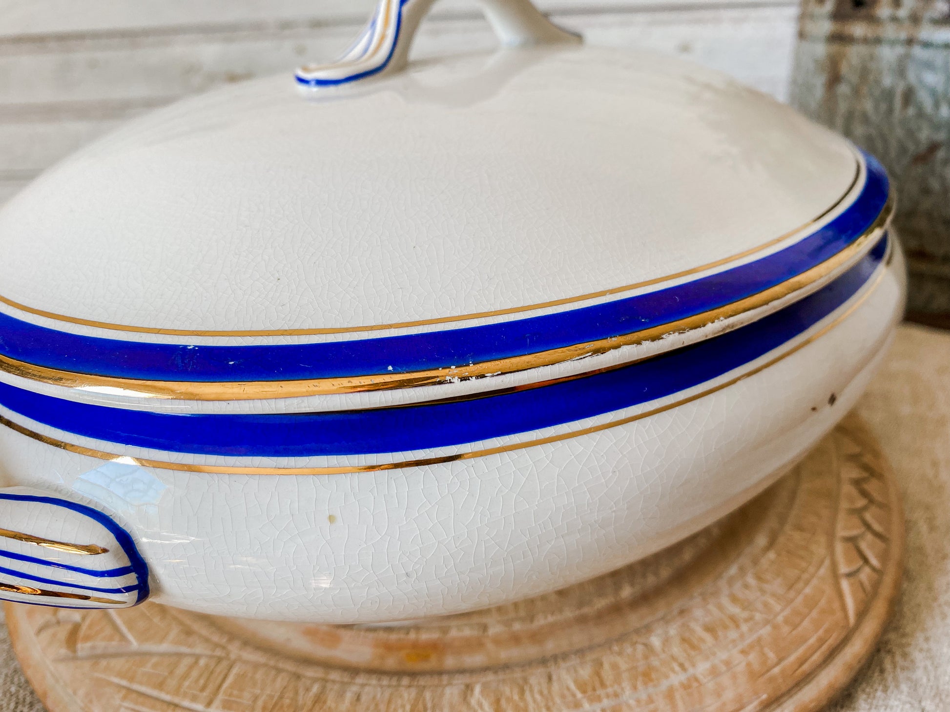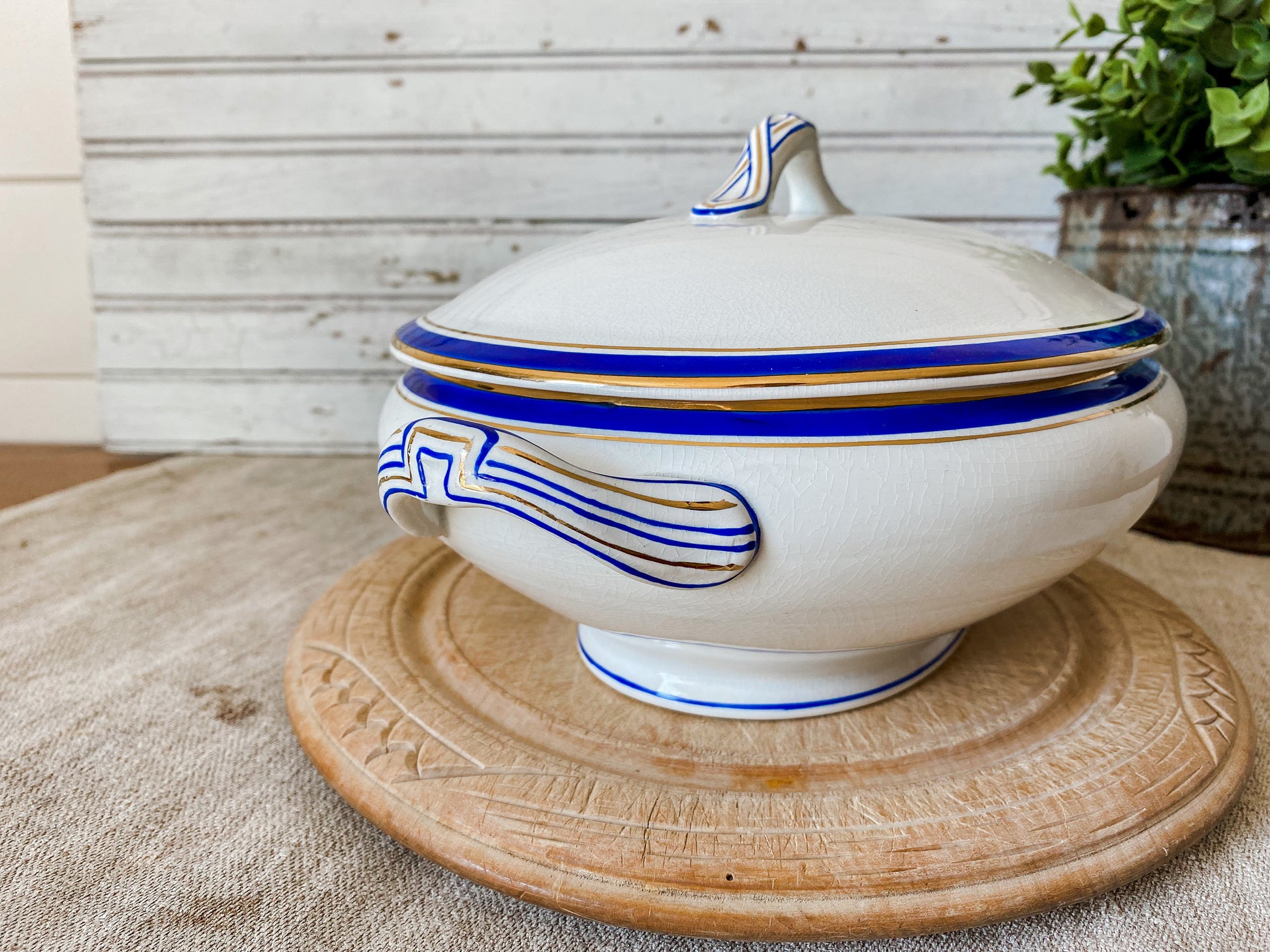 Vintage Blue and Gold Ceramic Art Deco Tureen | Egersunds Fayancefabriks Norway | Crazed White Serving Dish with Lid