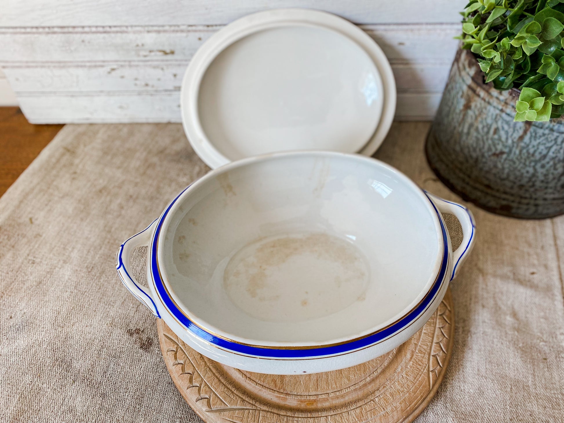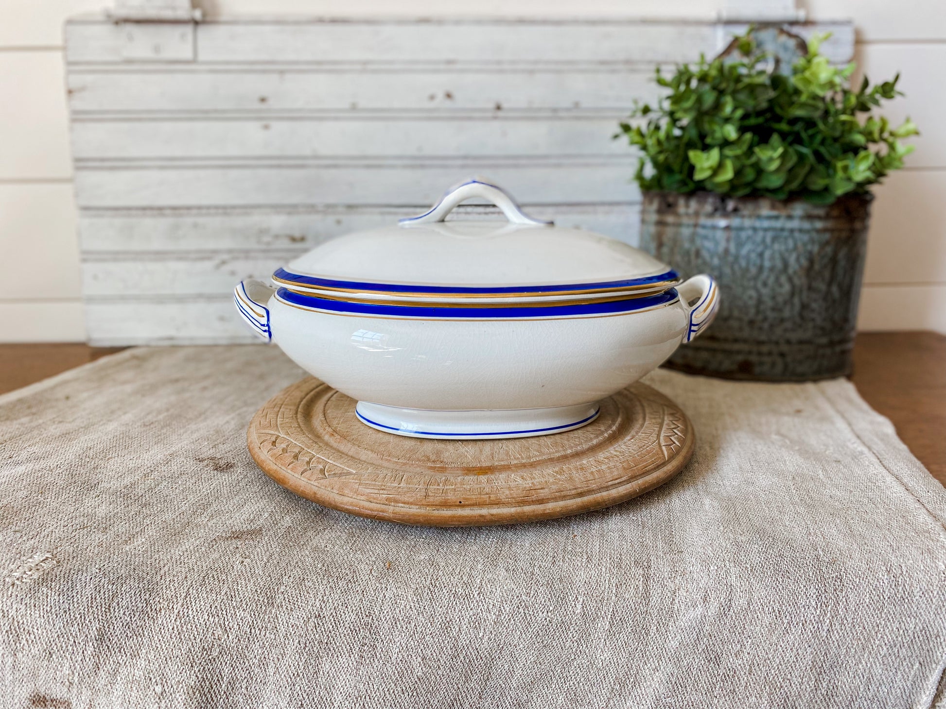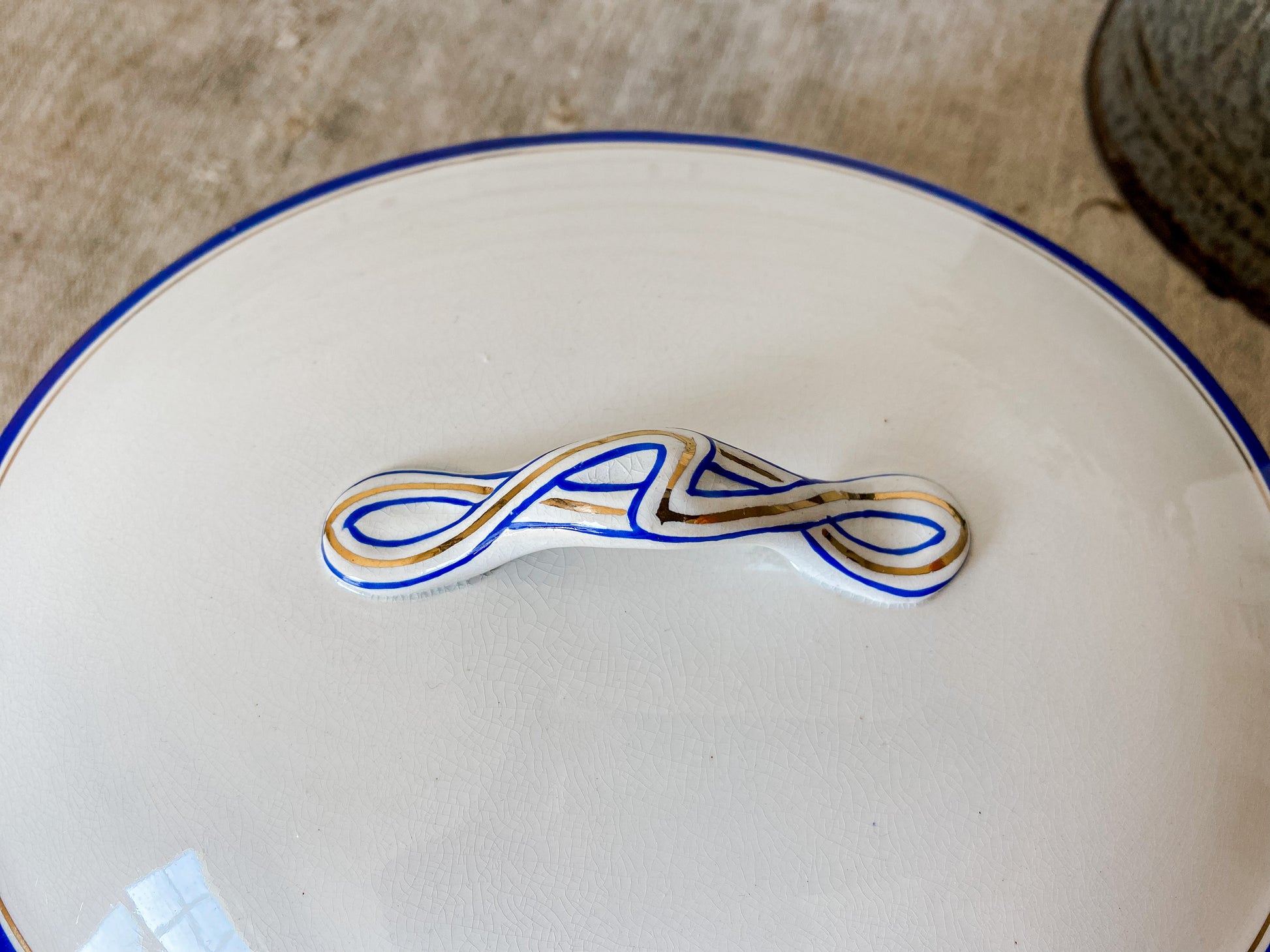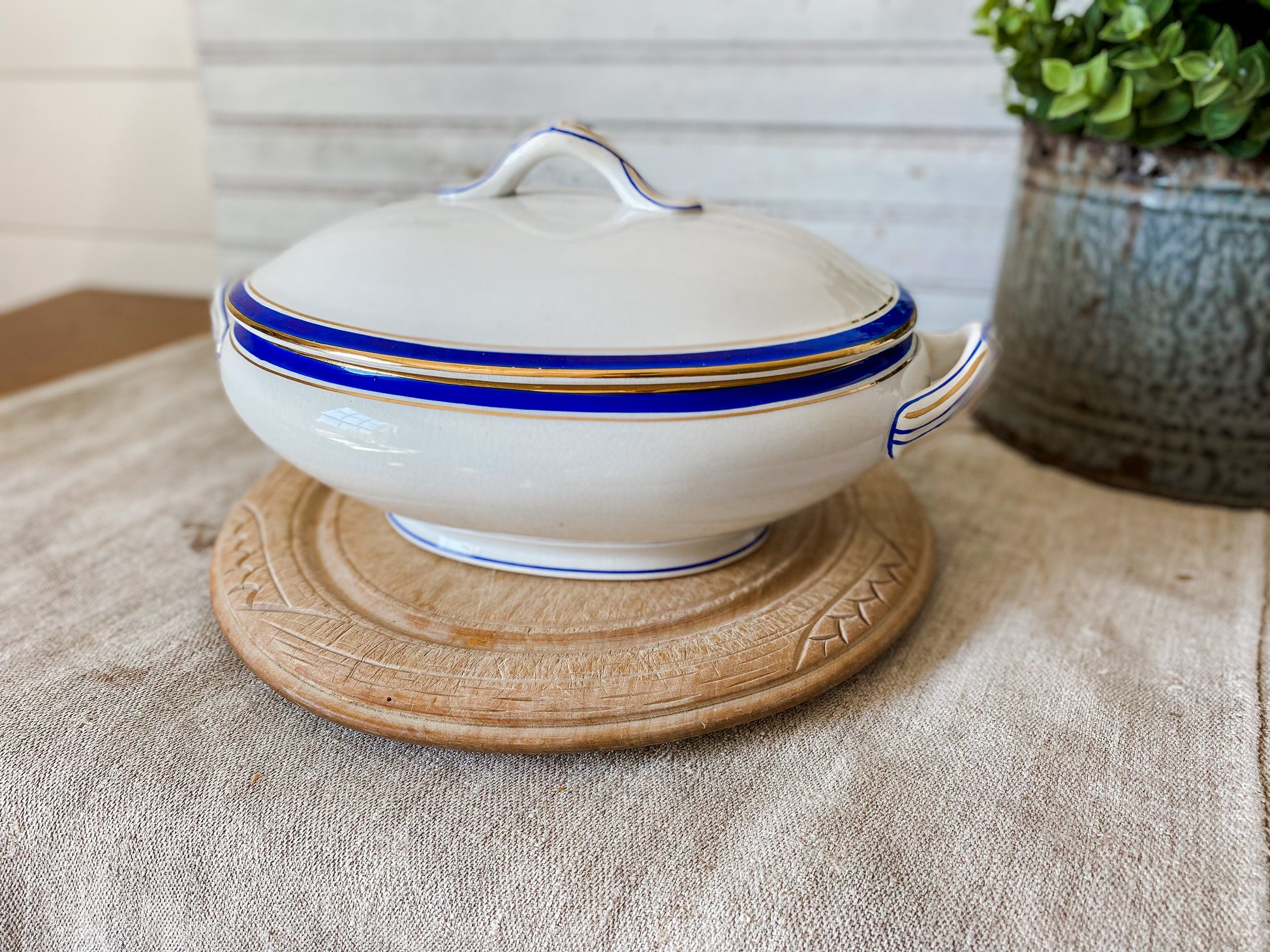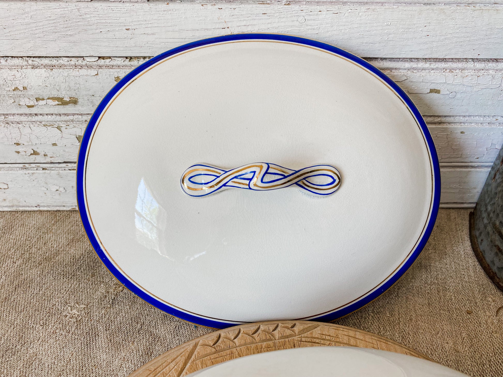 Vintage Blue and Gold Ceramic Art Deco Tureen | Egersunds Fayancefabriks Norway | Crazed White Serving Dish with Lid