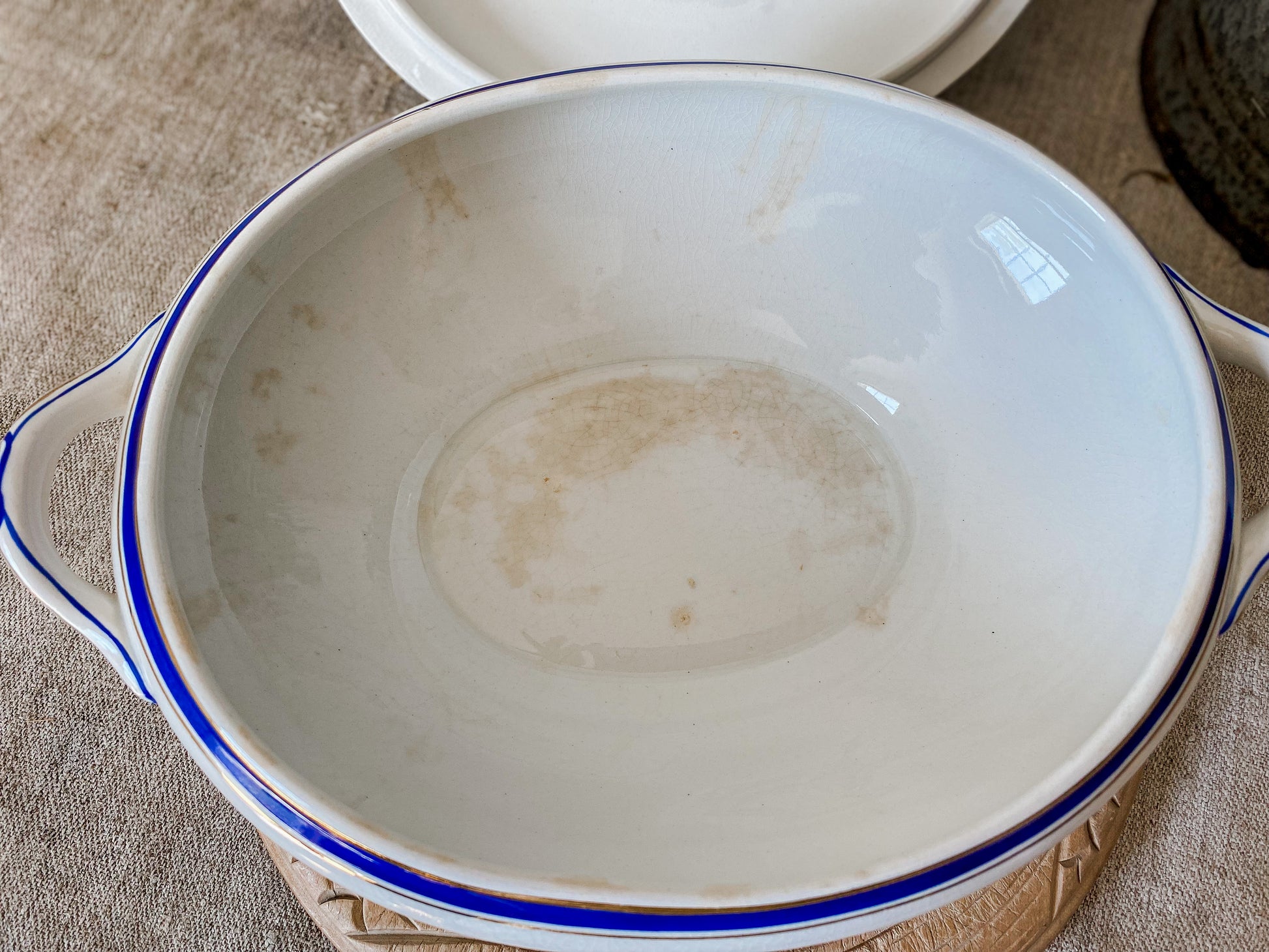 It has a simple and elegant design, with cobalt blue bands bordered with gilt along the rim edges and handles. There is slight wear to the gilt in some places and crazing throughout. Staining to the inside of the bowl.