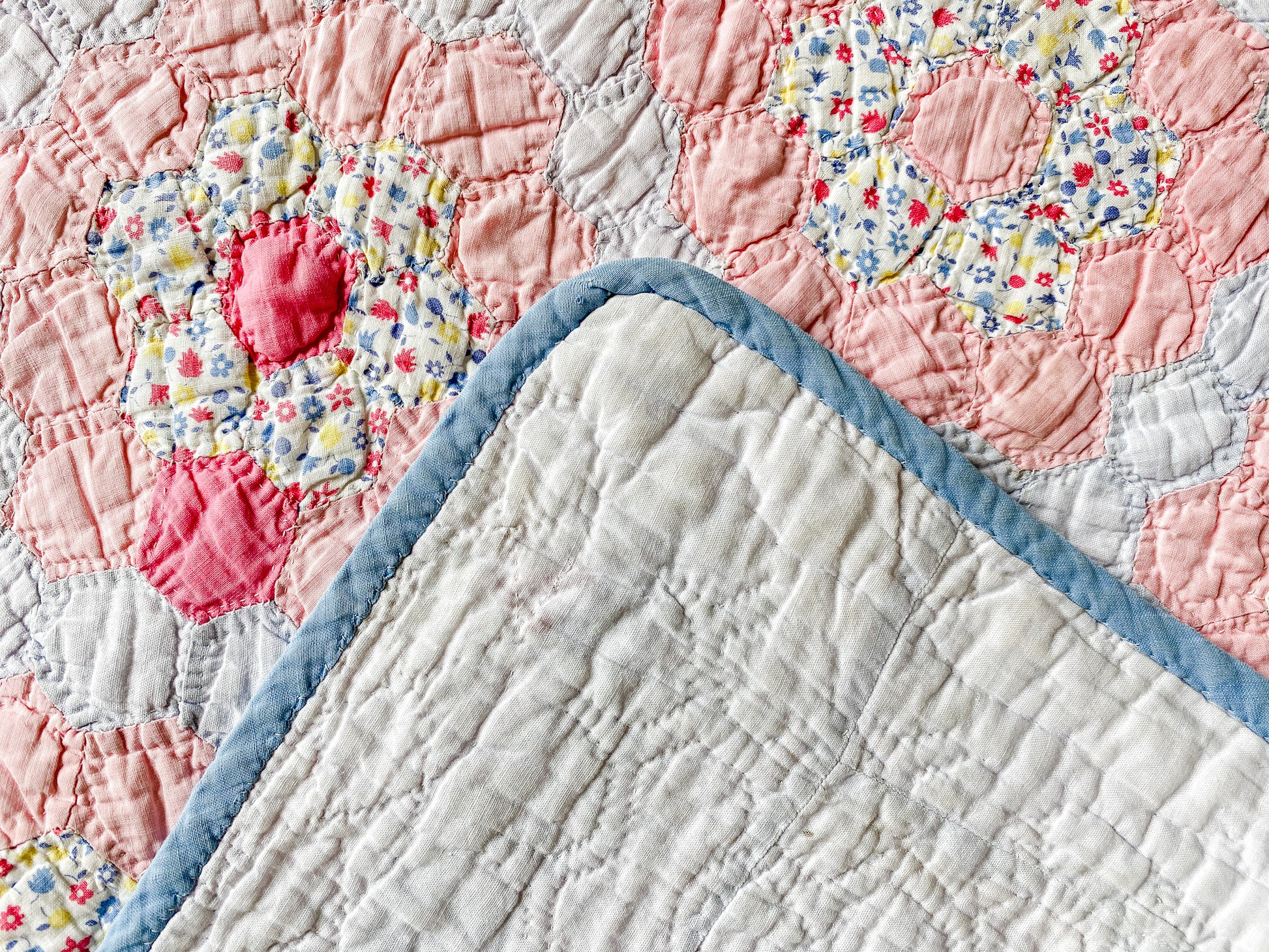 Quilt is made in the Grandmother's Flower Garden pattern, with hexagon blocks of baby blue and dark and light pink. White backing. Lightweight cotton batting.
