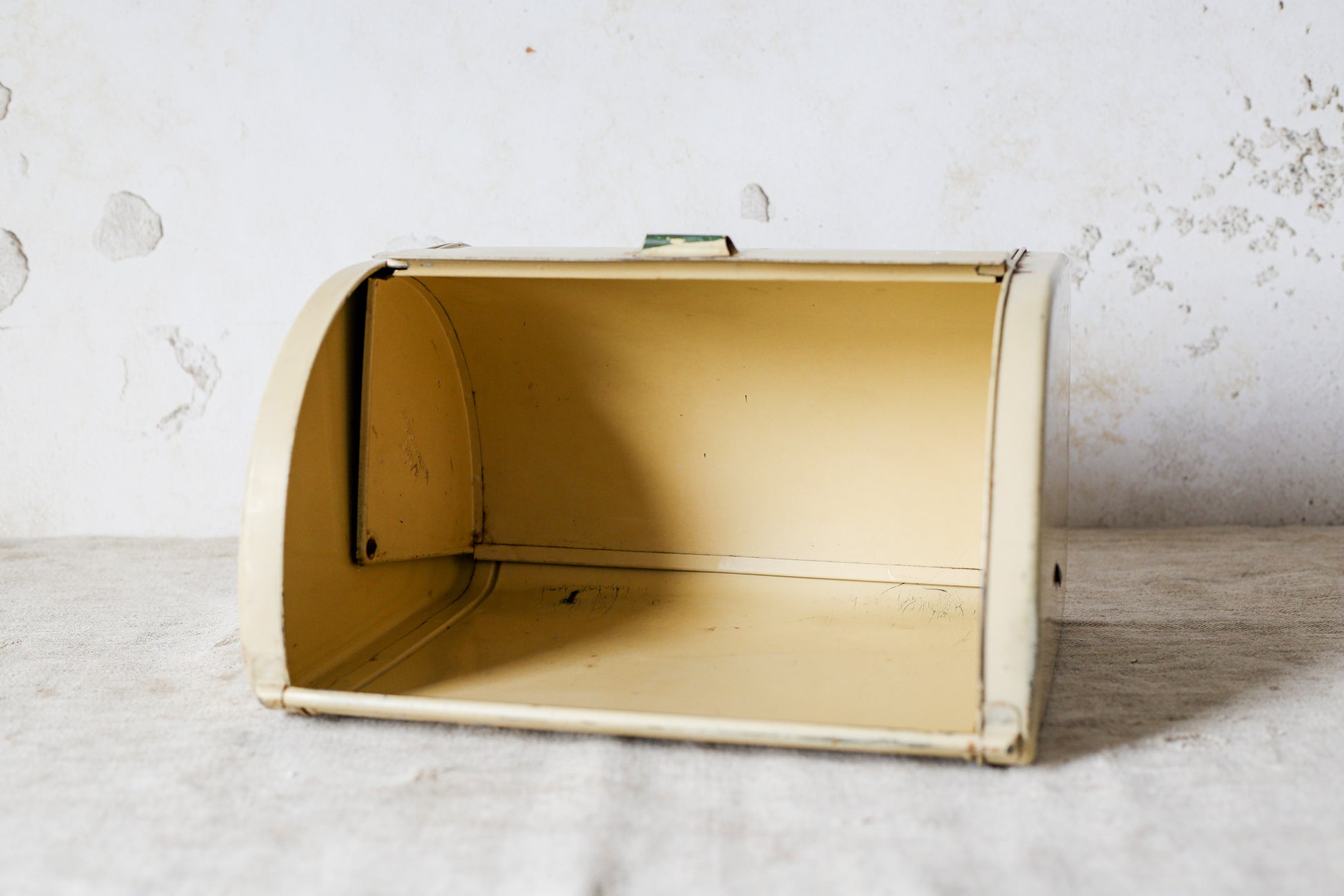 Yellow Metal Roll-Top Cake Countertop Storage Tin, c1940