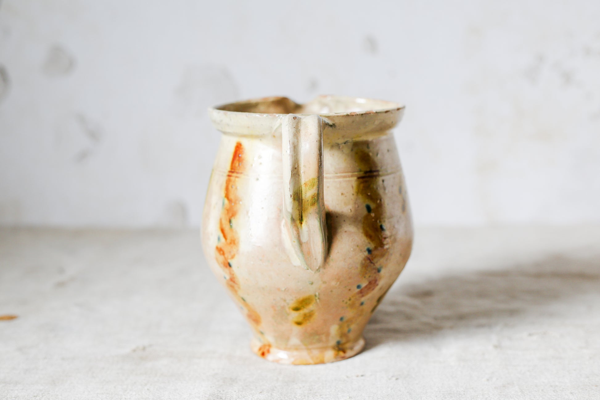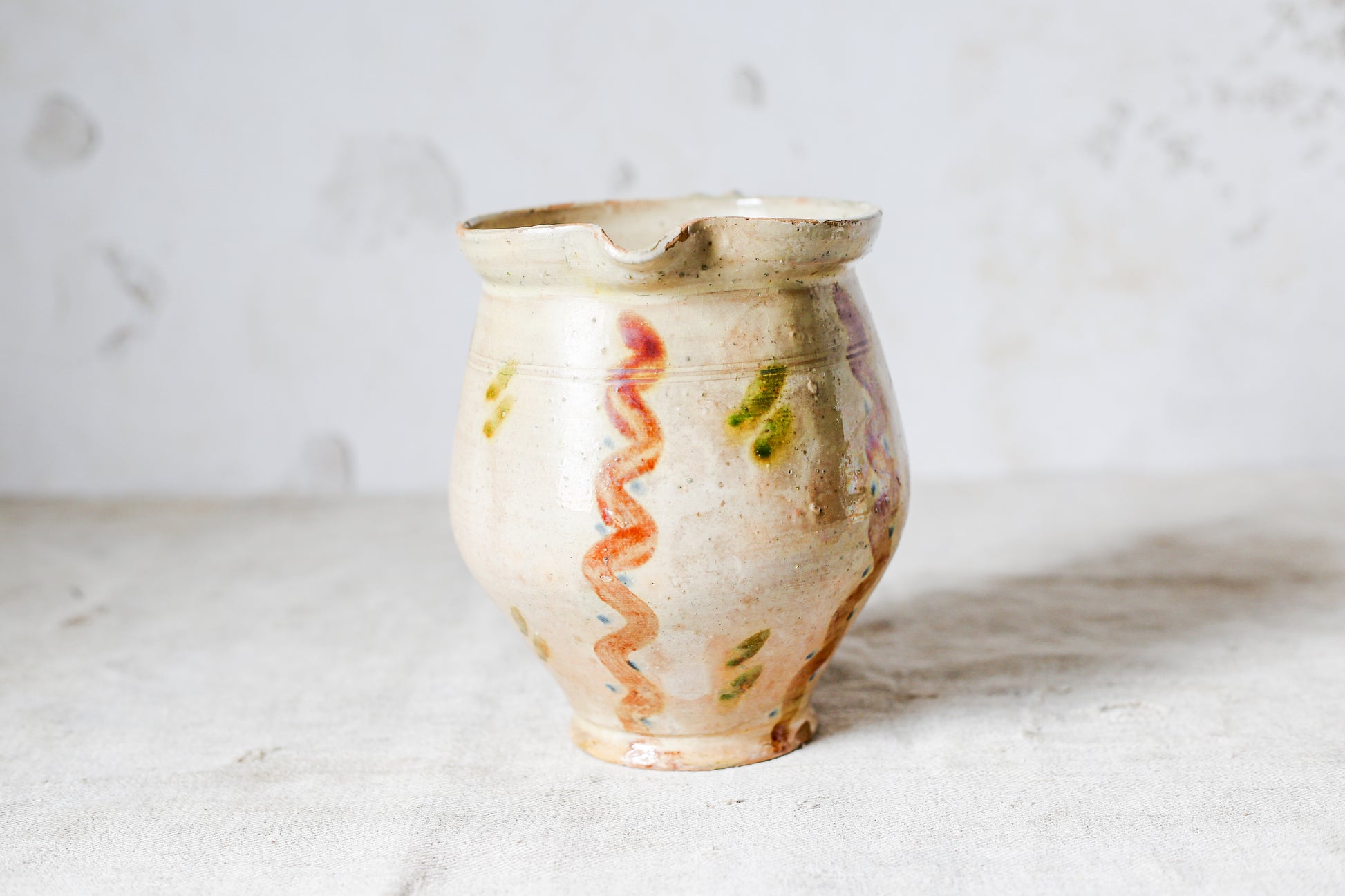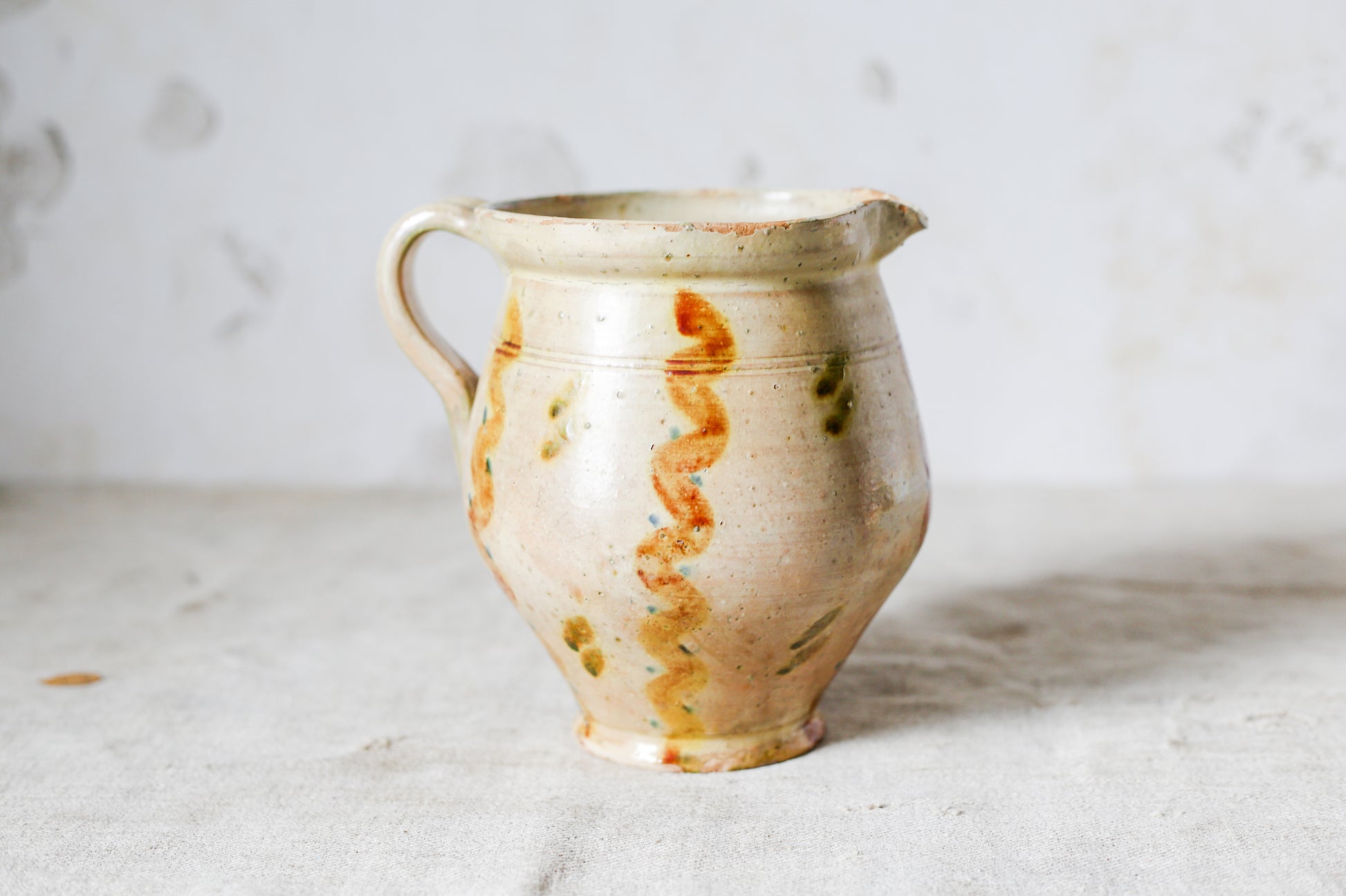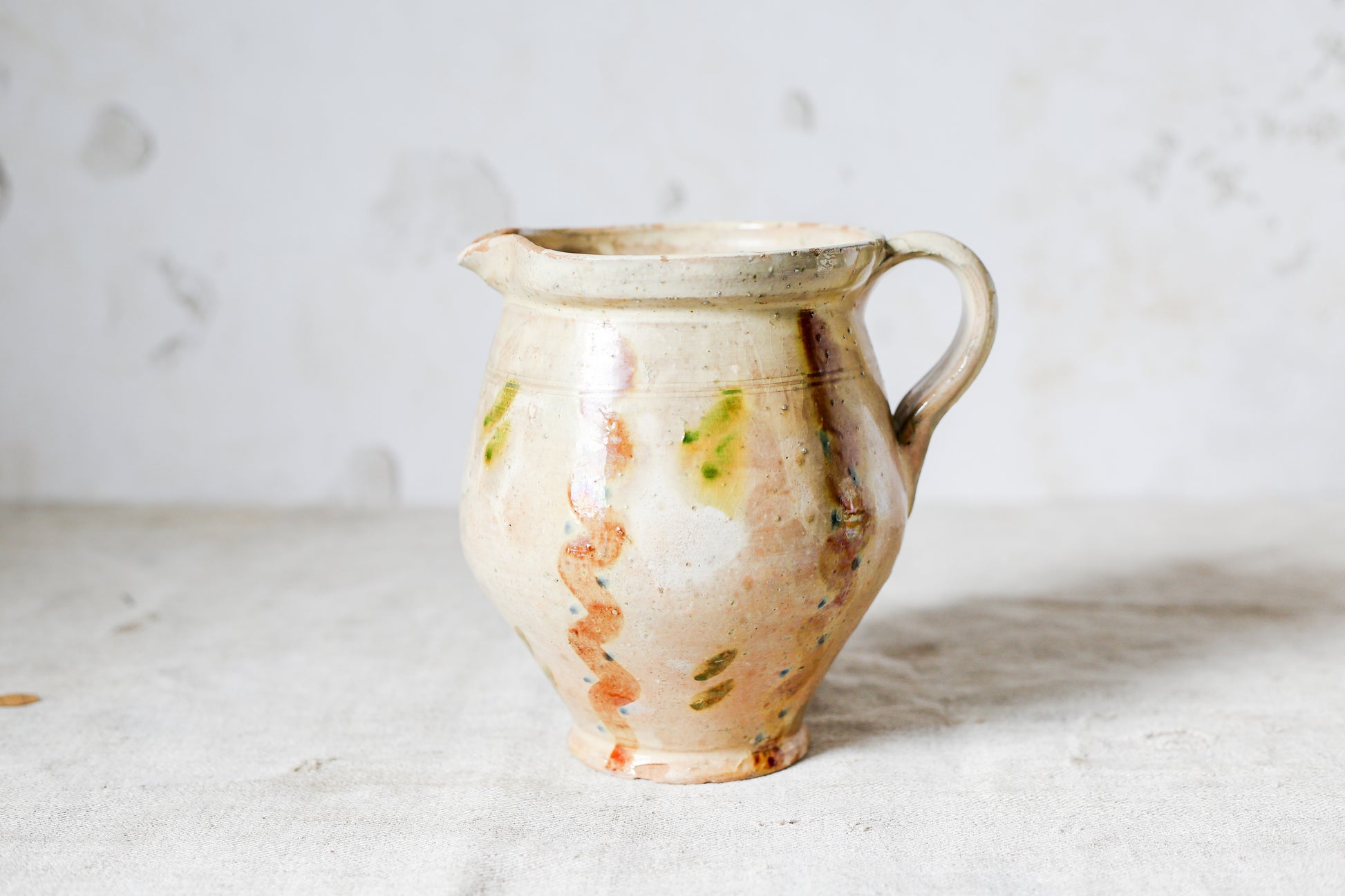 Available is a vintage glazed terracotta pitcher. The underglaze is a light butter yellow, typical of pottery made in the south of France, with dark brown and green decoration throughout.