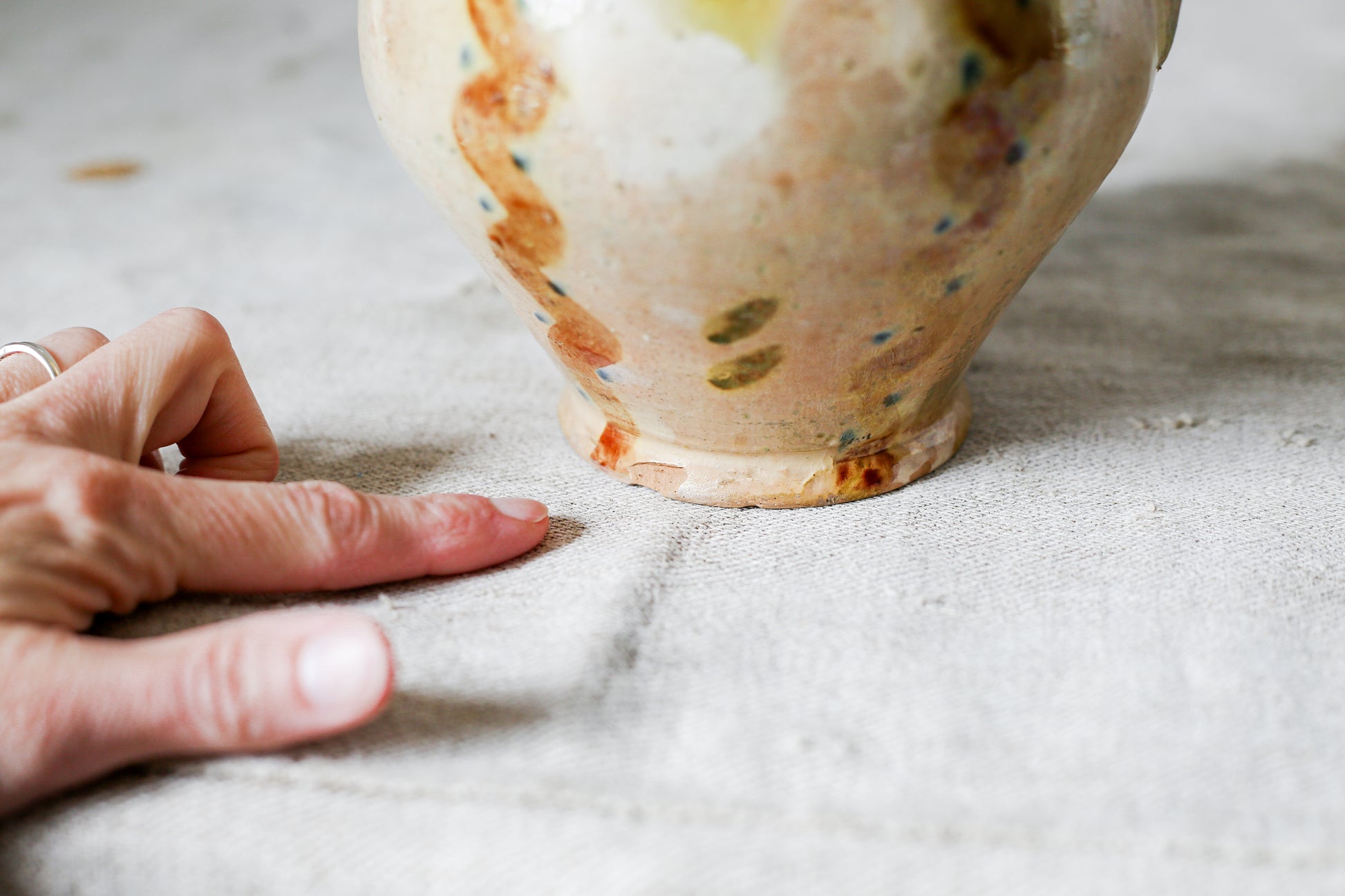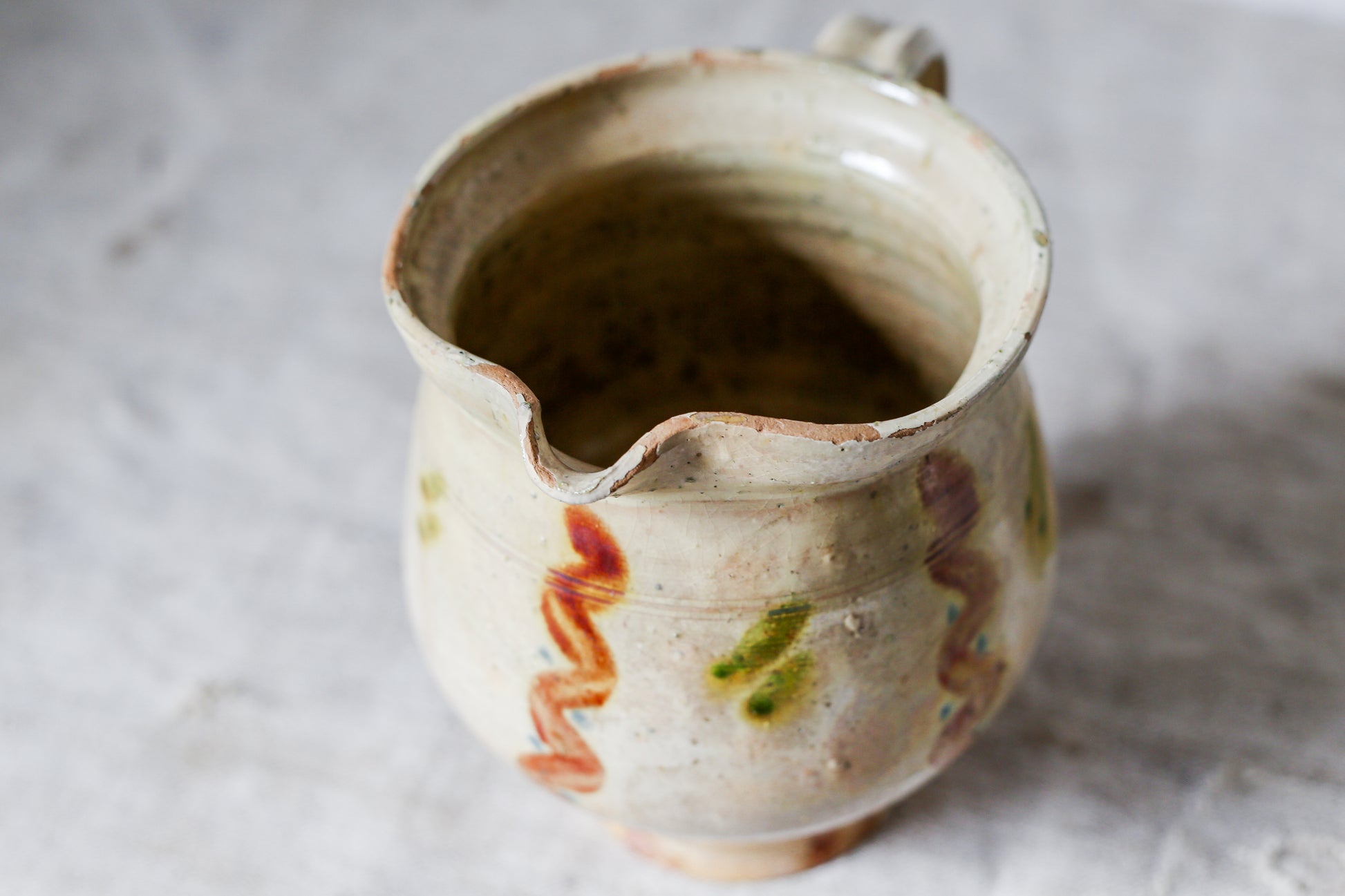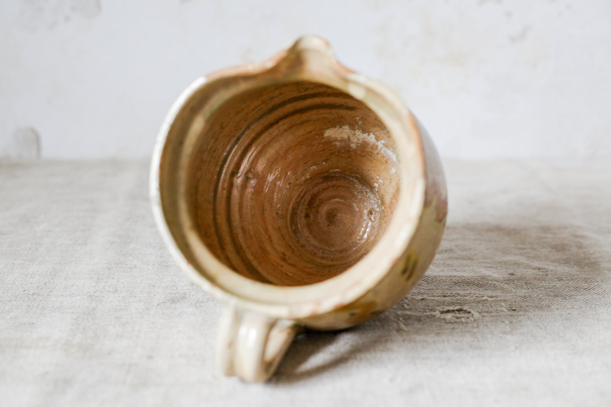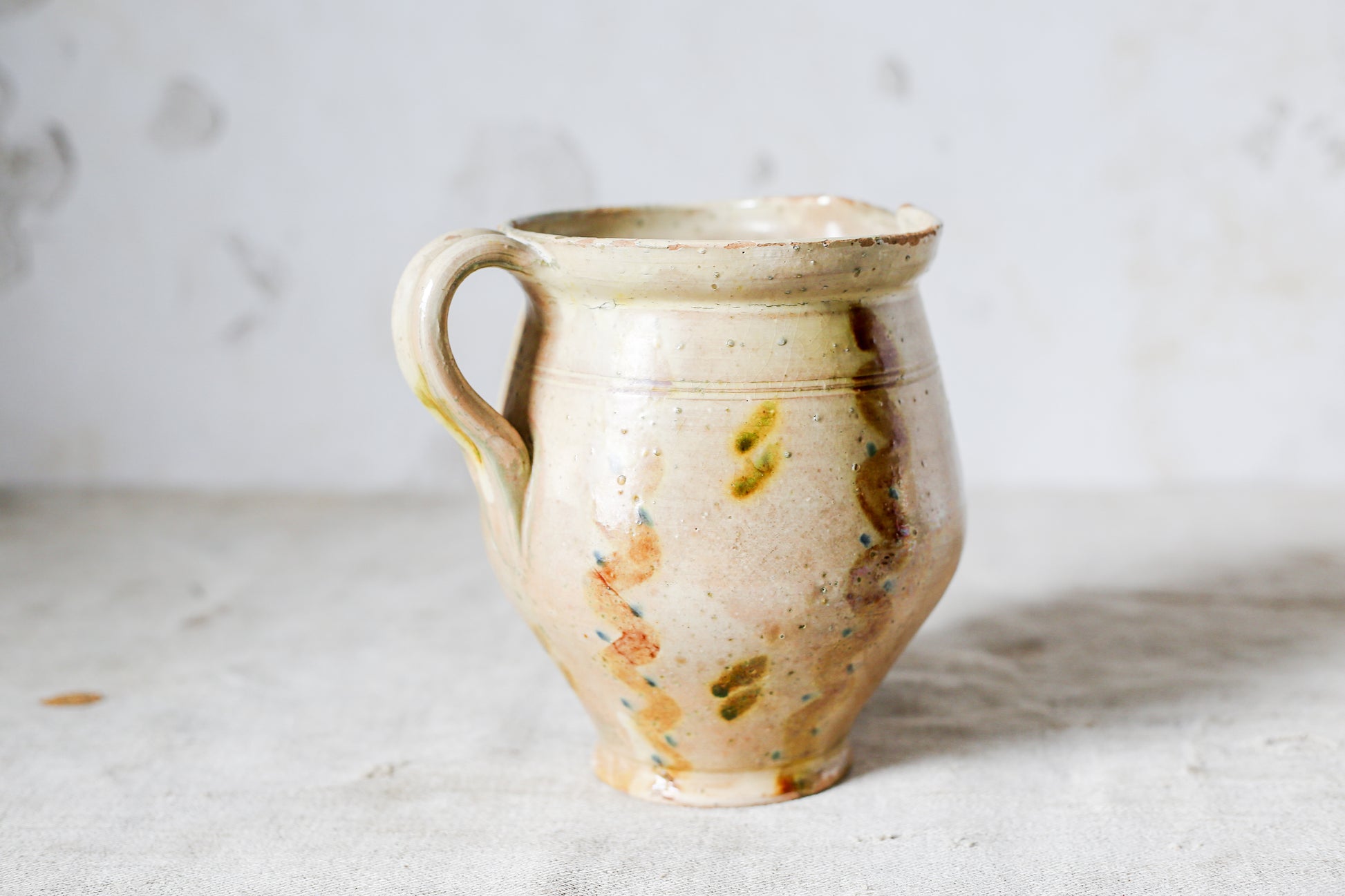 No maker's stamp. Handle design is typical of handmade European pottery. Estimated age early to mid 20th century.