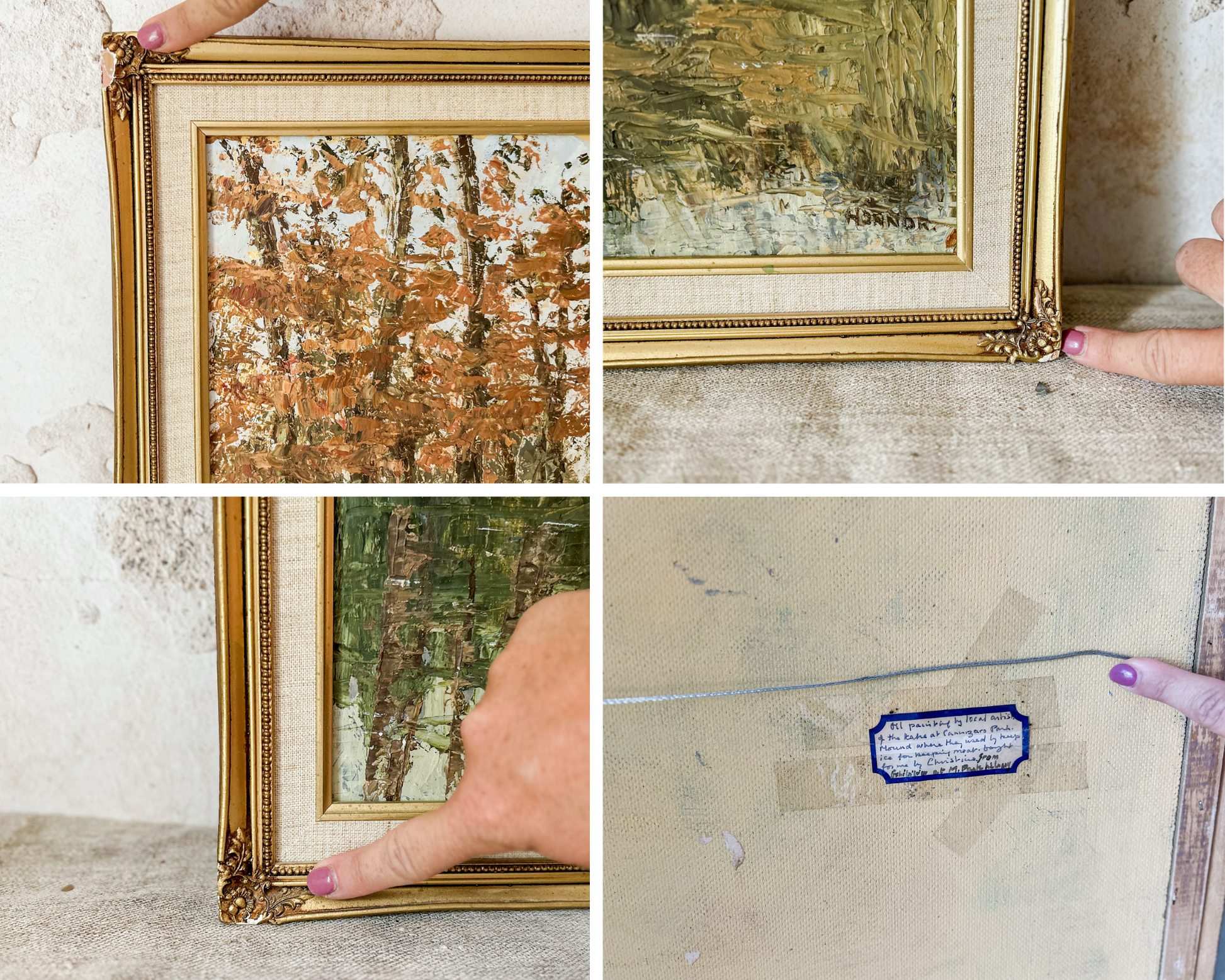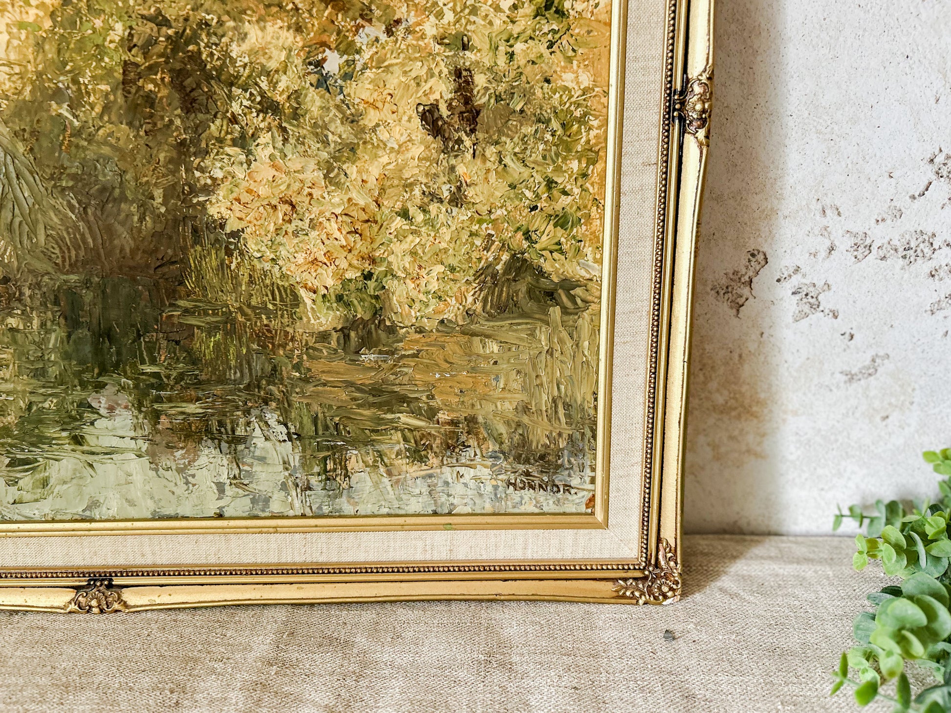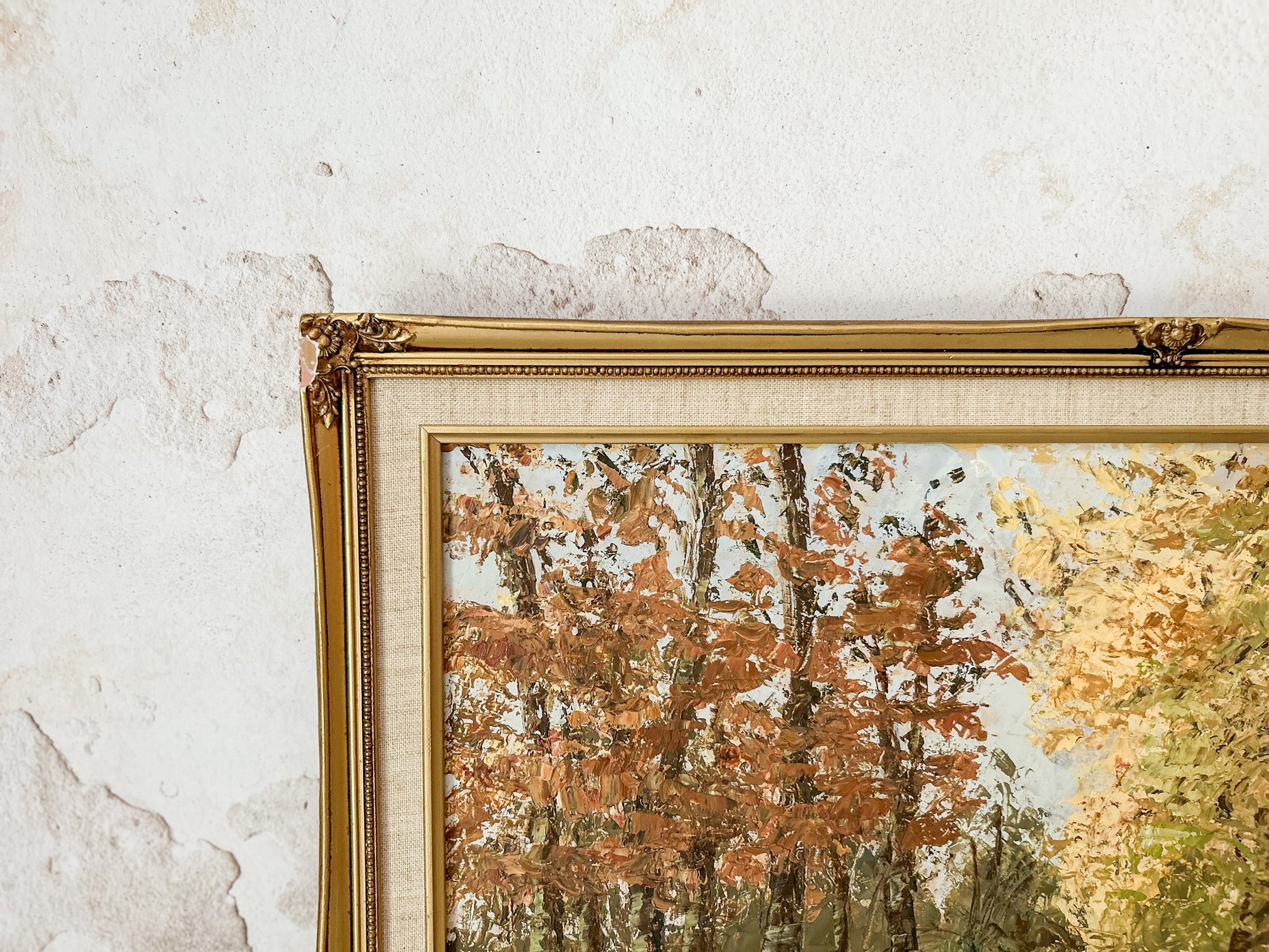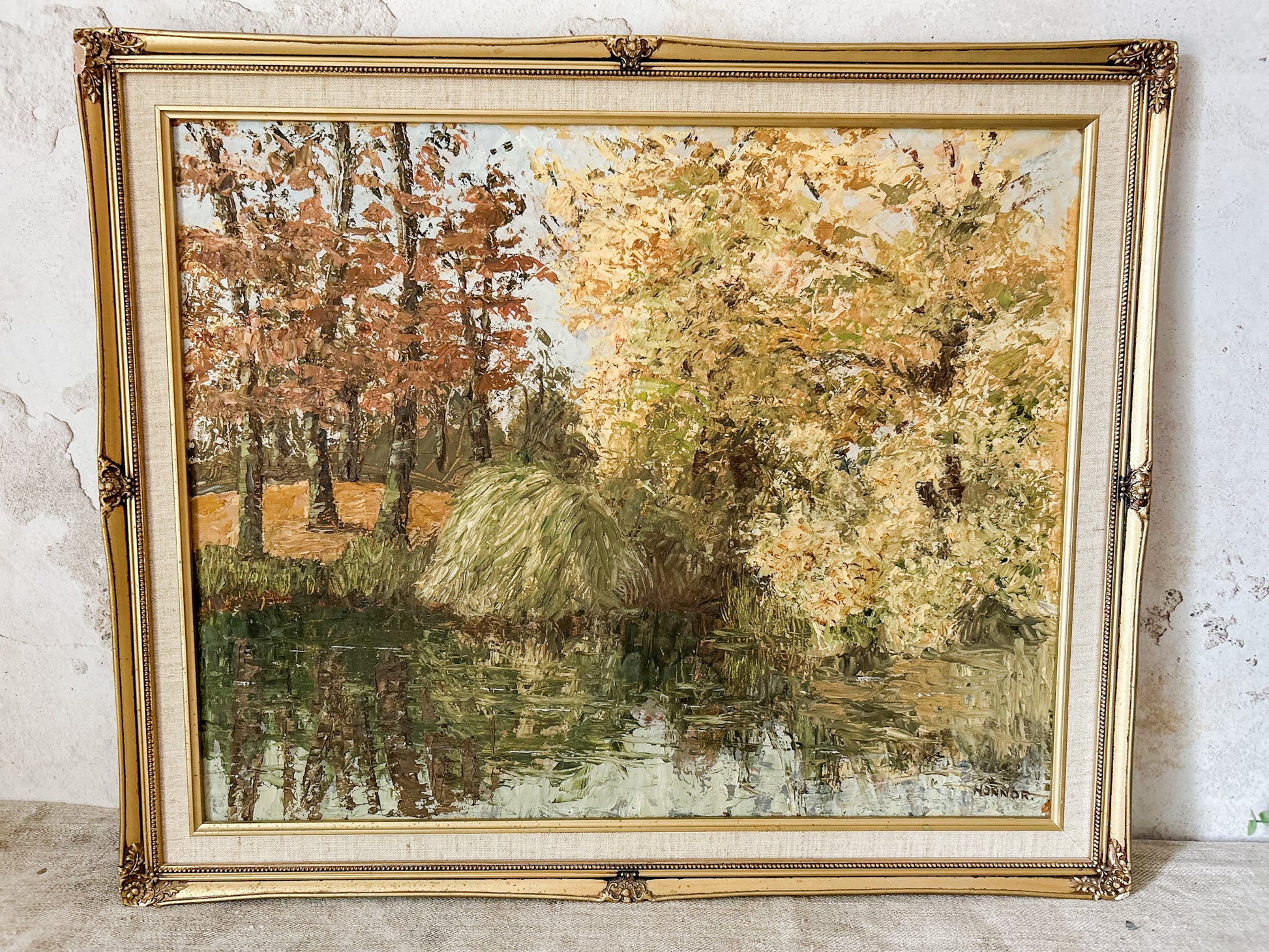 This charming vintage English oil painting captures a serene autumn landscape reflected gently over a pond. Set within a classic gilt wood and linen frame, it brings the warmth and richness of the season into any room. Perfect for those seeking a timeless piece that evokes peaceful countryside beauty and traditional craftsmanship.