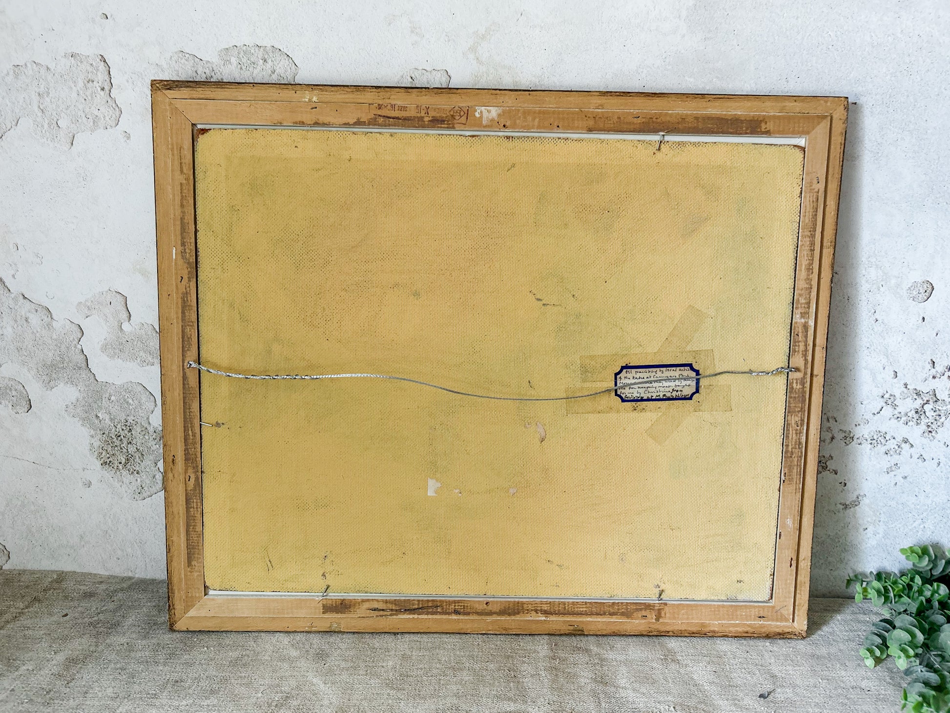 Imported from England. Small chip to upper left corner of frame. Painted on board and set into the frame with nails. Hanging wire in place.