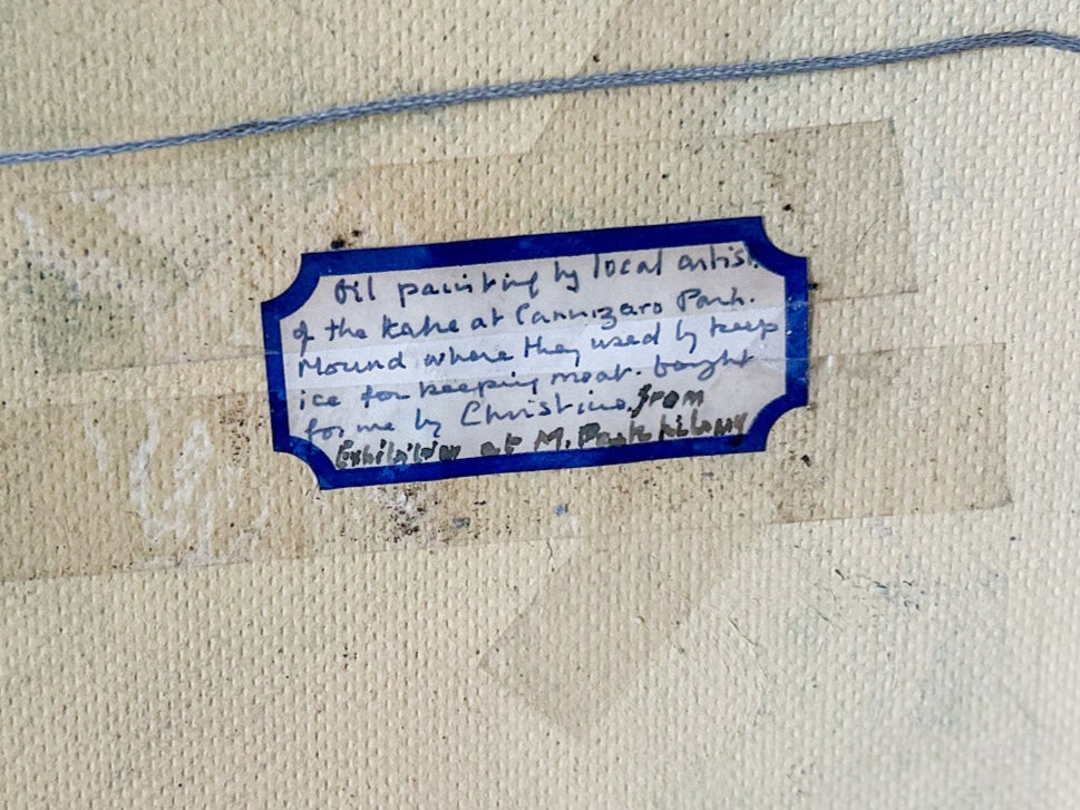 The handwritten label on the back reads "Oil painting by a local artist of the lake at Cannizaro Park", with additional information on provenance. Signed bottom right front corner "Honnor".