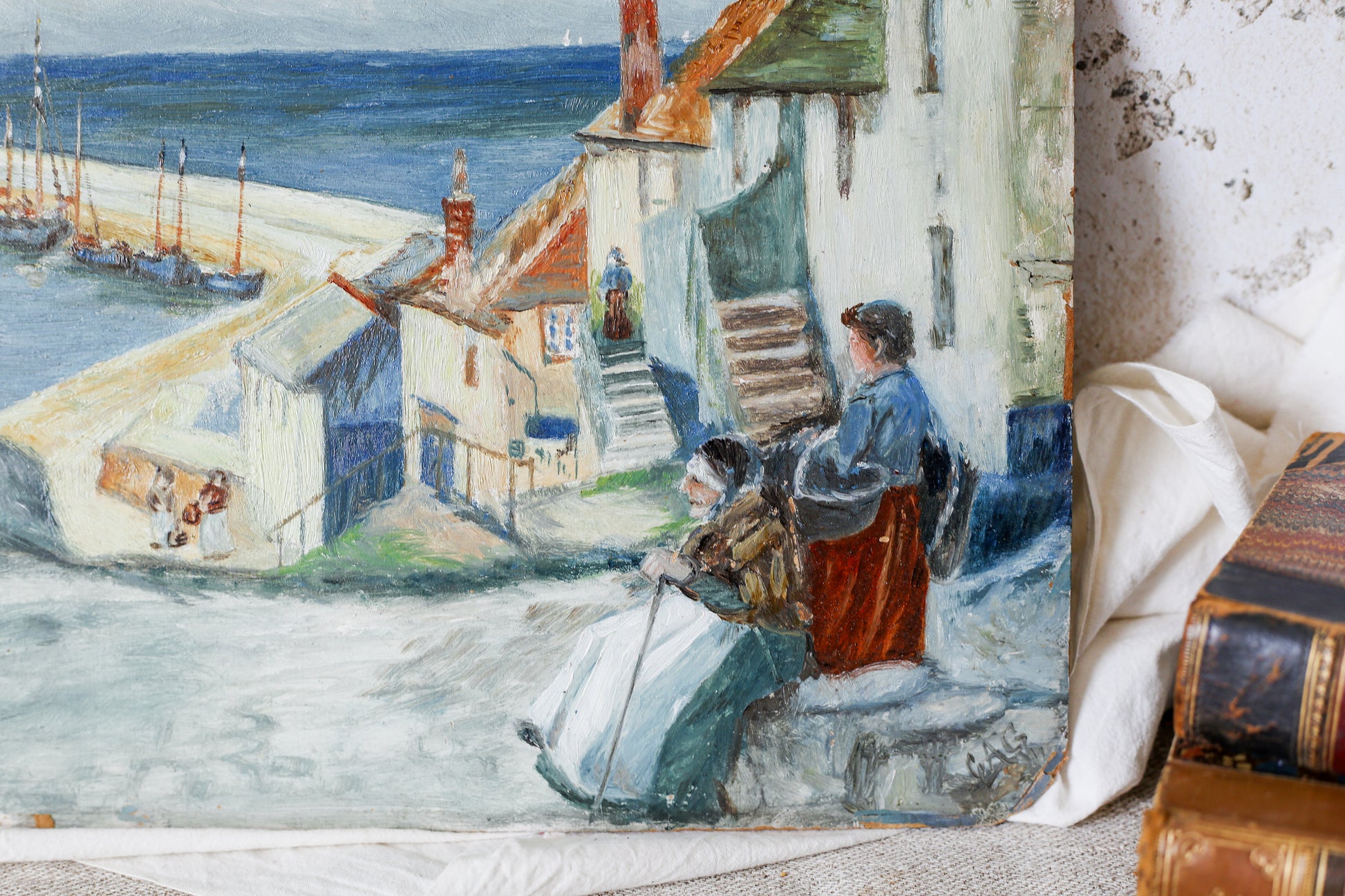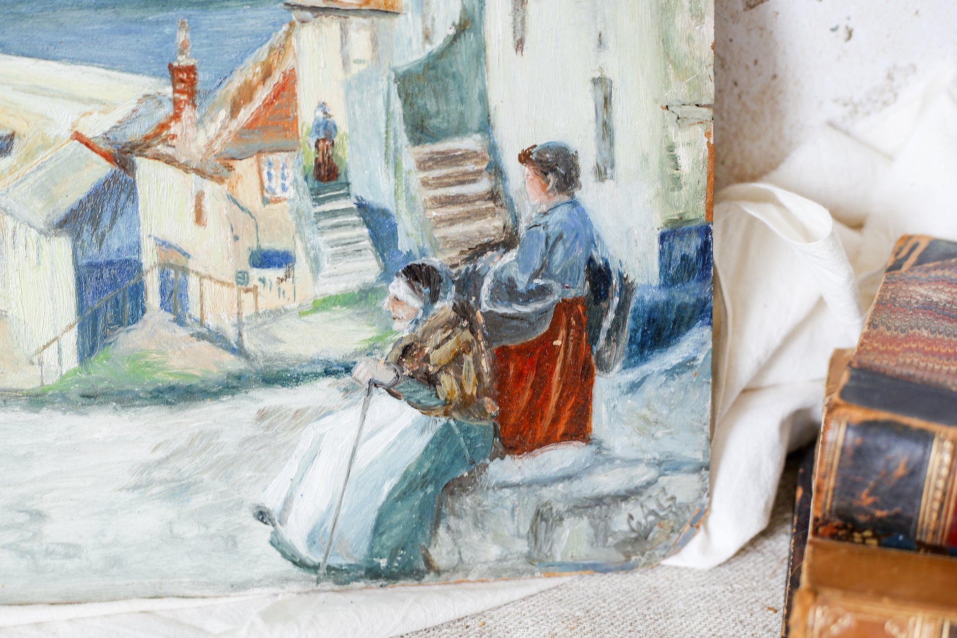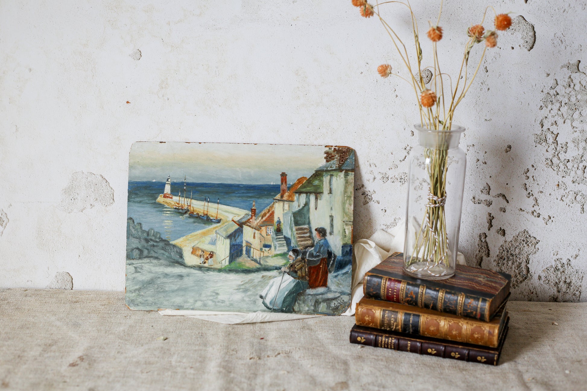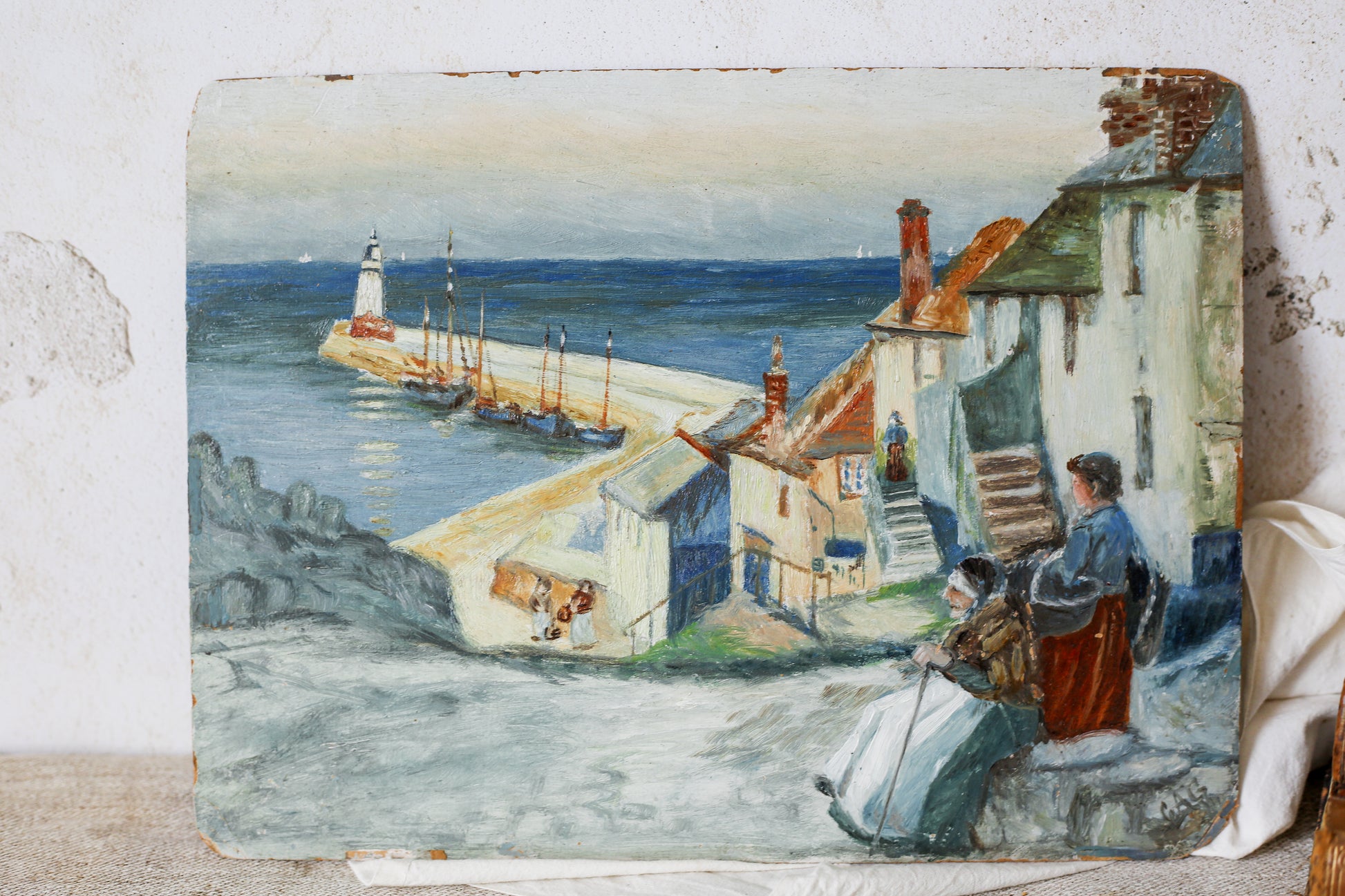 Available is an original oil painting of a fishing village, with stone cottages leading down to a quay with a lighthouse at the end. In the foreground are two women, wrapped in shawls and gazing at the sea. Delightfully naive folk art. Found in England.