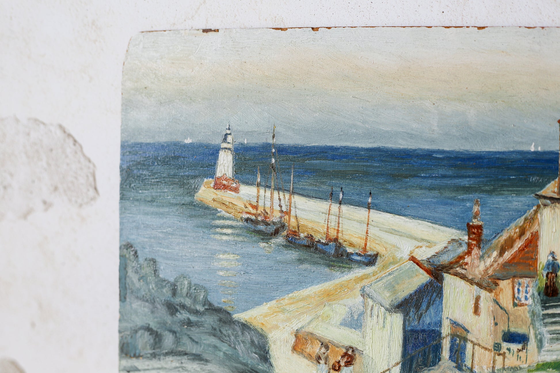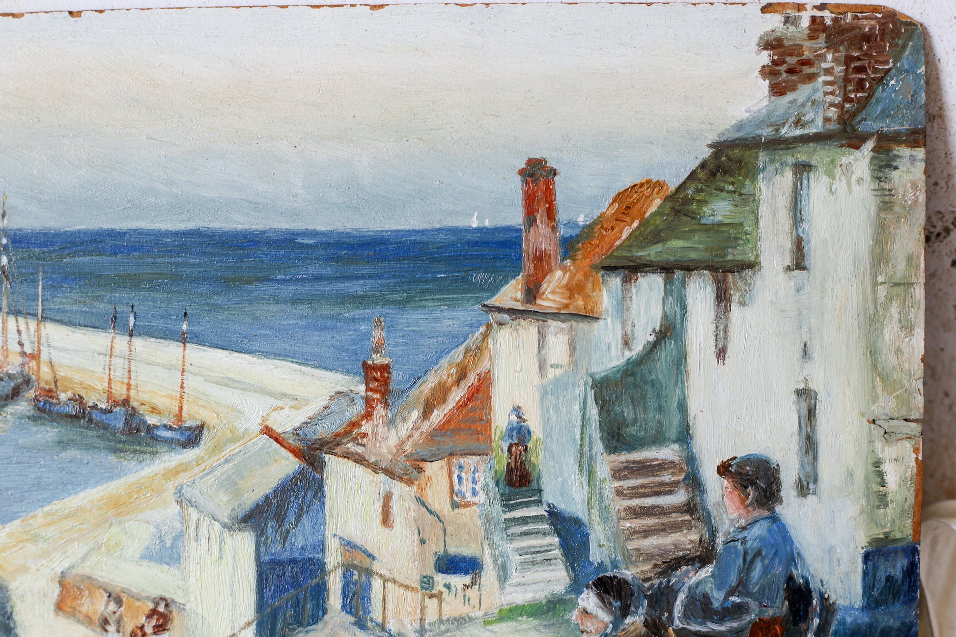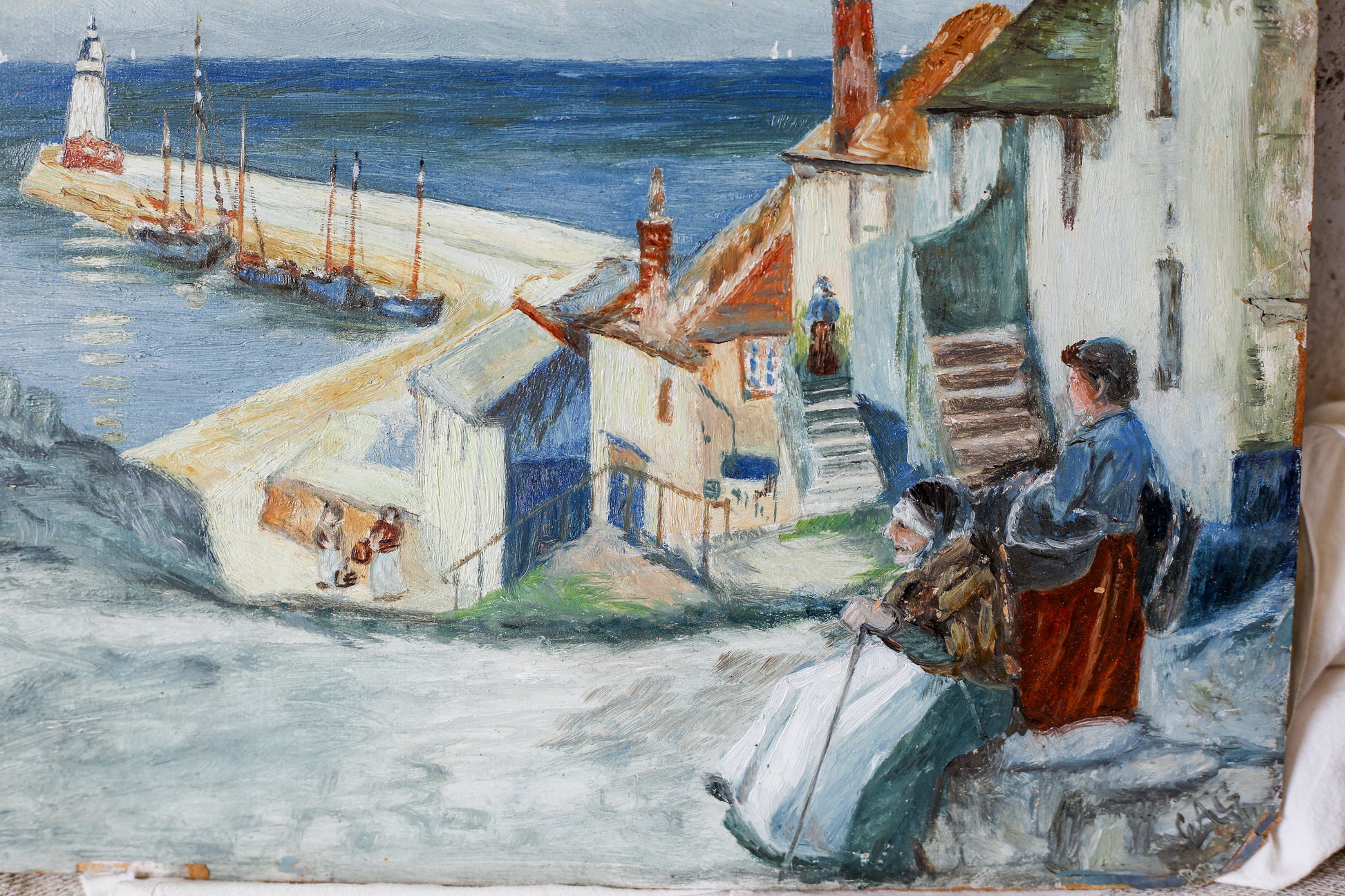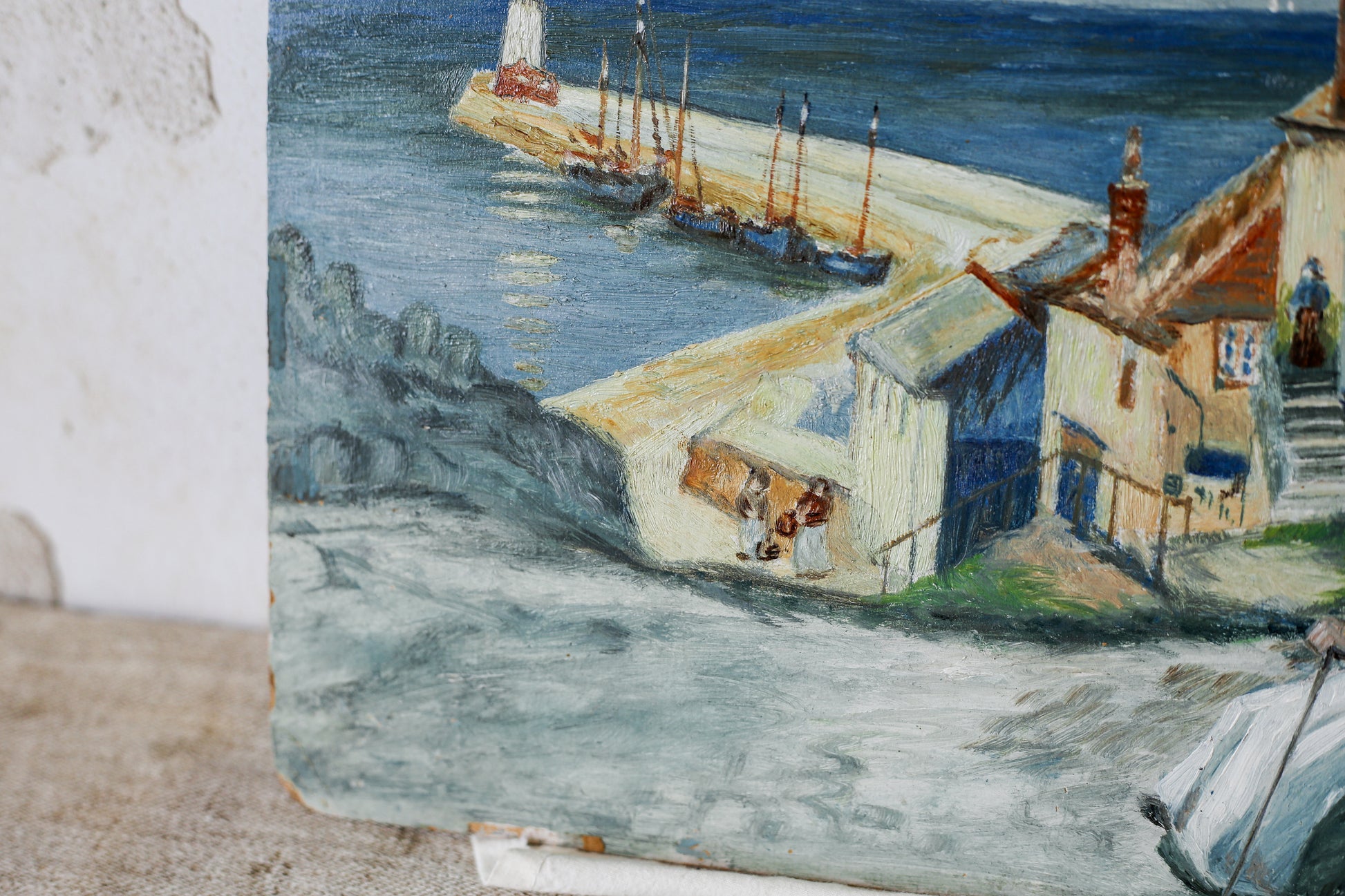 Available is an original oil painting of a fishing village, with stone cottages leading down to a quay with a lighthouse at the end. In the foreground are two women, wrapped in shawls and gazing at the sea. Delightfully naive folk art. Found in England.