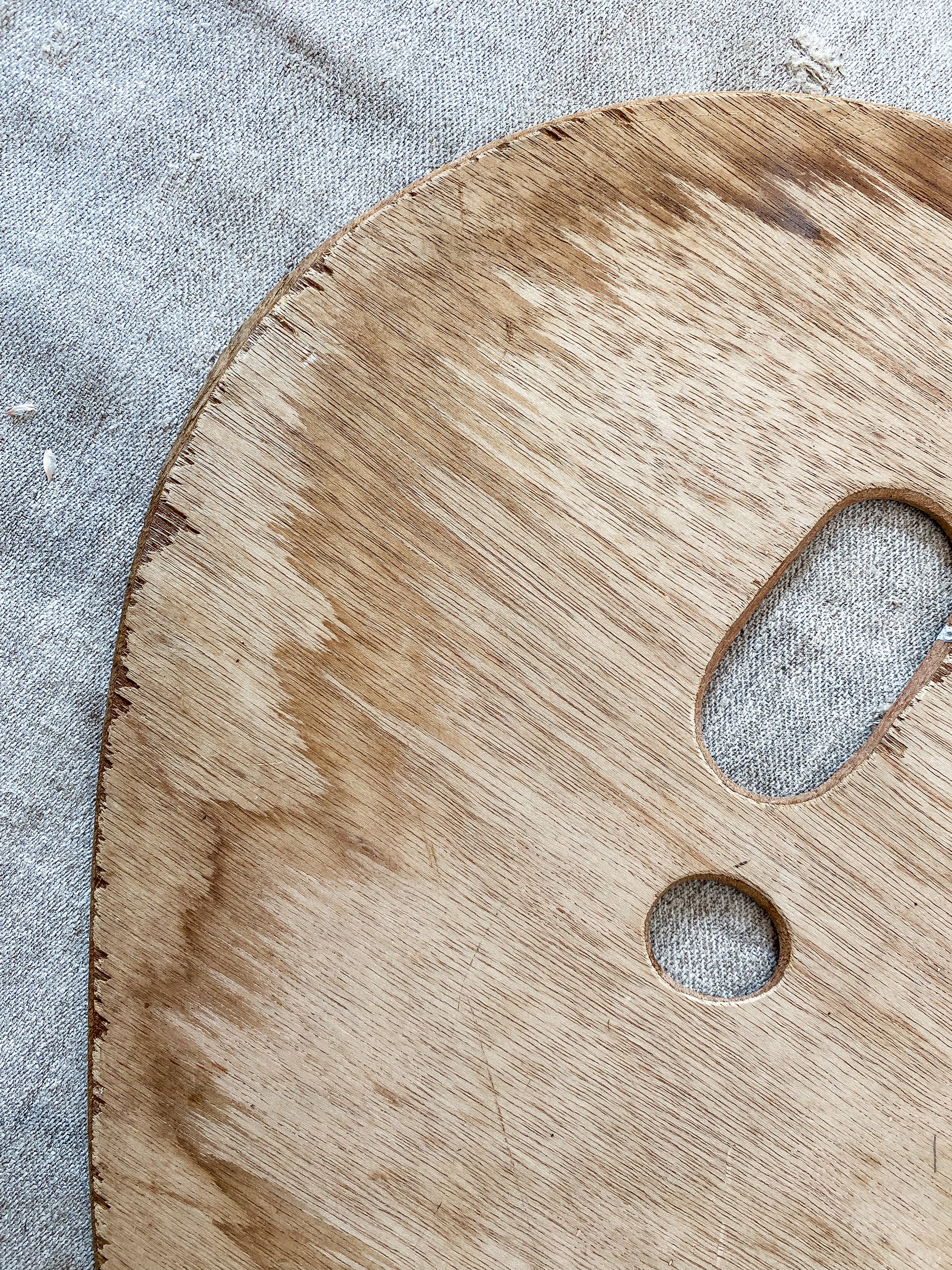 Wood, with some water staining noted around the edges. Large thumb hole near top. Dried oil paint on the board.