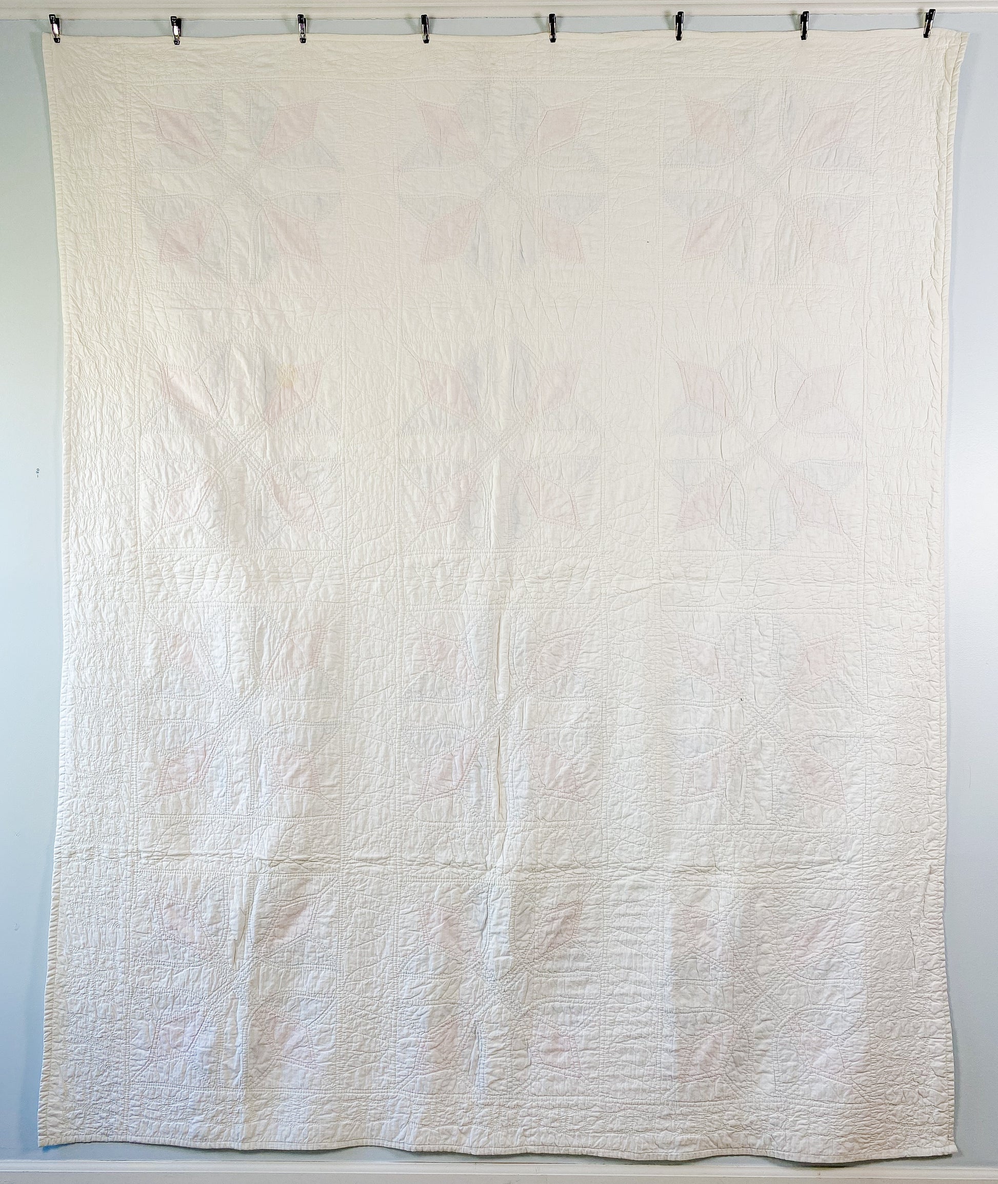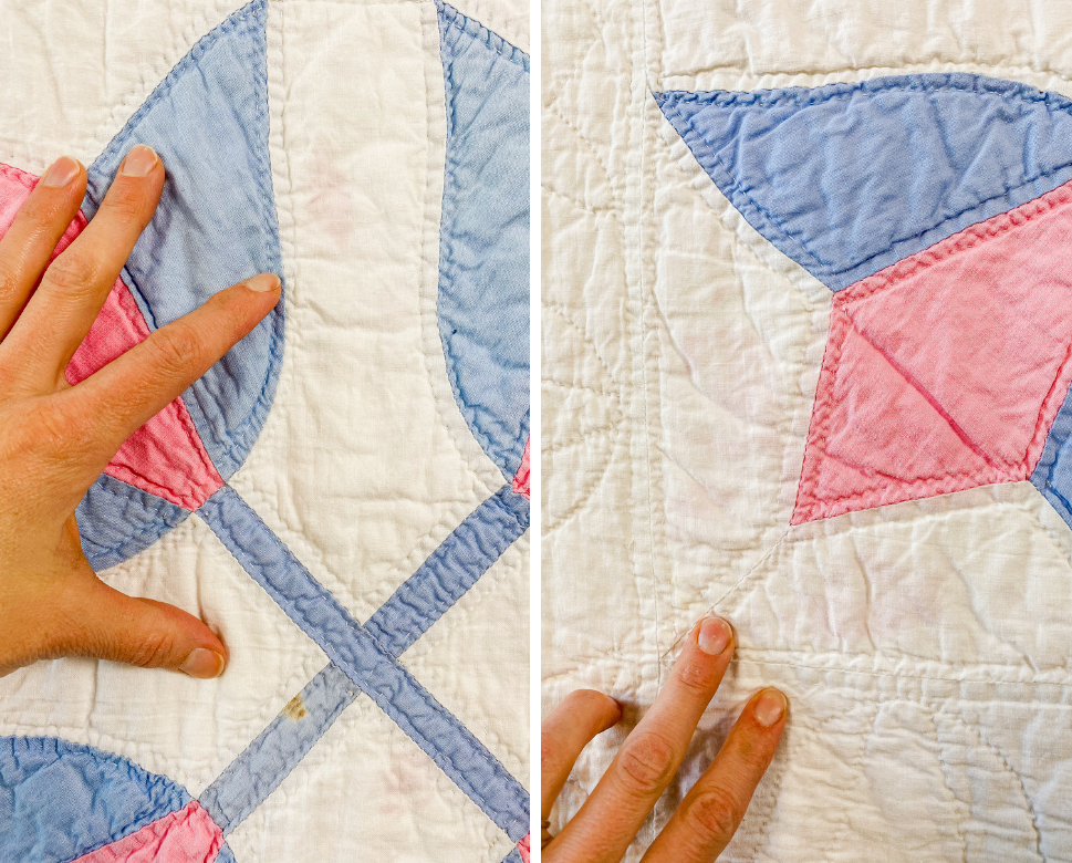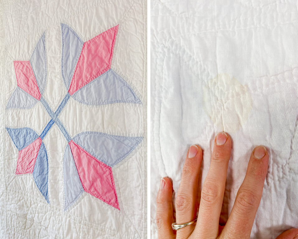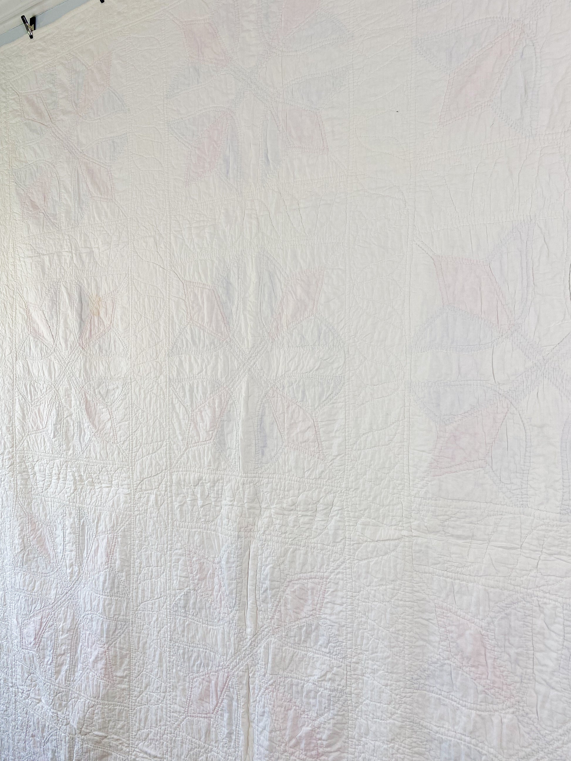 Very good vintage condition. Light fading in some of the blue fabrics. There are a few spots of light color transfer from the blue fabrics to the white; thus, quilt was not washed. Free of odors. Light yellow spot to back. One small brown mark to lower right block on front. Otherwise no major damage. Please review all photos.