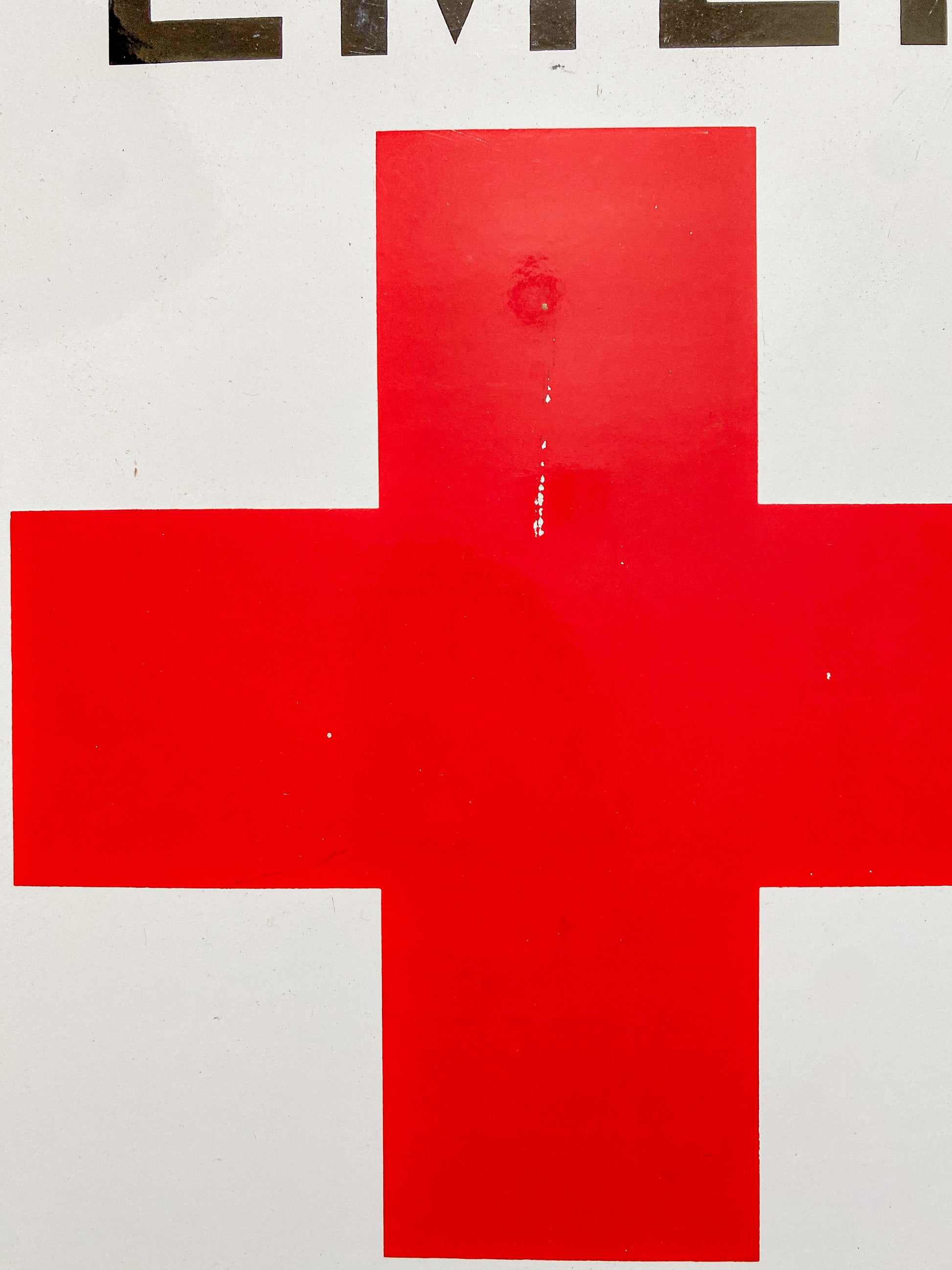 The sign is large and heavy, with black letters on white reading “American Red Cross Emergency Aid Here”, with the Red Cross symbol.
